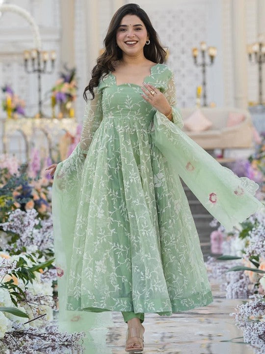 Vama Heritage Floral Embroidered Regular Thread Work Organza Kurta With Trousers & Dupatta