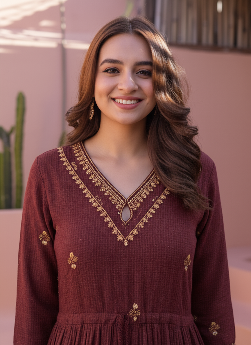 Viscose Floral Anarkali Wine Dress
