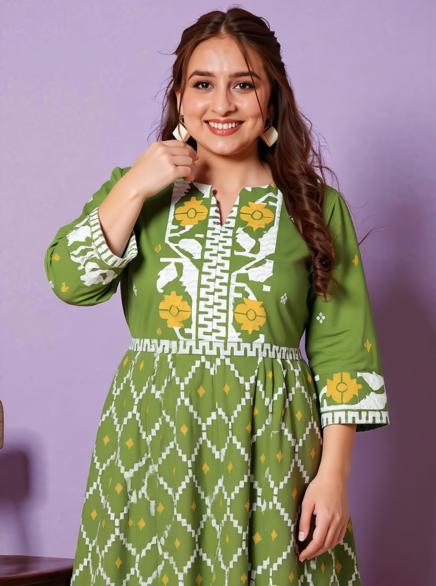 Soft Cotton Geometric Flared Green Dress