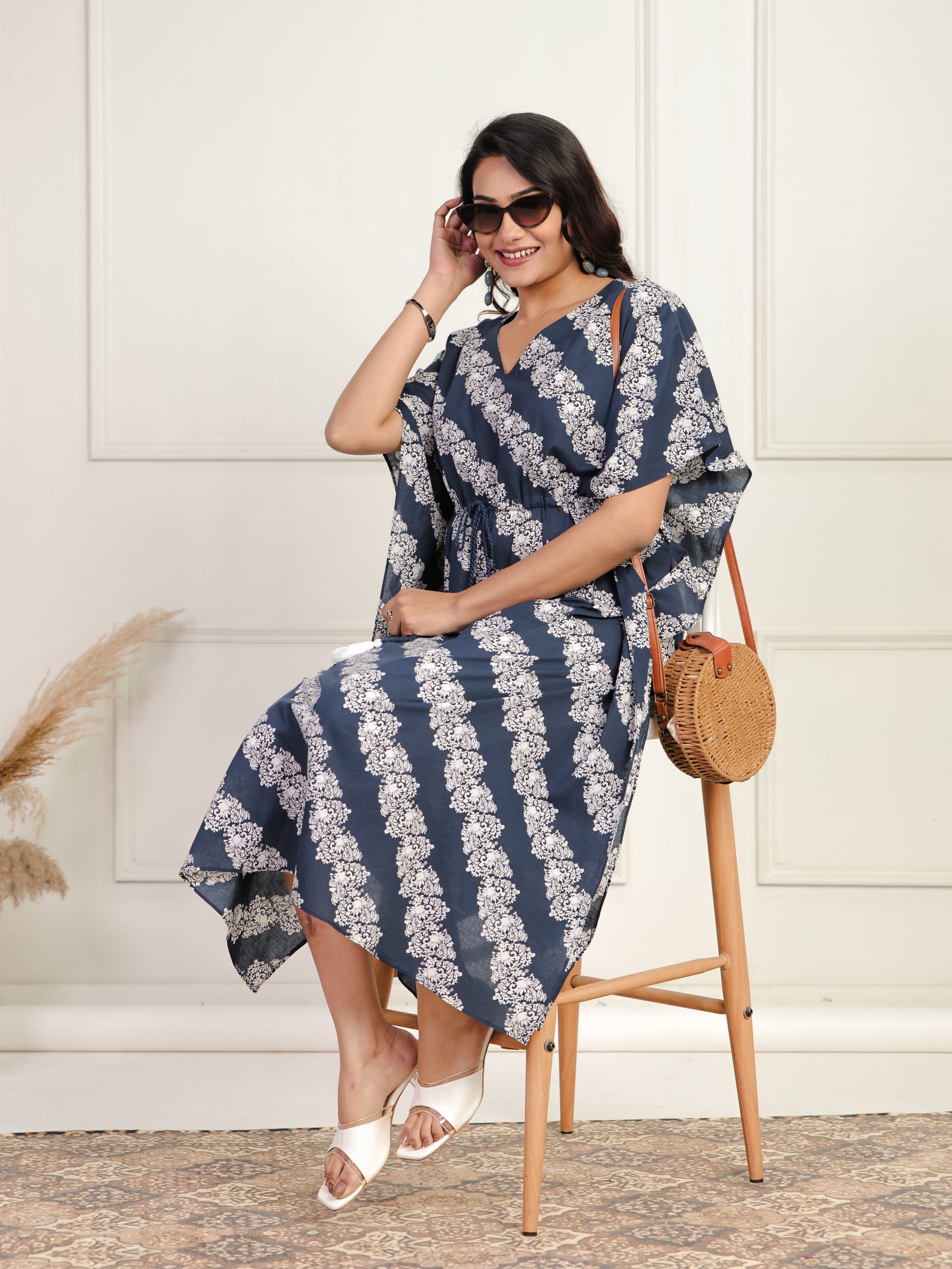 This Blue Kaftan kurta in soft Soft Cotton is a timeless pick for festive and casual wear. Designed with a V neckline and sleeves, its graceful cut flatters all body types. The delicate Floral detailing adds a touch of sophistication. Pair it with statement earrings and juttis for a polished look. Maintain its pristine look by following proper care instructions.