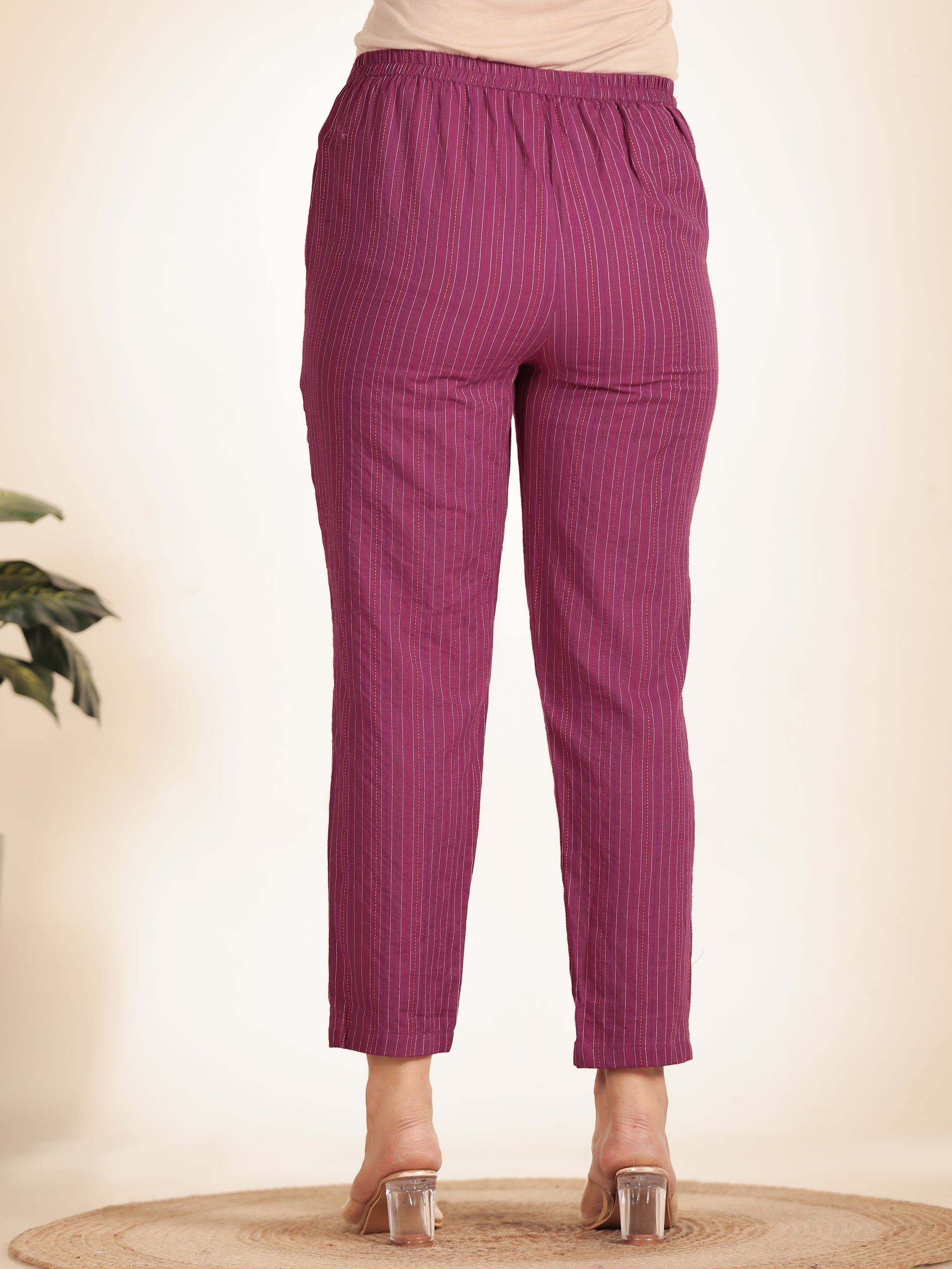 These Pink trouser crafted from breathable Kantha Cotton combine comfort and style. The Woven Design pattern adds a modern twist, while pockets make them practical for daily wear. Ideal for casual outings or workdays, they pair effortlessly with kurtas, tops, or tunics. Keep them looking fresh with minimal care and enjoy their all-day ease.