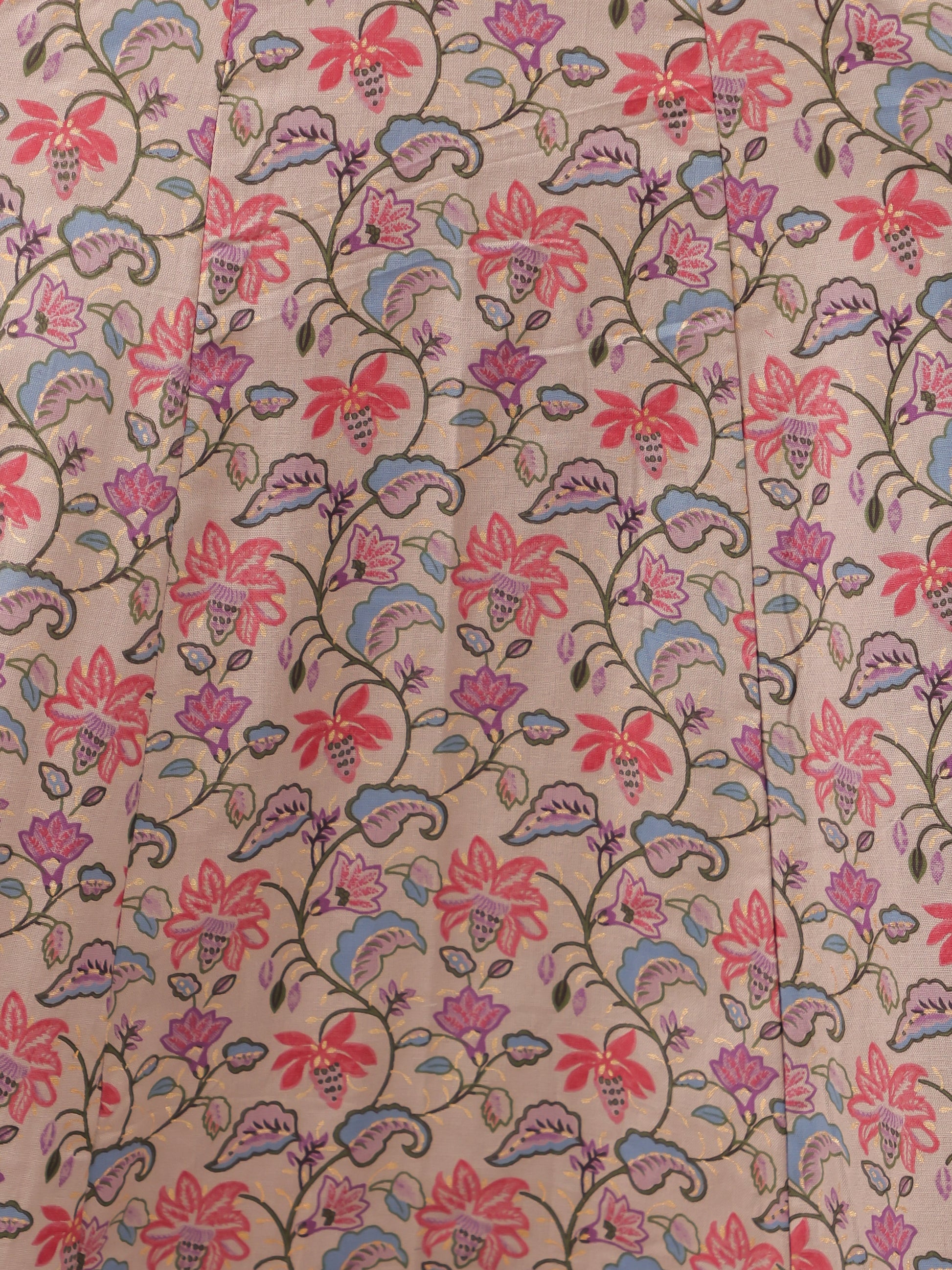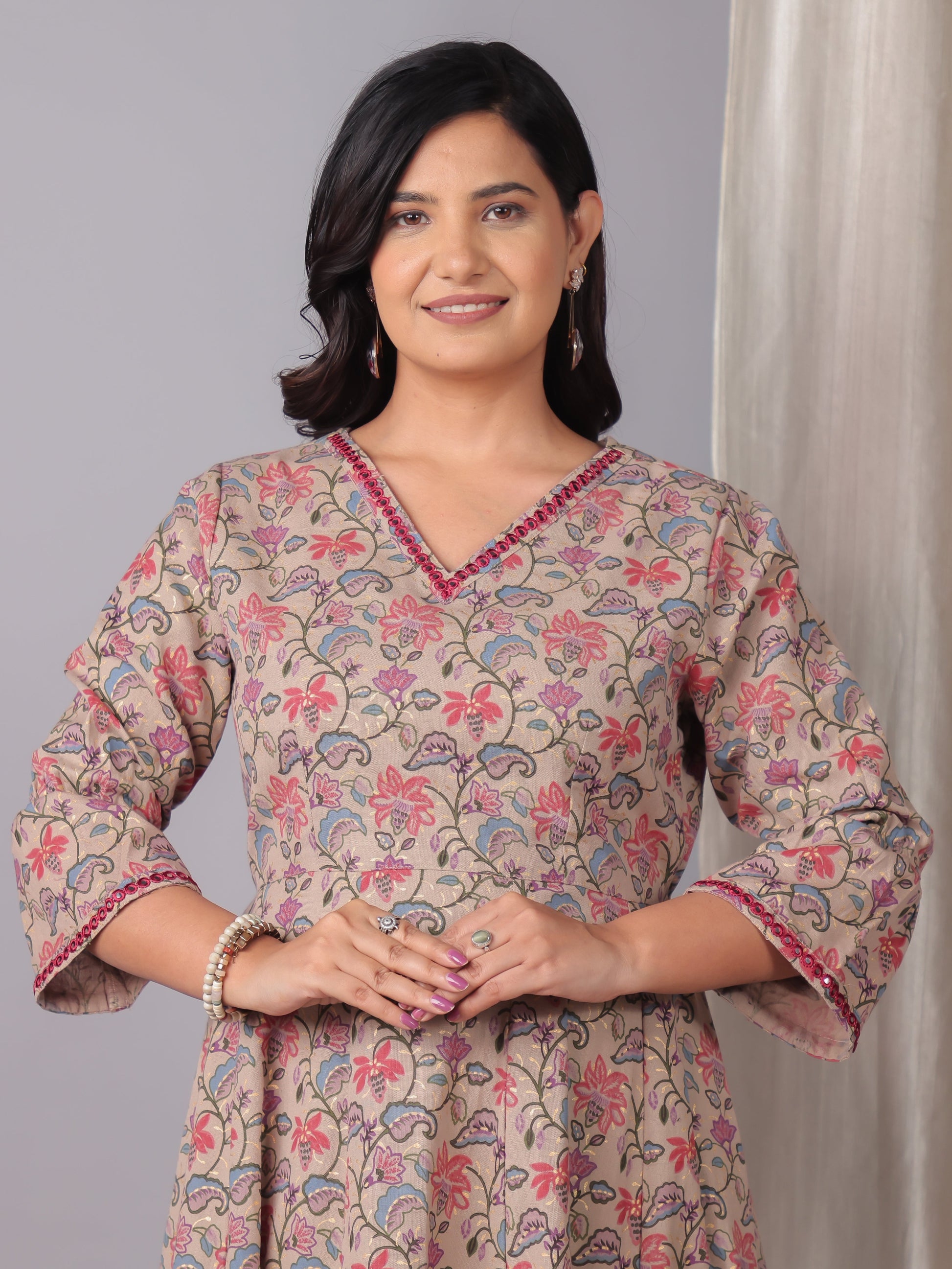 This Beige dress crafted from soft Linen Cotton is designed for comfort and versatility. The Flared cut and Floral patterns add a playful vibe, while work accents make it unique. Perfect for holidays, shopping trips, or relaxed evenings. Style with a sling bag and chic sandals. Care is effortless with simple instructions.