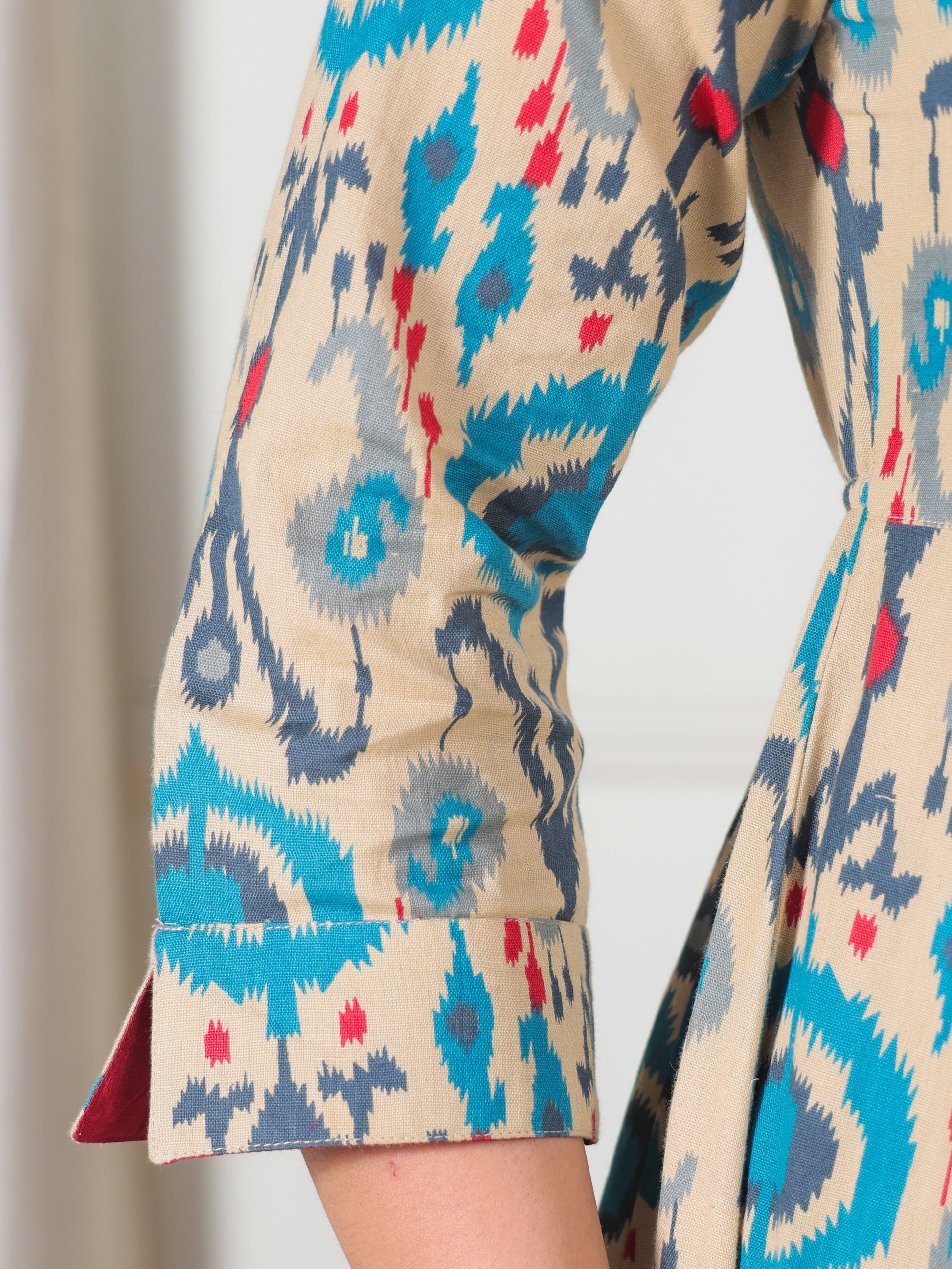 This Beige dress crafted from soft Linen Cotton is designed for comfort and versatility. The Flared cut and Ikat patterns add a playful vibe, while work accents make it unique. Perfect for holidays, shopping trips, or relaxed evenings. Style with a sling bag and chic sandals. Care is effortless with simple instructions.