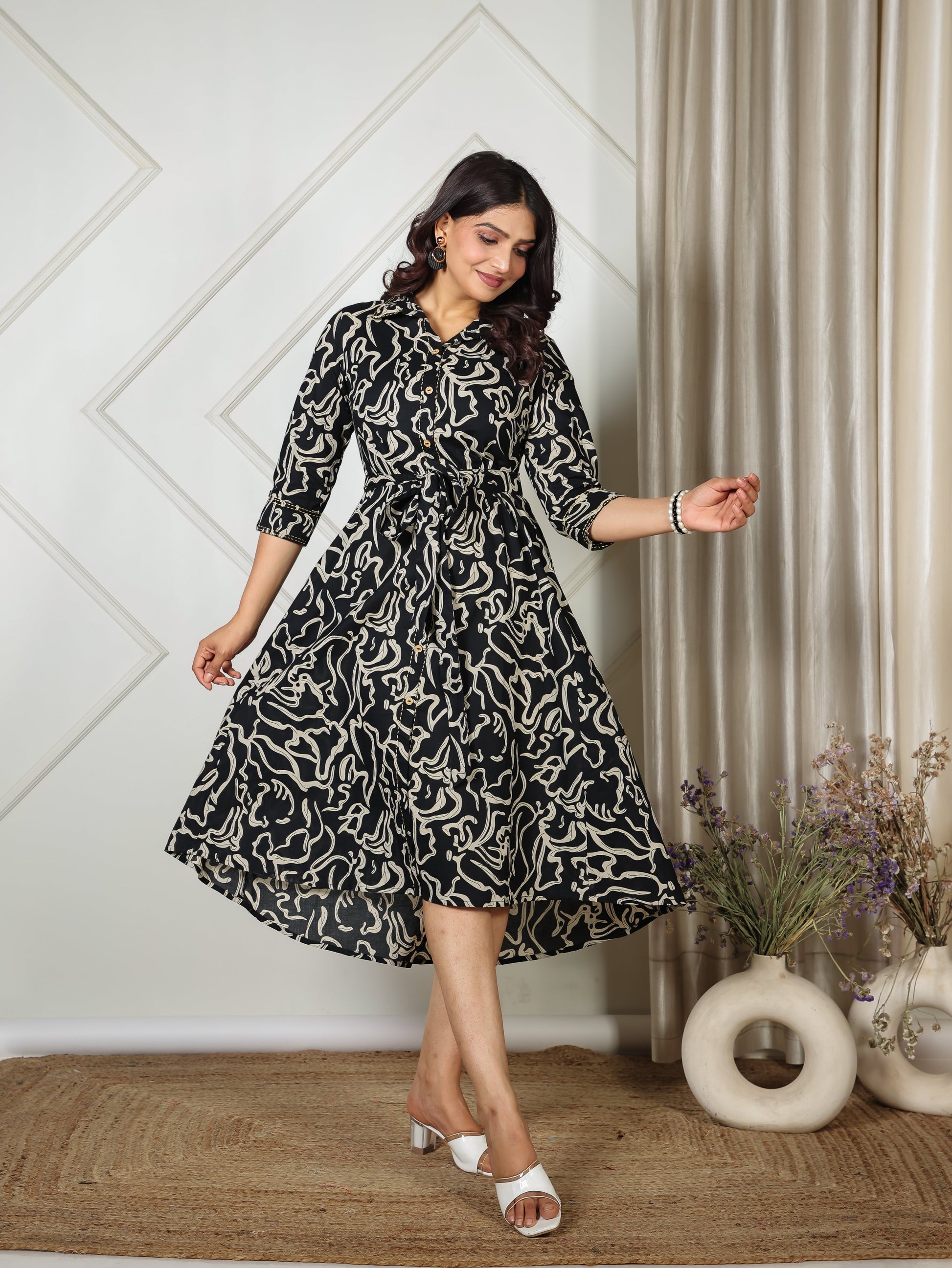Add a stylish staple to your wardrobe with this Flared dress in Black. The breathable Soft Cotton fabric keeps you comfortable all day, while the Abstract motifs and subtle work elements create a sophisticated charm. Dress it up with heels or keep it casual with flats.