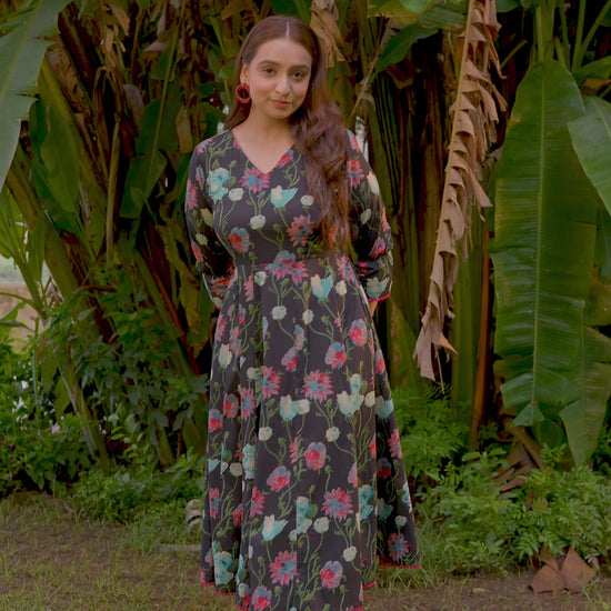 This Black dress crafted from soft Soft Cotton is designed for comfort and versatility. The Flared cut and Floral patterns add a playful vibe, while work accents make it unique. Perfect for holidays, shopping trips, or relaxed evenings. Style with a sling bag and chic sandals. Care is effortless with simple instructions.