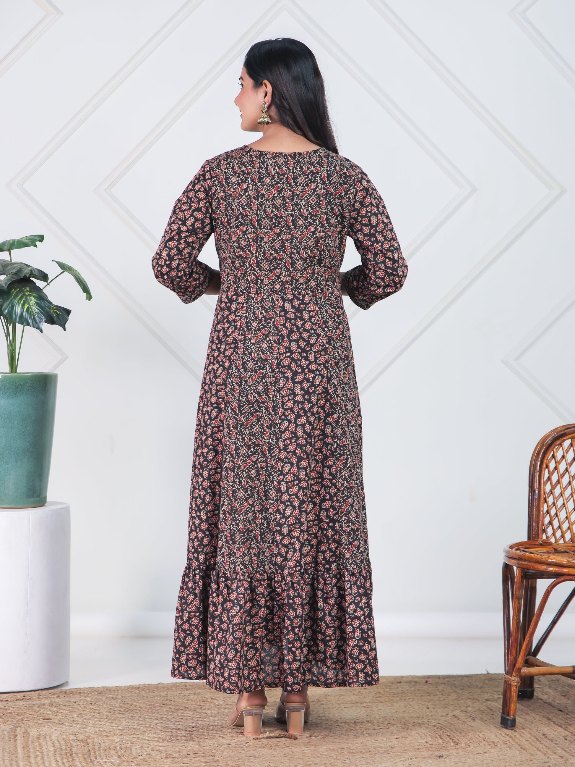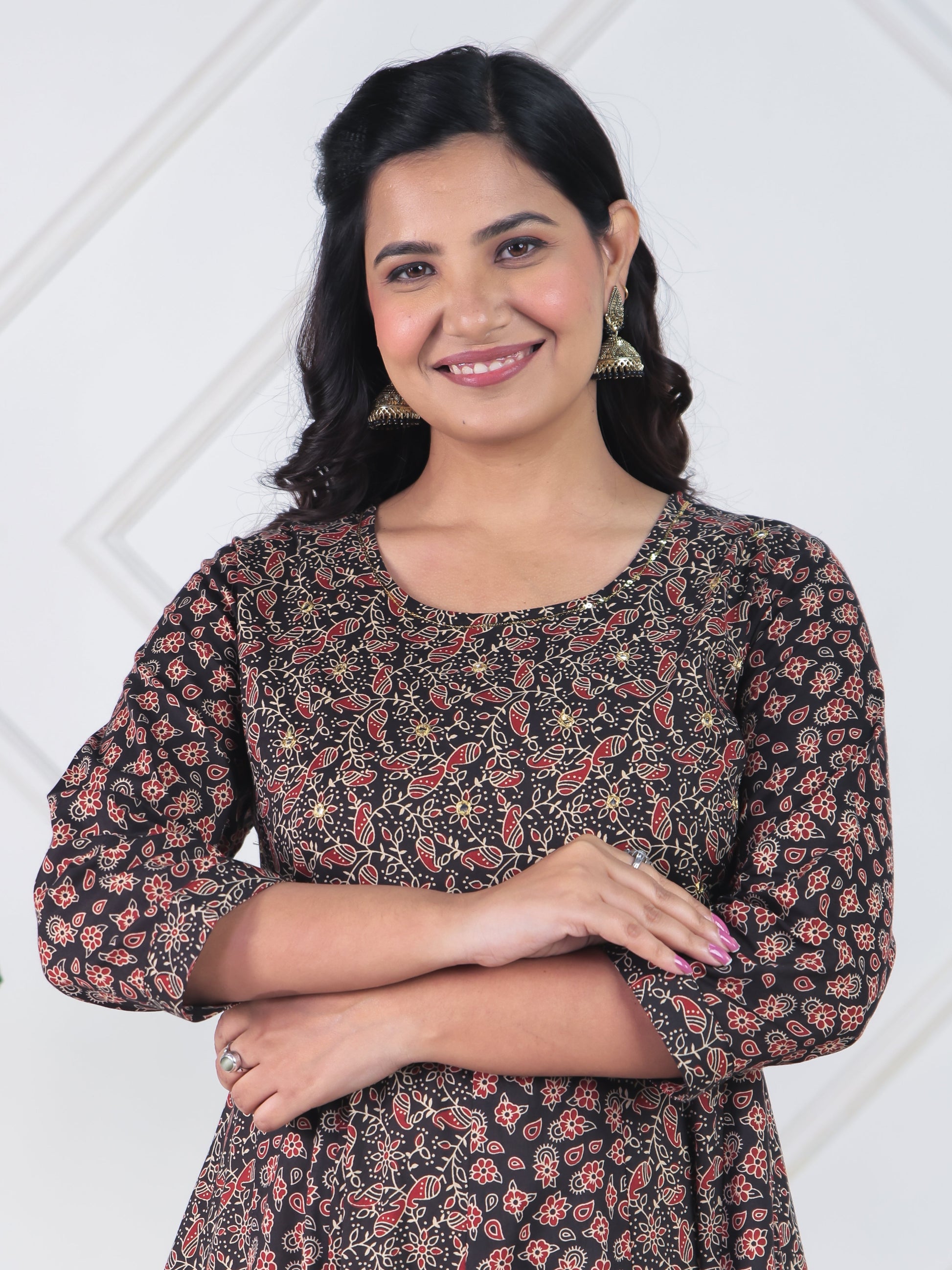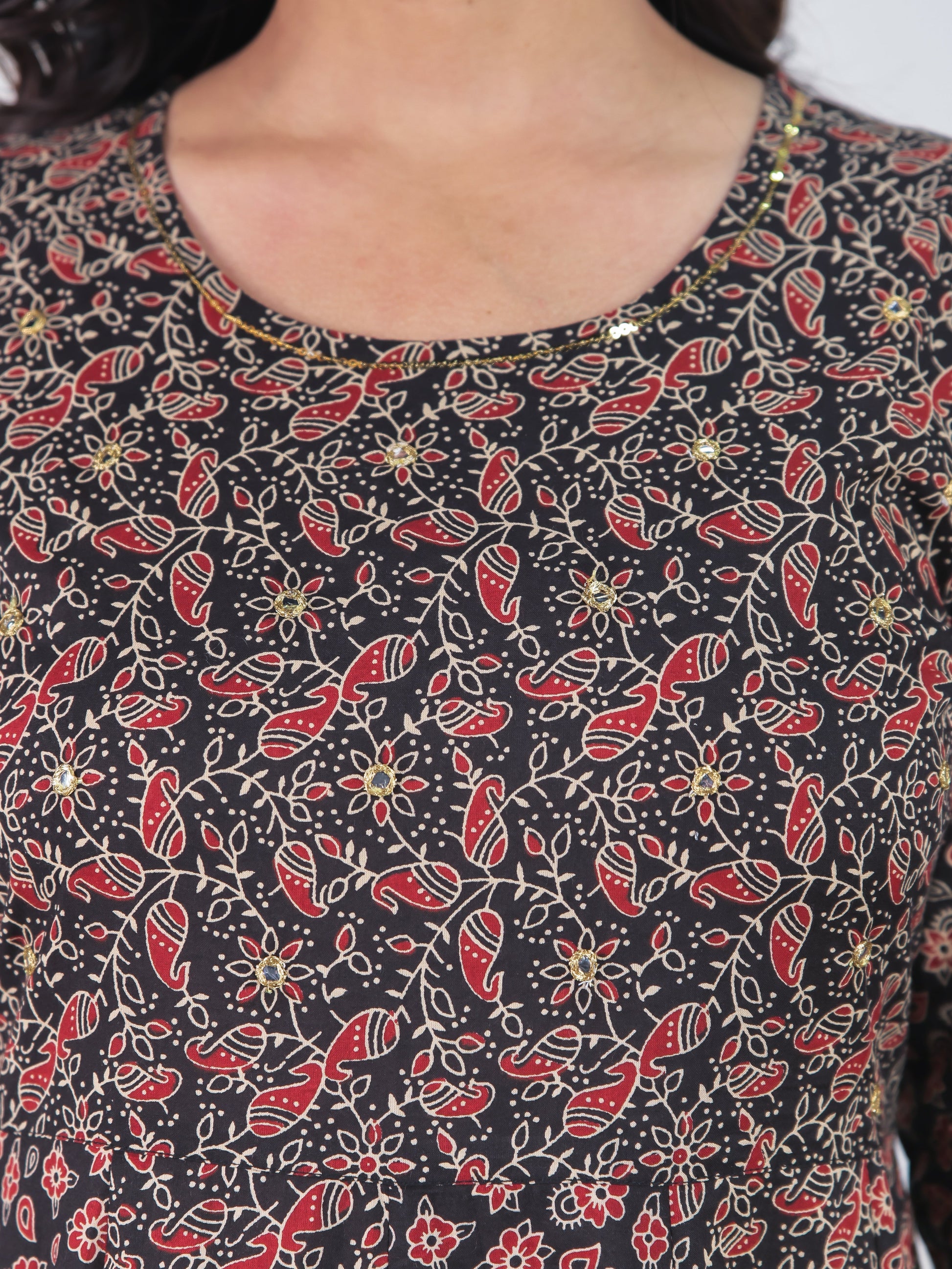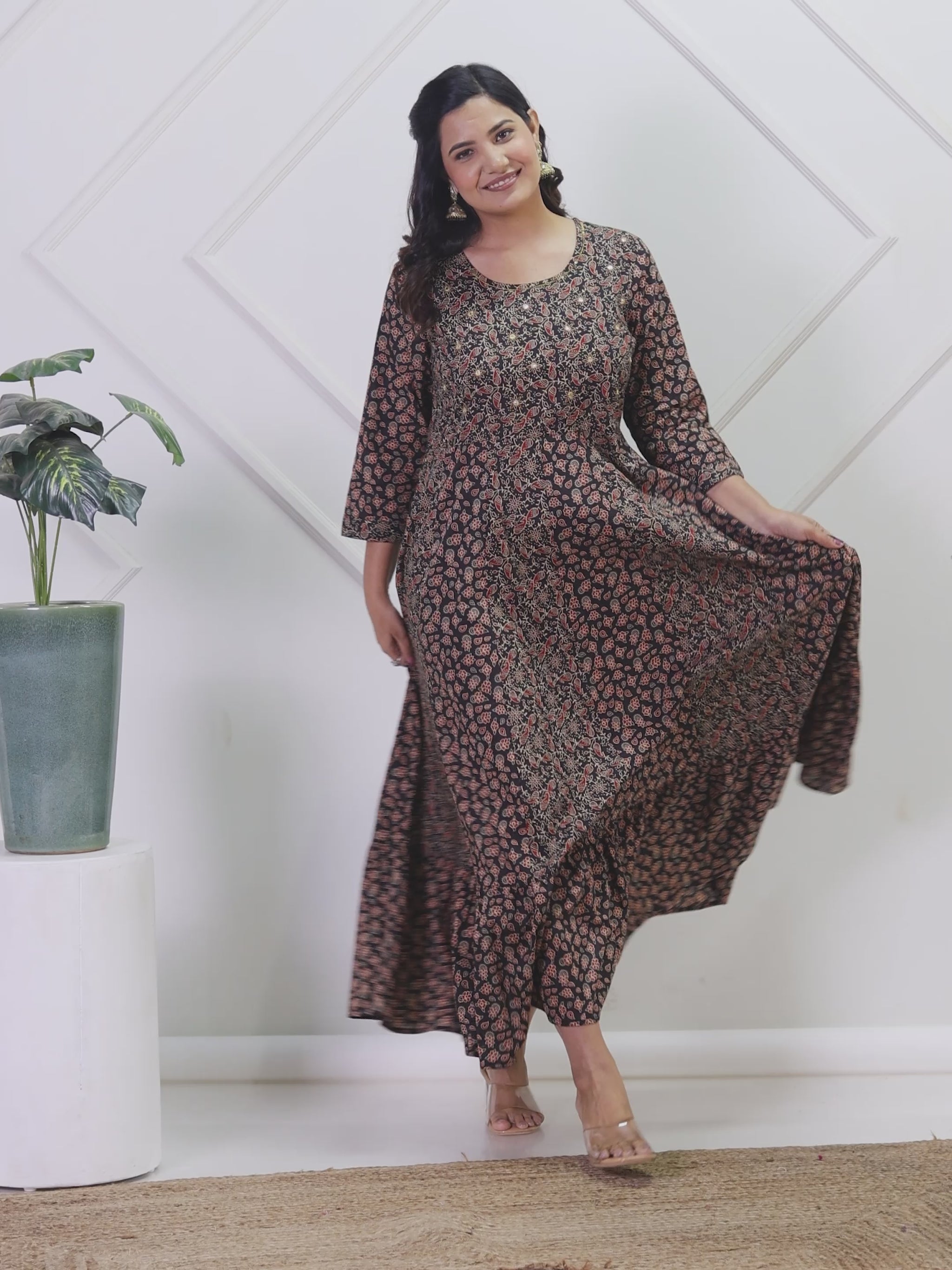 Make a stylish statement with this black anarkali kurta made from premium soft cotton. The beautiful floral pattern complements the elegant round neckline. Adorned with intricate mirror -sequin work that showcases fine craftsmanship. The traditional anarkali flare creates a regal, dramatic silhouette perfect for special occasions. Perfectly tailored with 3/4 sleeve and a ankle length for versatile styling. Perfect for everyday elegance or casual settings, with simple hand wash requirements.