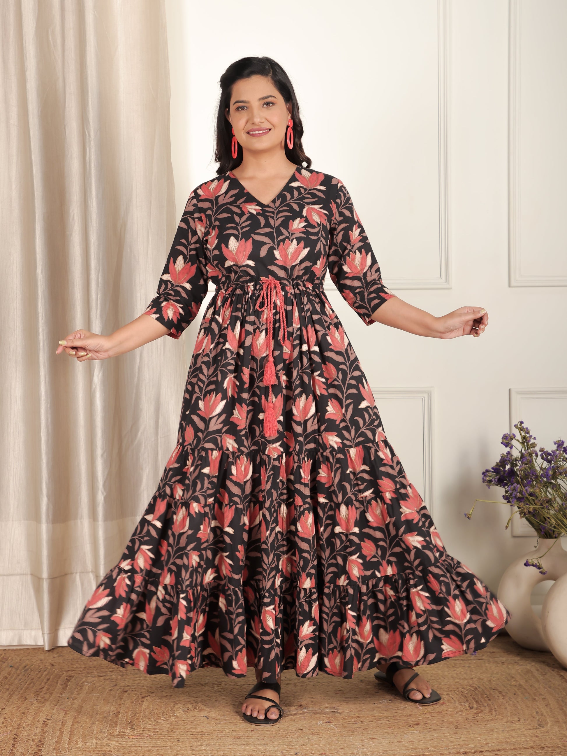 Designed for comfort and confidence, this Soft Cotton dress in Black features a flattering A-line silhouette and unique Floral accents. The work detailing adds sophistication, making it perfect for coffee dates, casual evenings, or weekend brunches. Accessorise with minimal jewellery and flats for a polished finish.