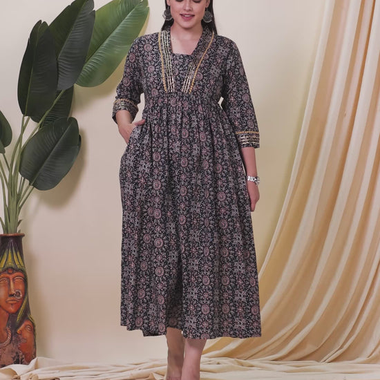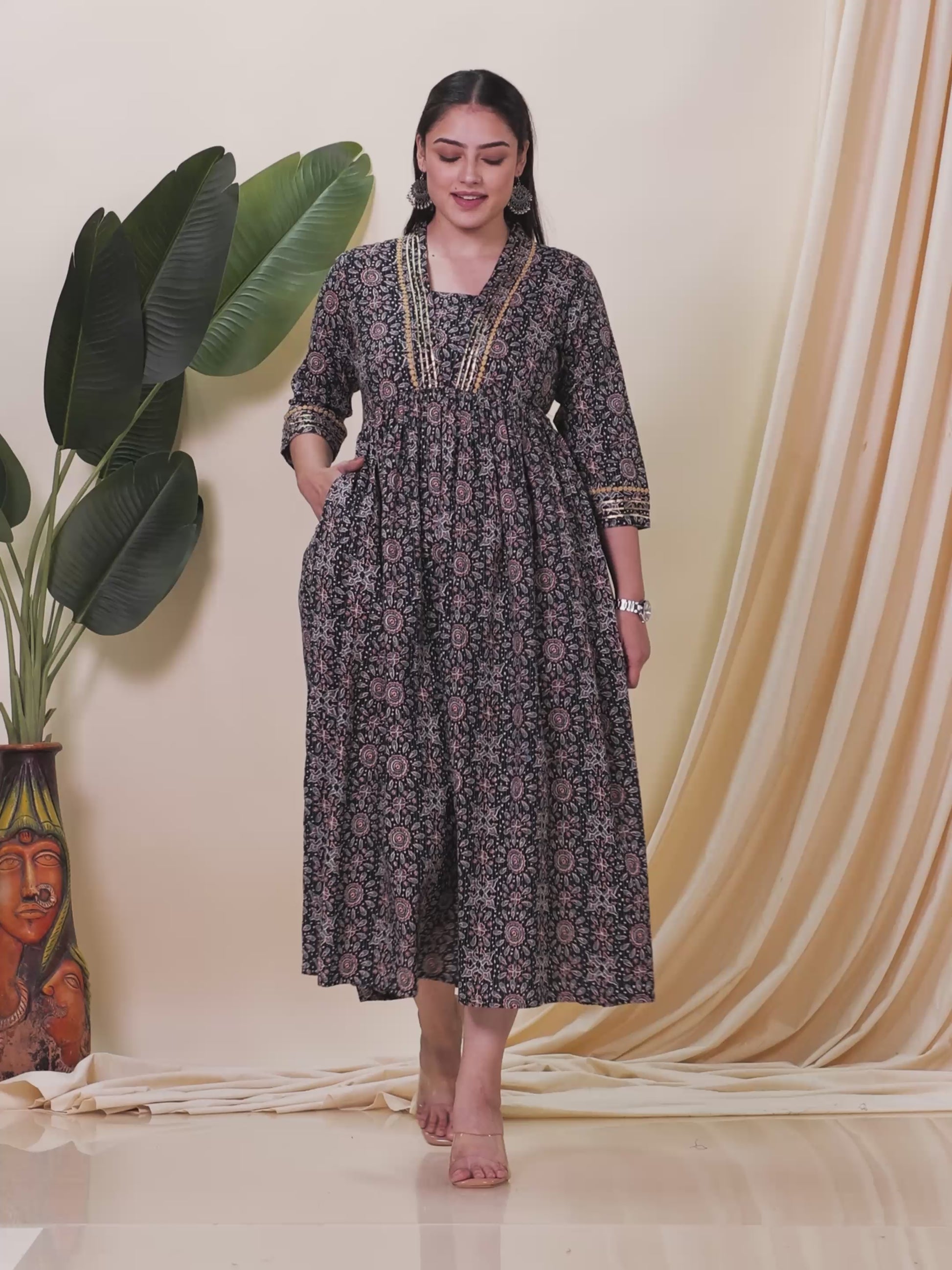 Embroidered Kantha Cotton Geometric Anarkali Black Dress