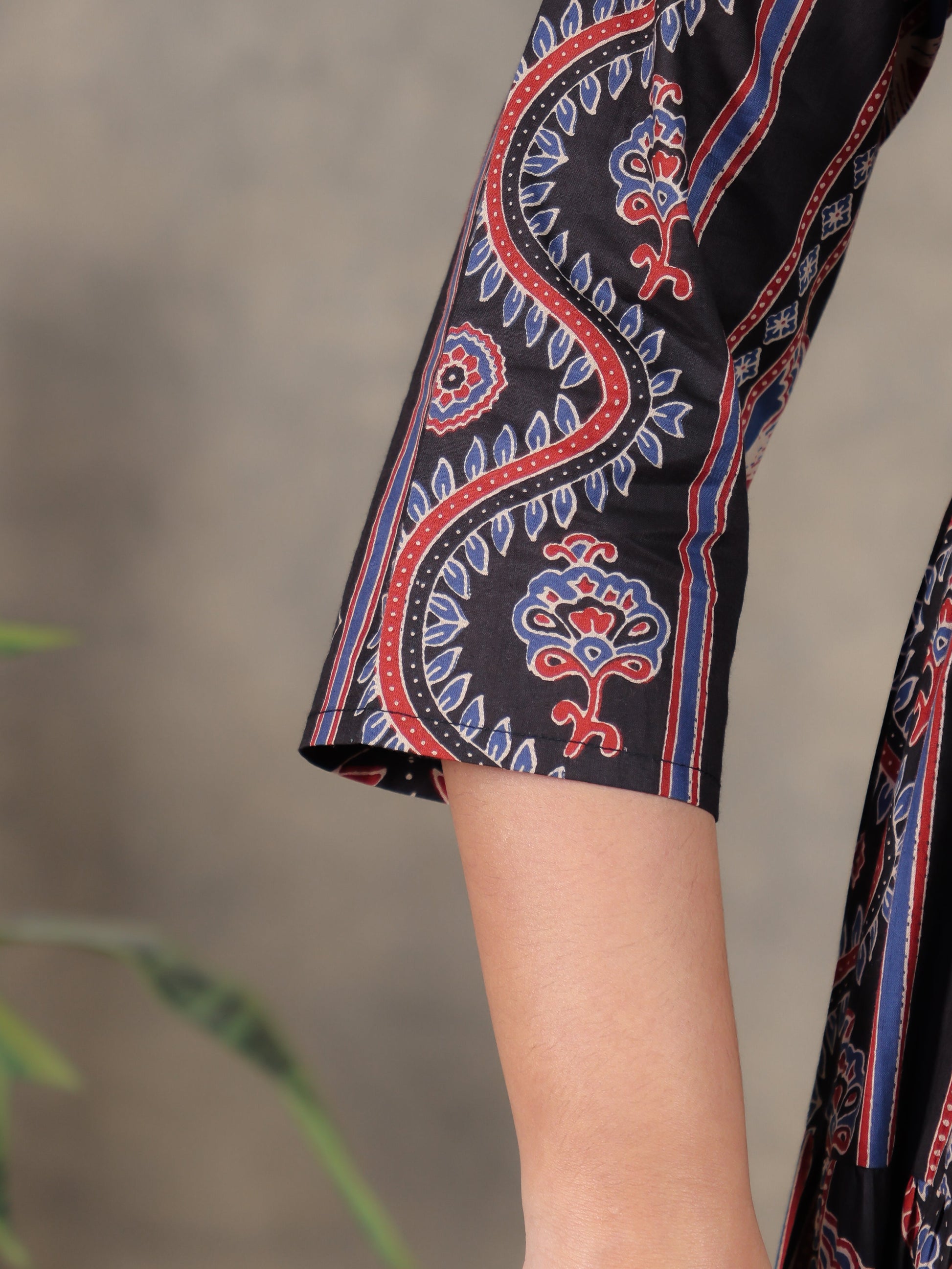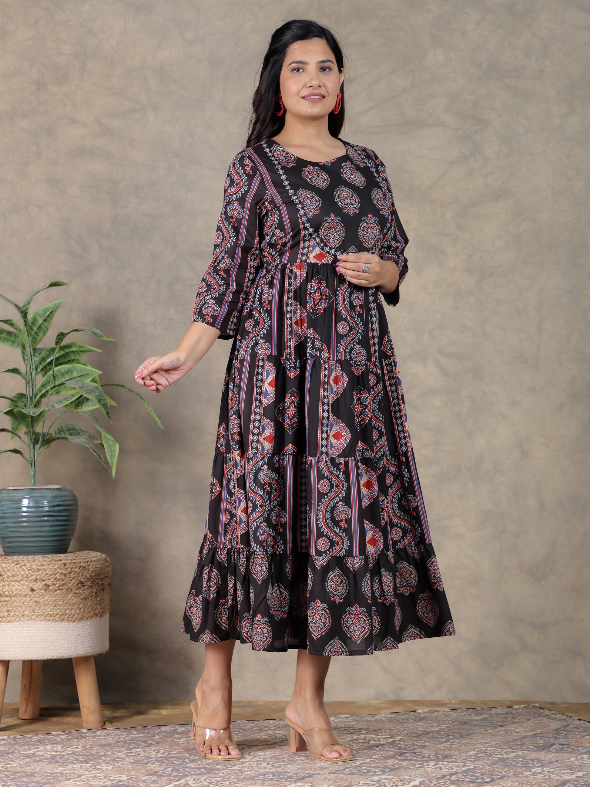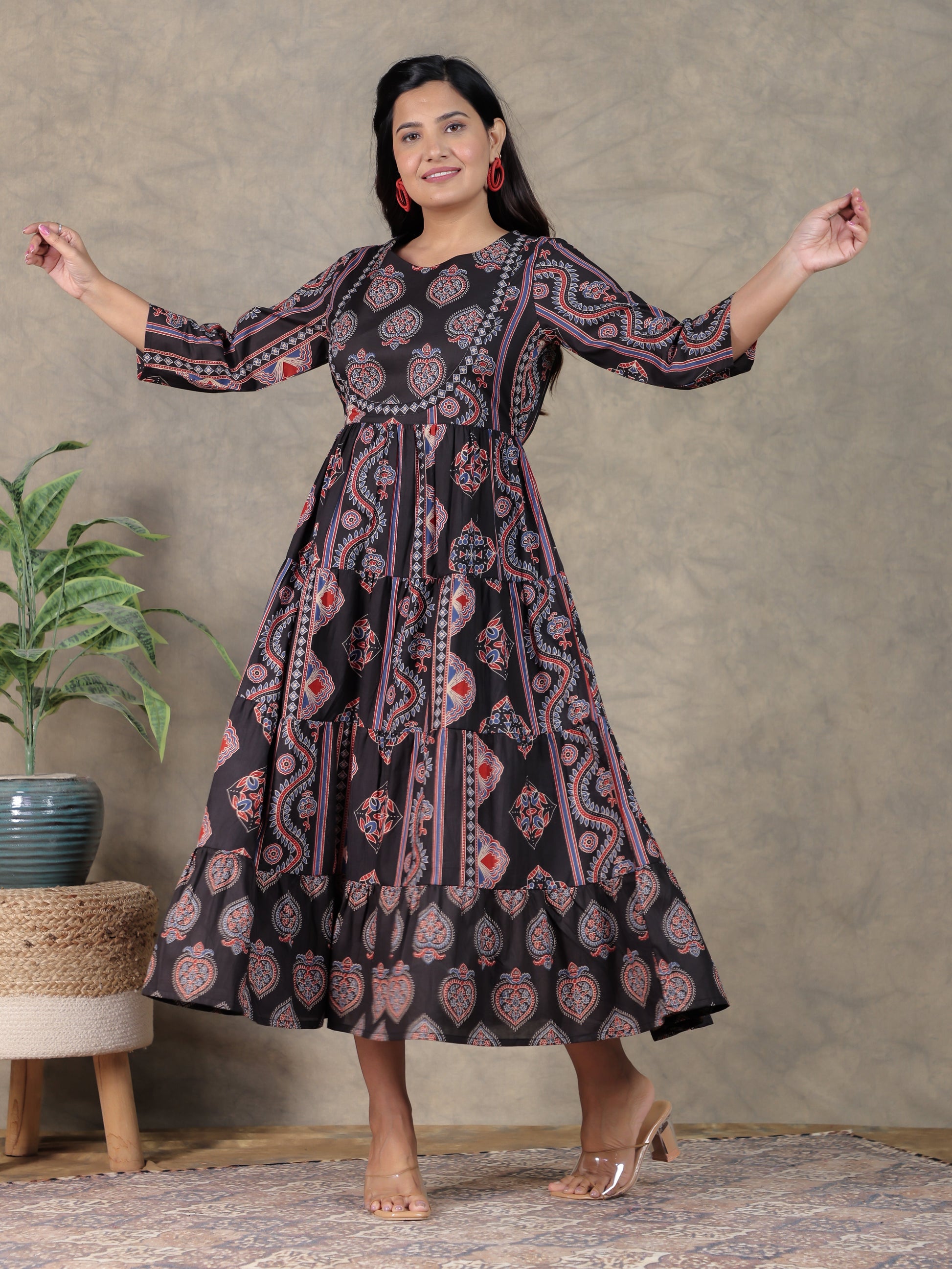 Add a stylish staple to your wardrobe with this Anarkali dress in Black. The breathable Soft Cotton fabric keeps you comfortable all day, while the Geometric motifs and subtle work elements create a sophisticated charm. Dress it up with heels or keep it casual with flats.