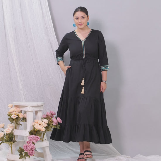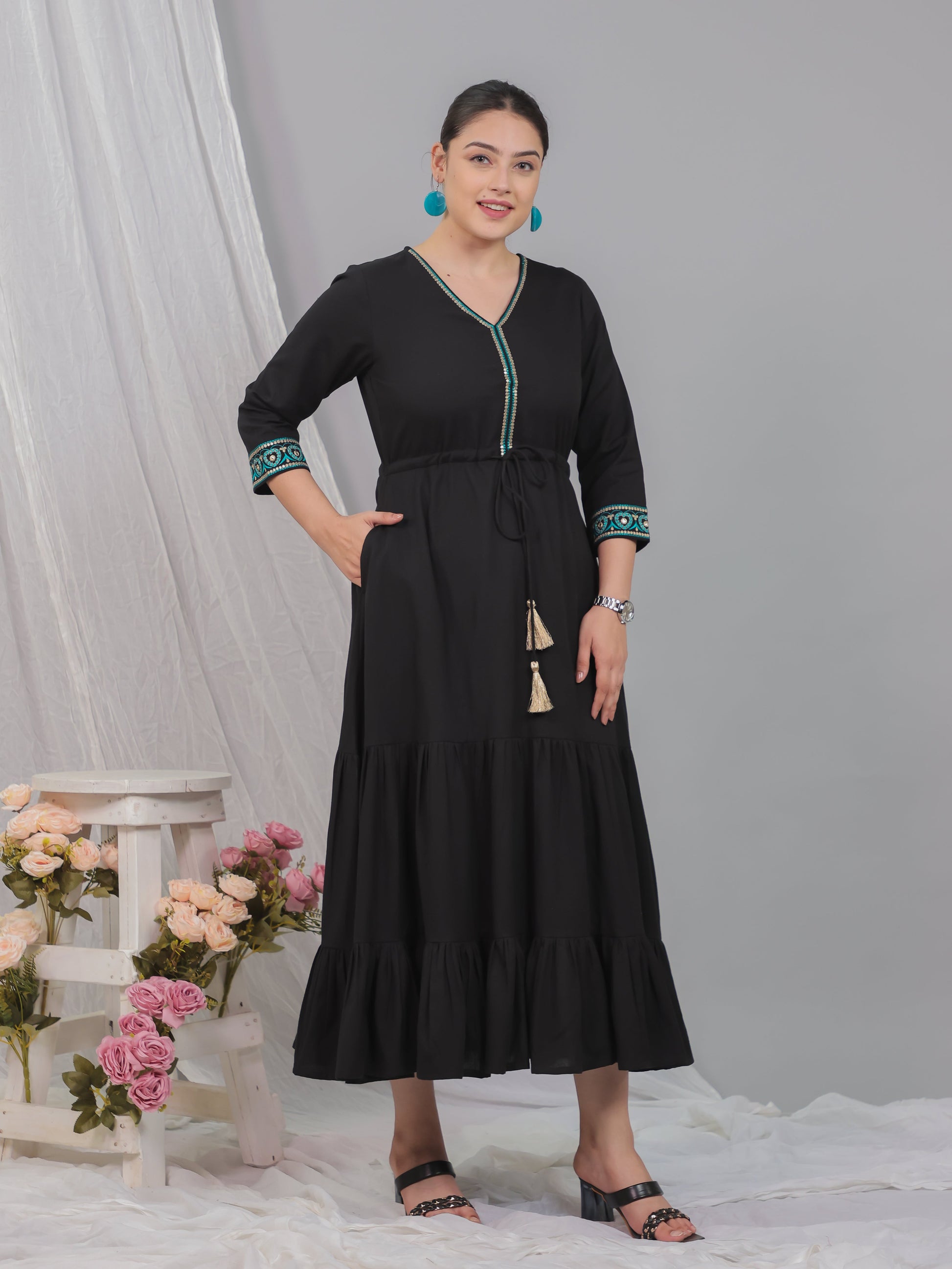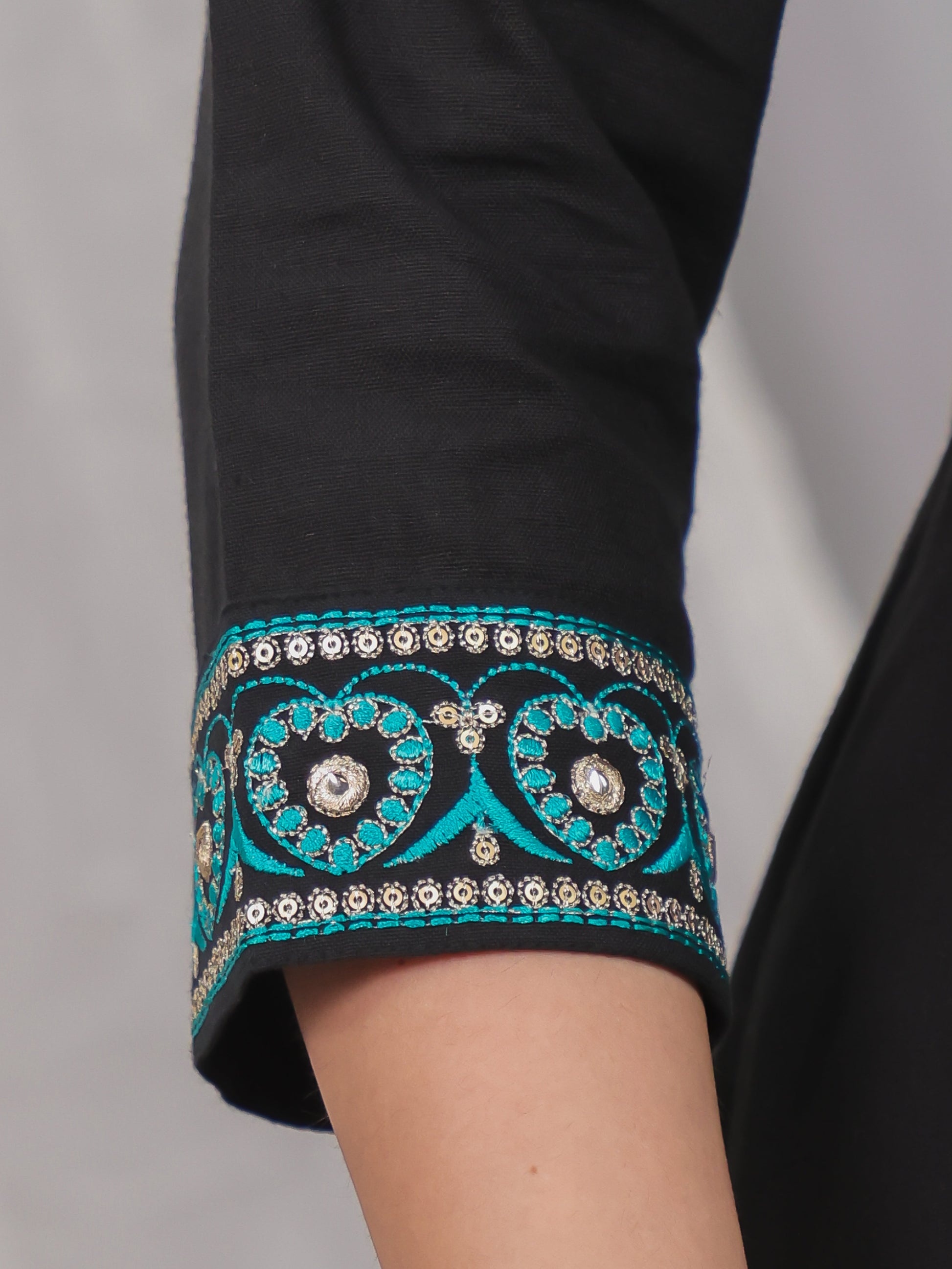 Embroidered Linen Cotton Solid Anarkali Black Dress