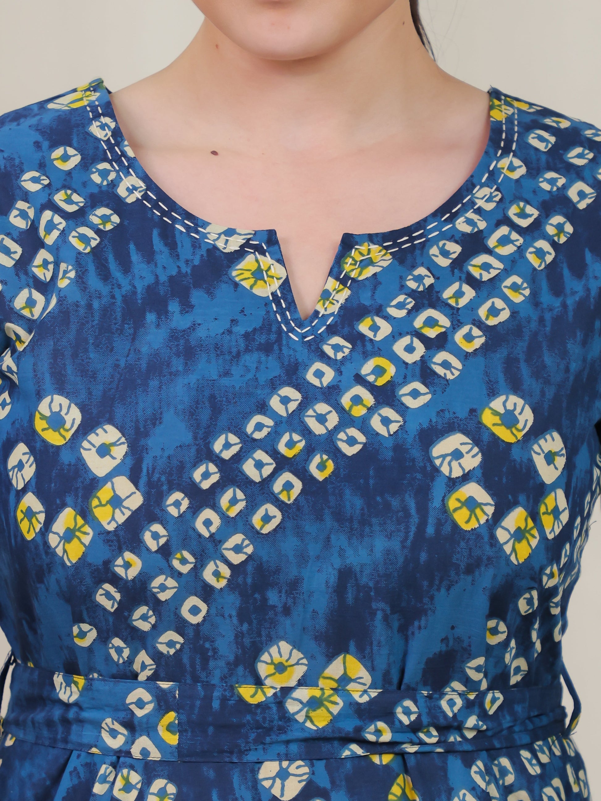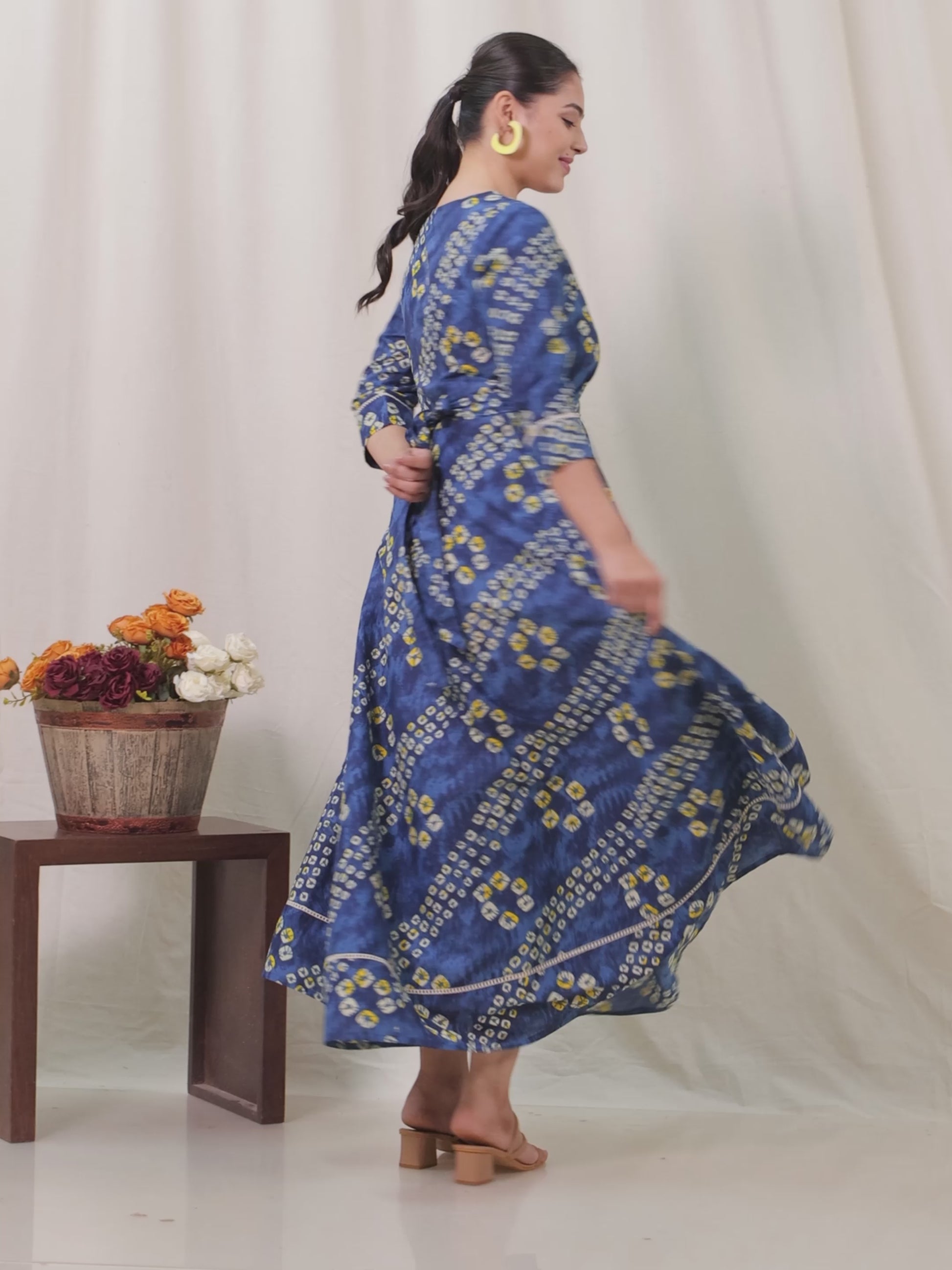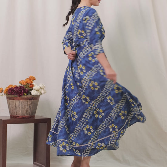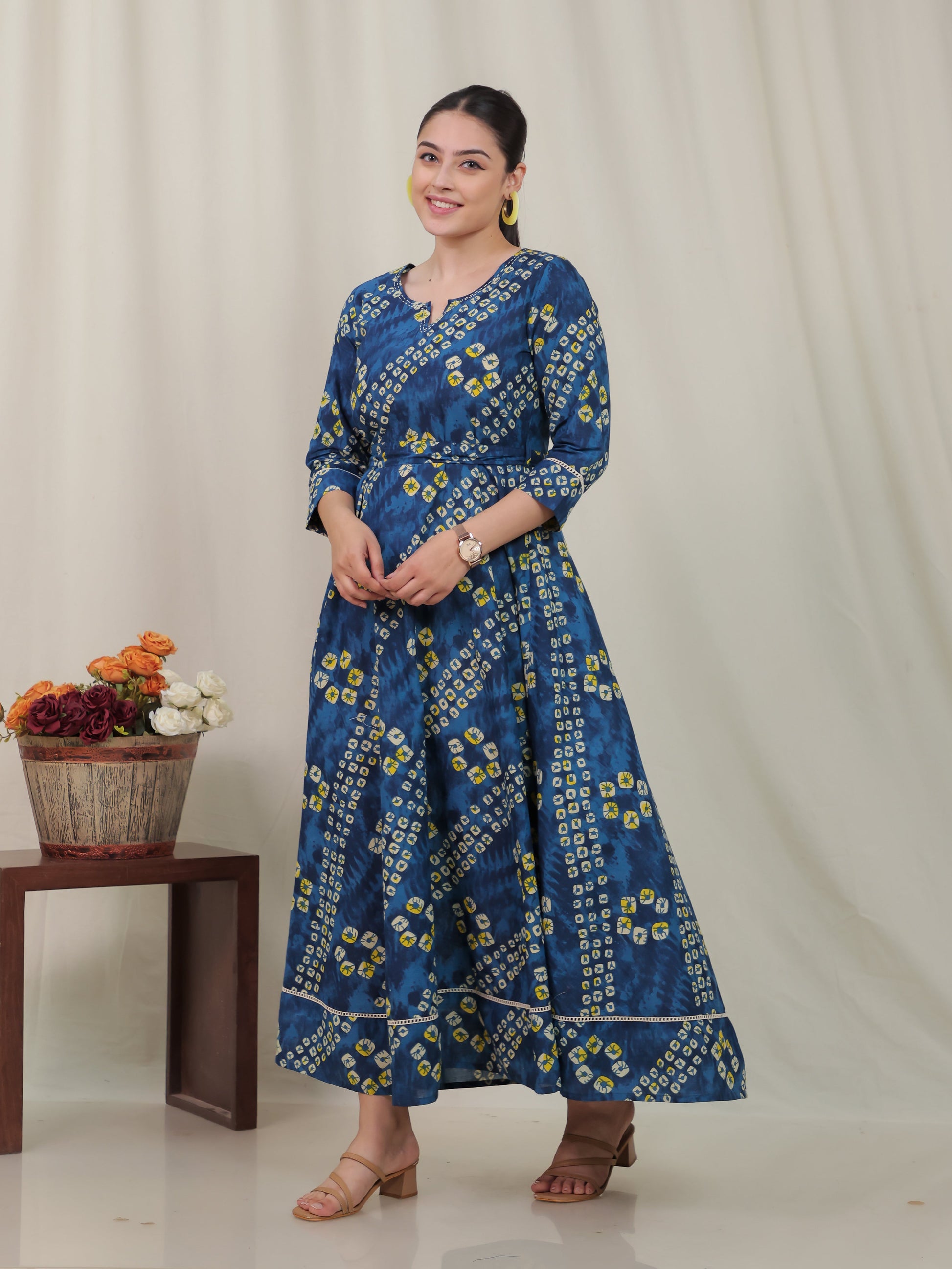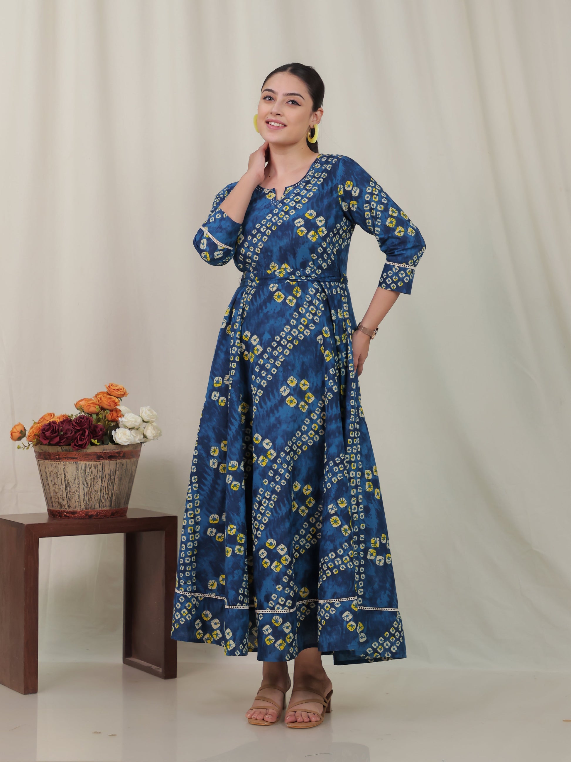 Embroidered Soft Cotton Bandhani Anarkali Blue Dress