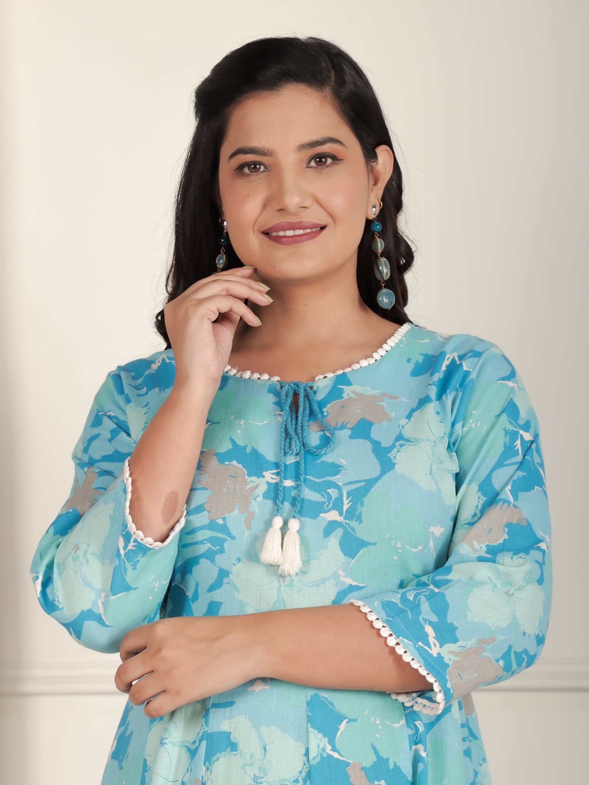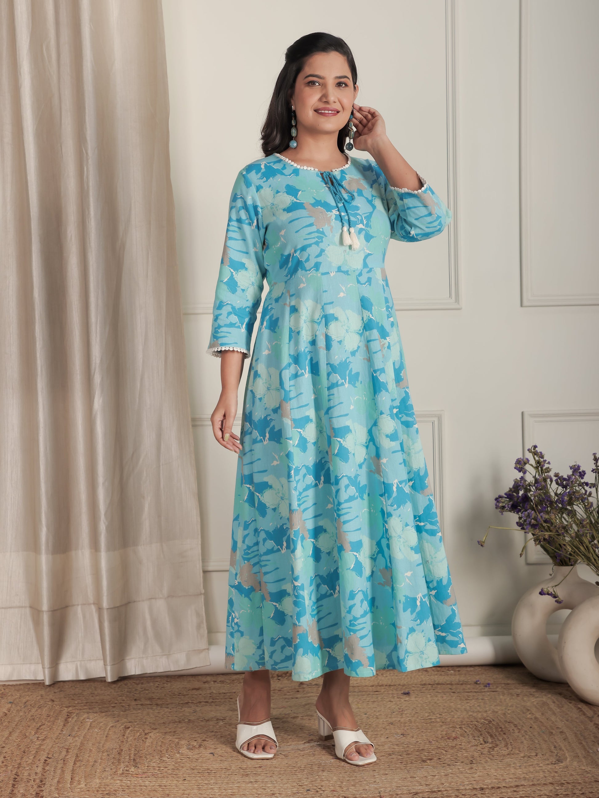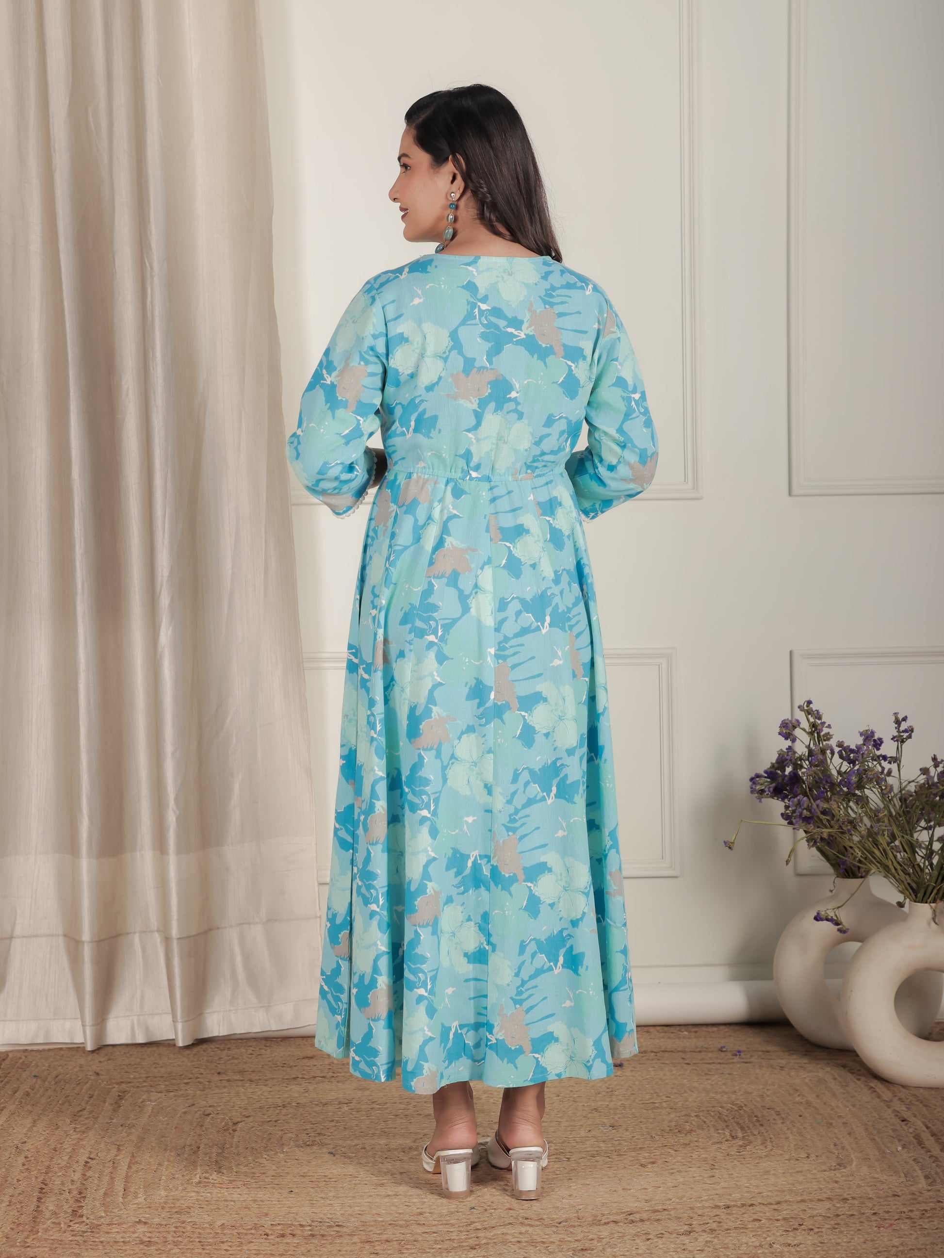 Linen Cotton Floral Flared Blue Dress