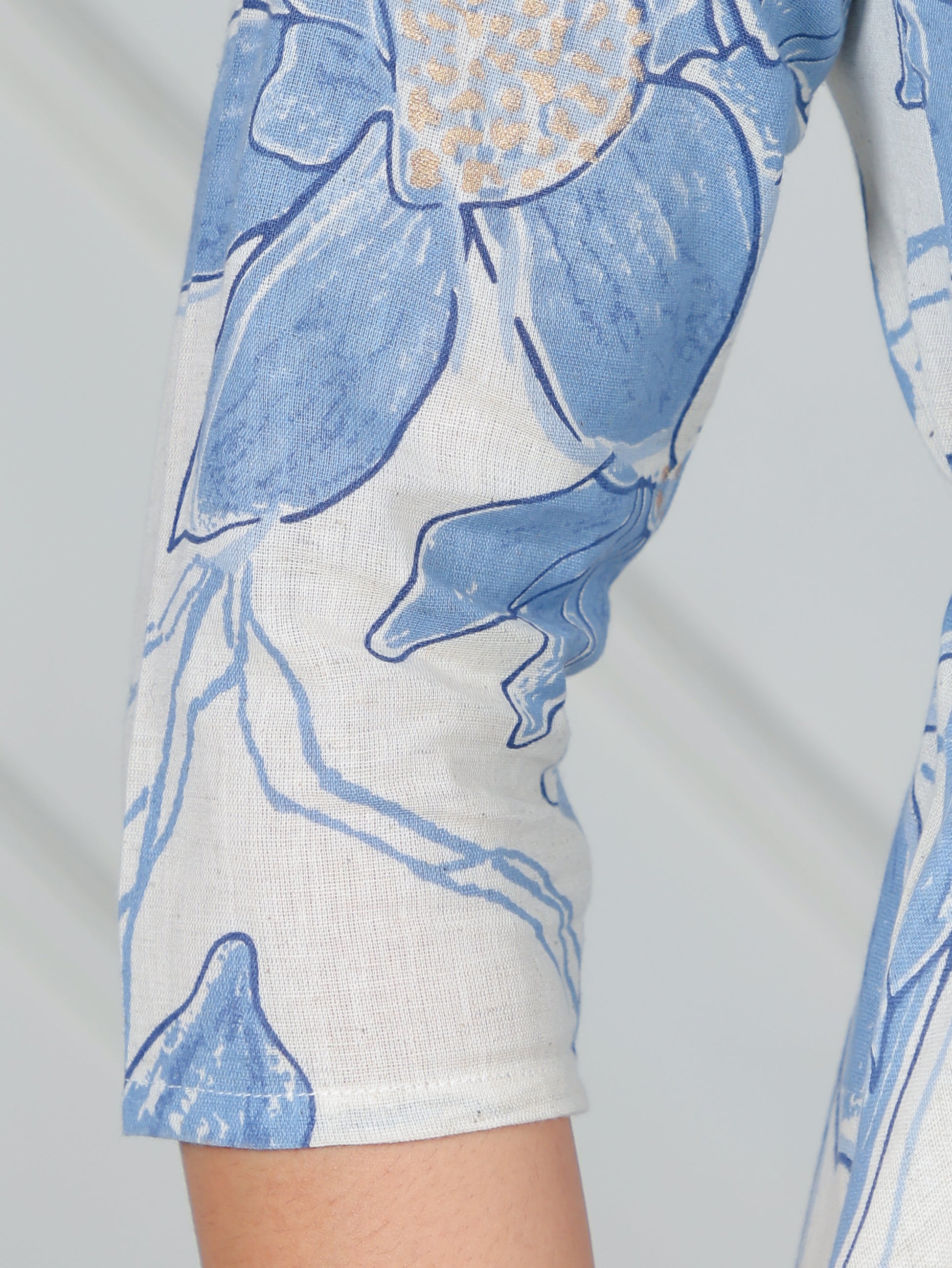 Showcase timeless elegance in this blue anarkali kurta made from premium linen cotton. The beautiful floral pattern complements the elegant round neckline. The traditional anarkali flare creates a regal, dramatic silhouette perfect for special occasions. Perfectly tailored with 3/4 sleeve and a ankle length for versatile styling. Perfect for everyday elegance or casual settings, with simple machine wash requirements.