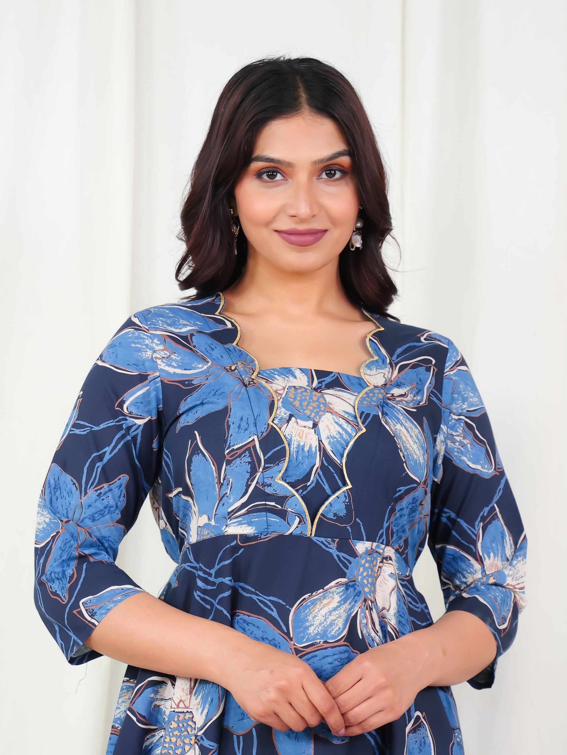 Embroidered Soft Cotton Floral Flared Blue Dress