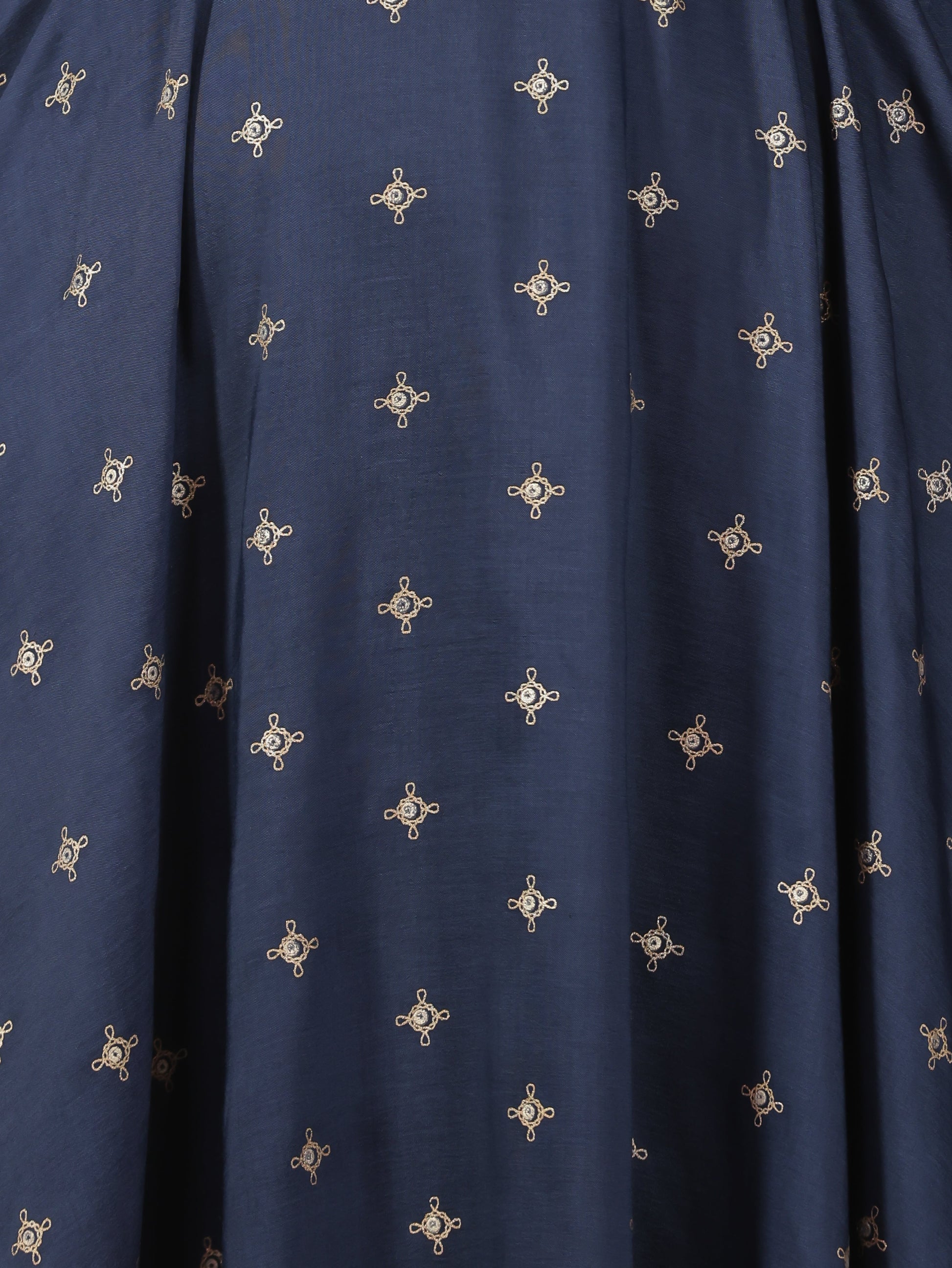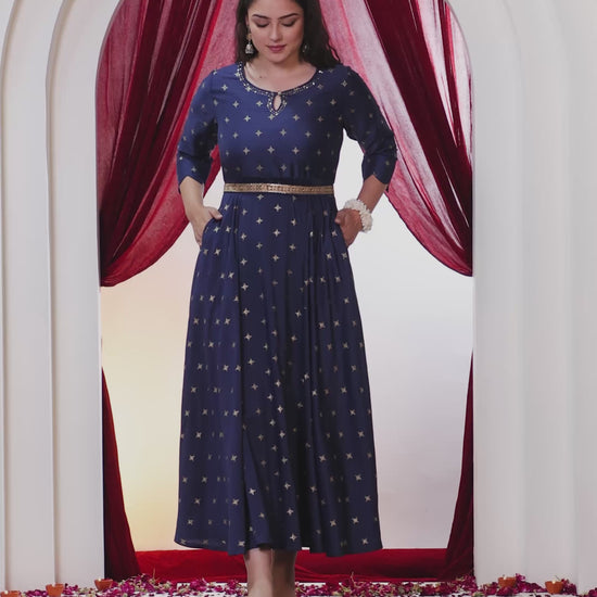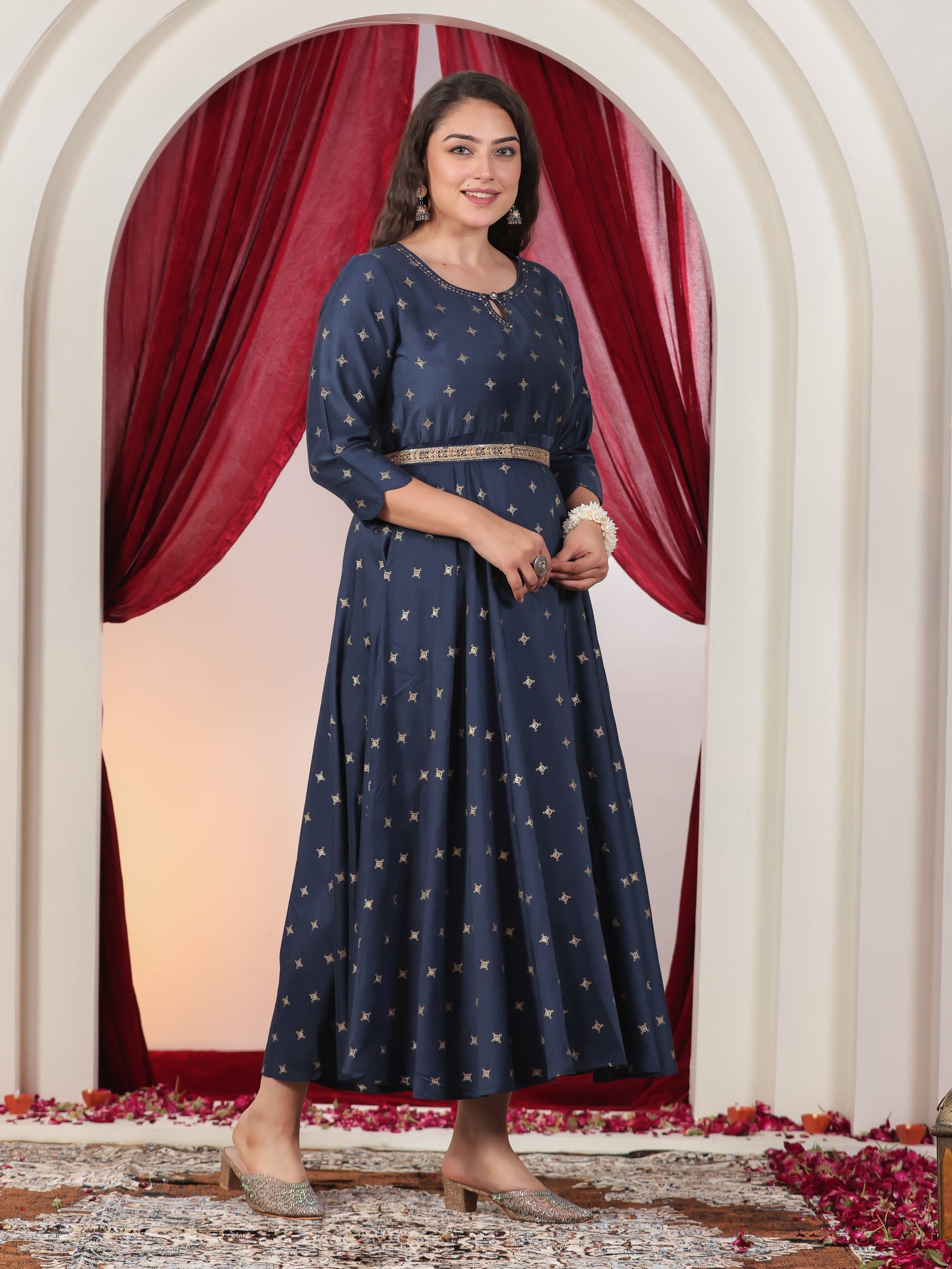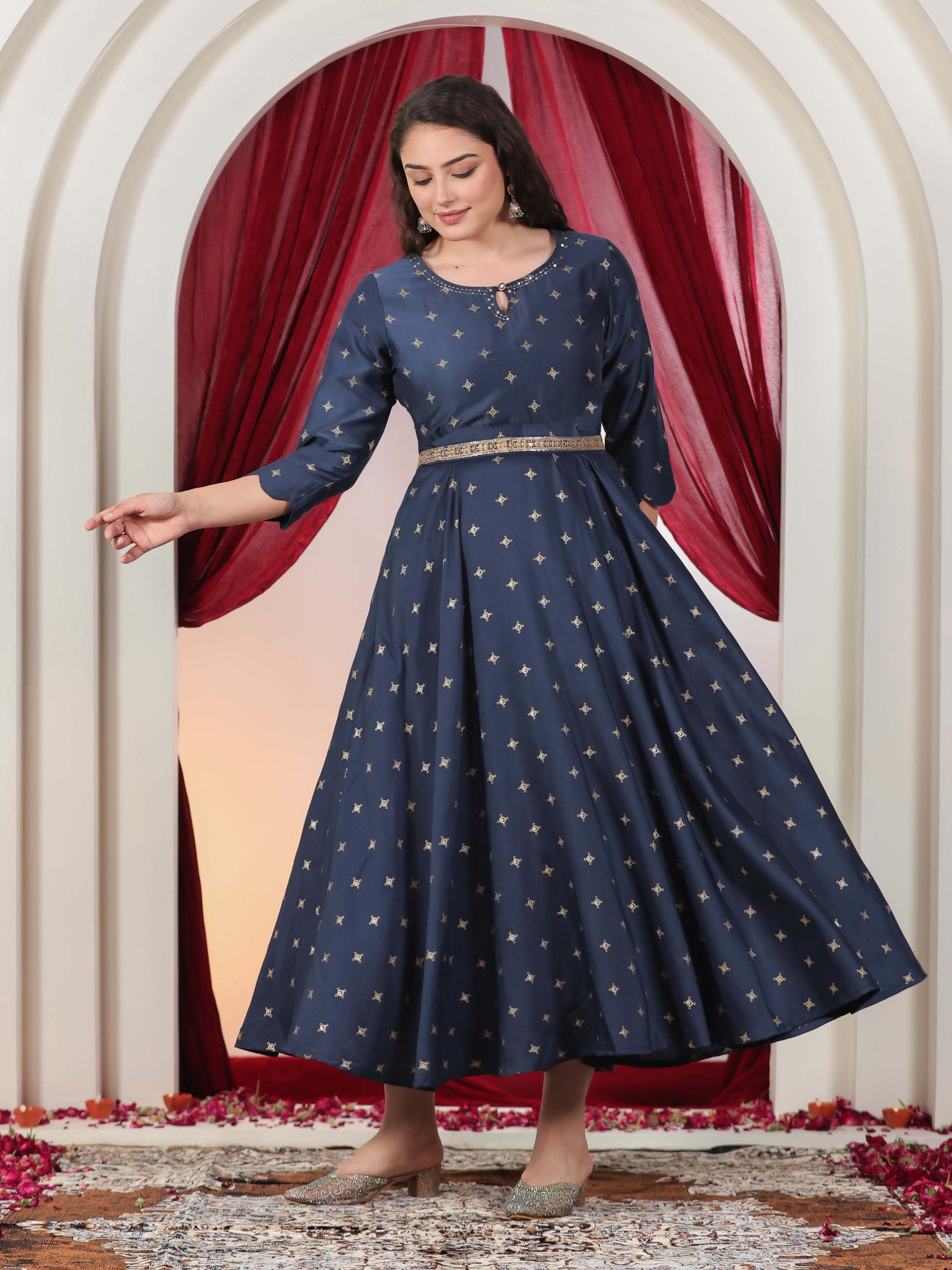 Embroidered Muslin Gold foil Anarkali Blue Dress