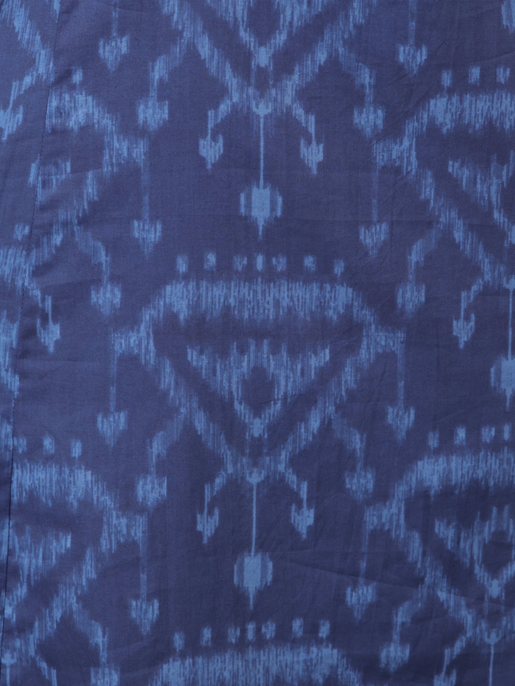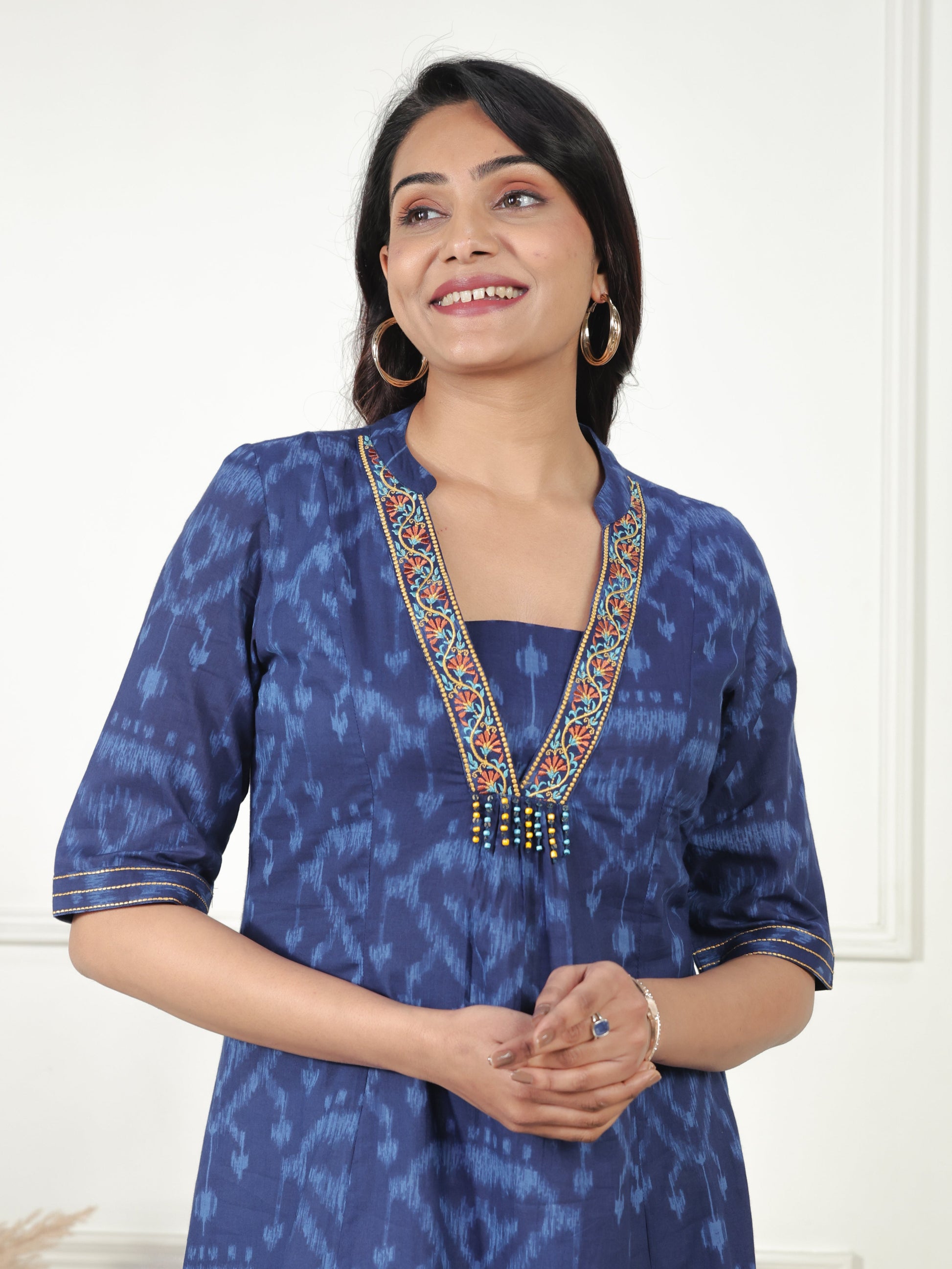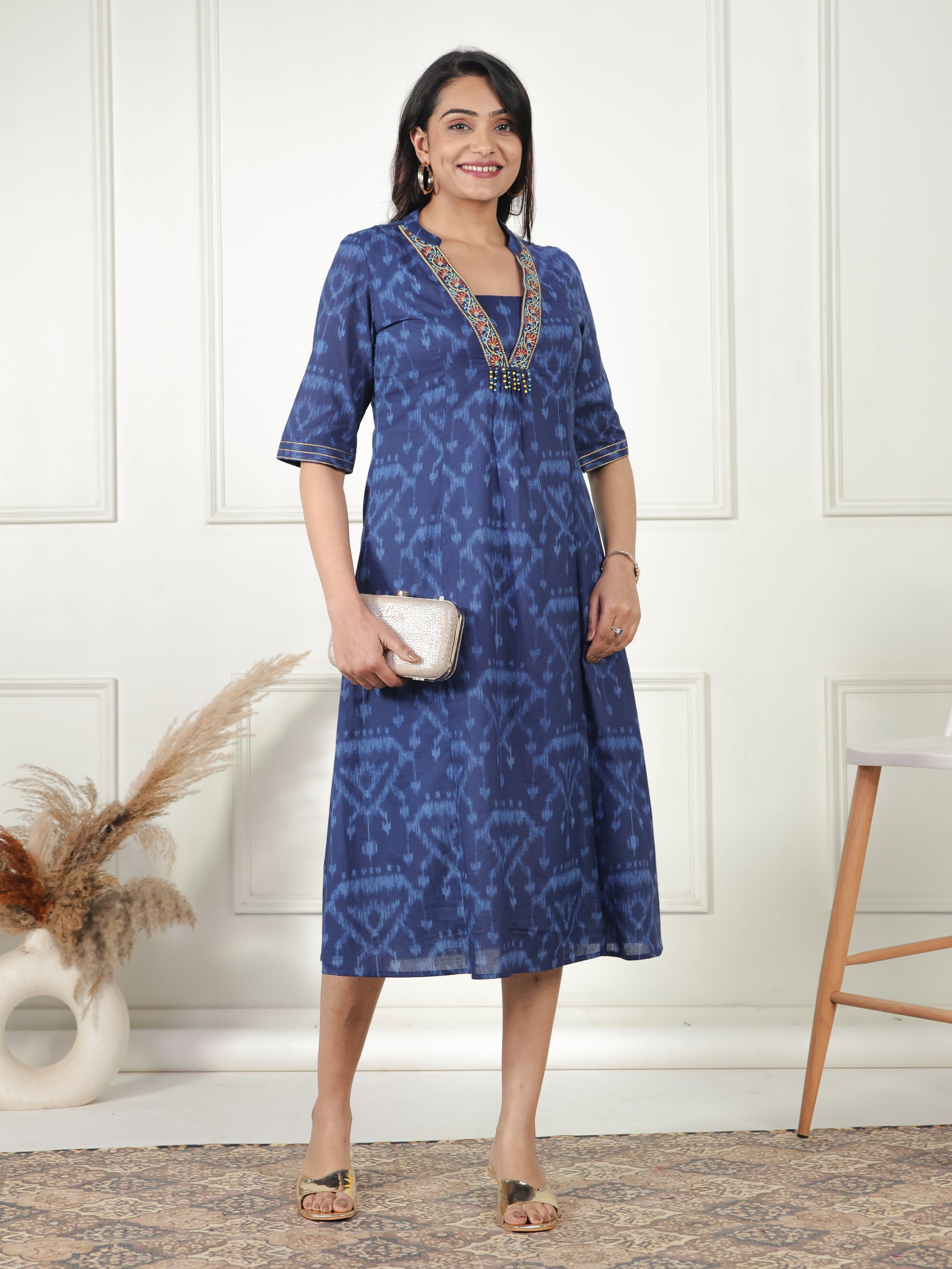 Embroidered Soft Cotton Ikat Flared Blue Dress