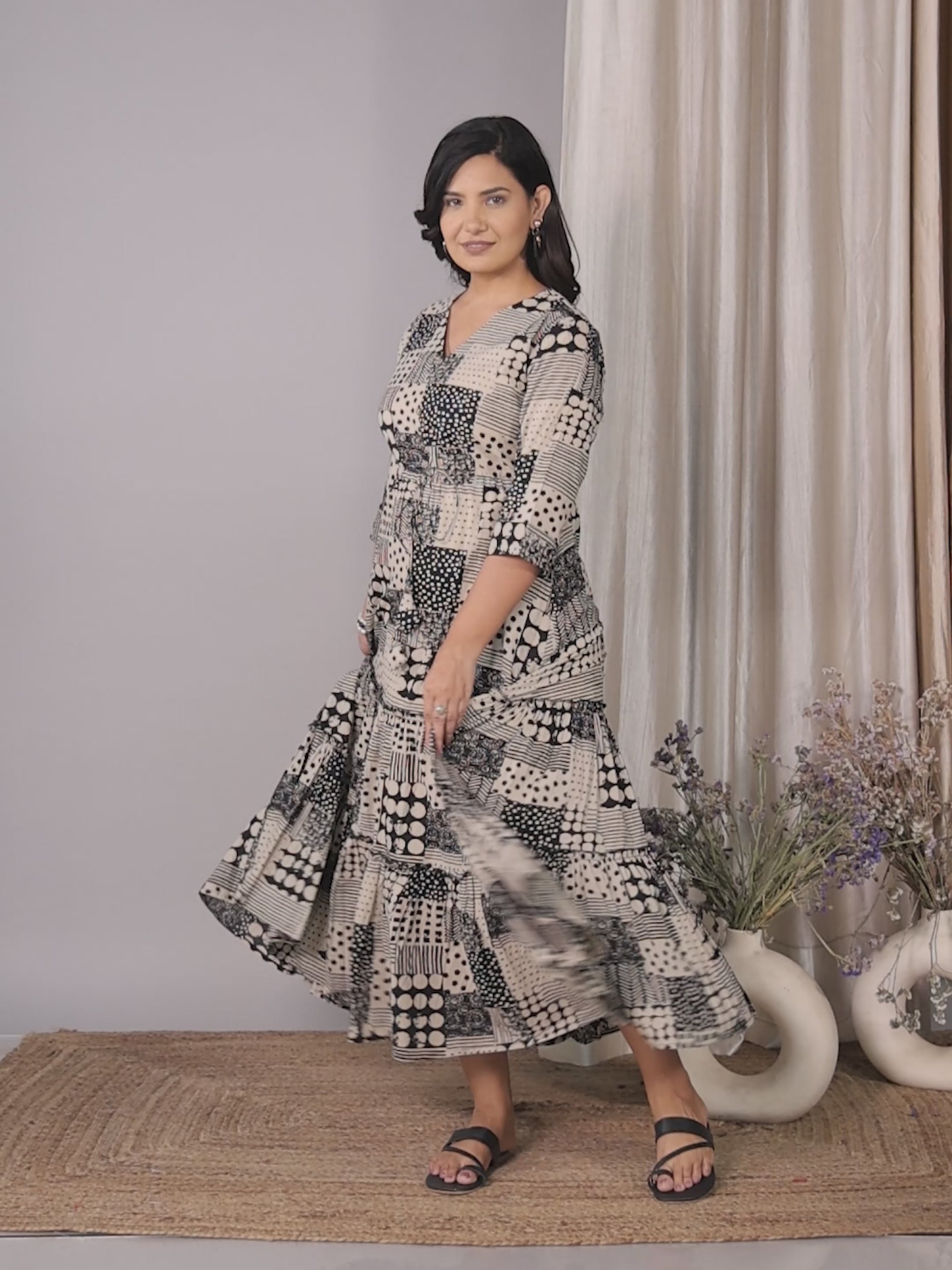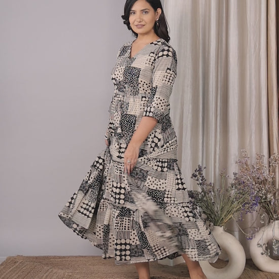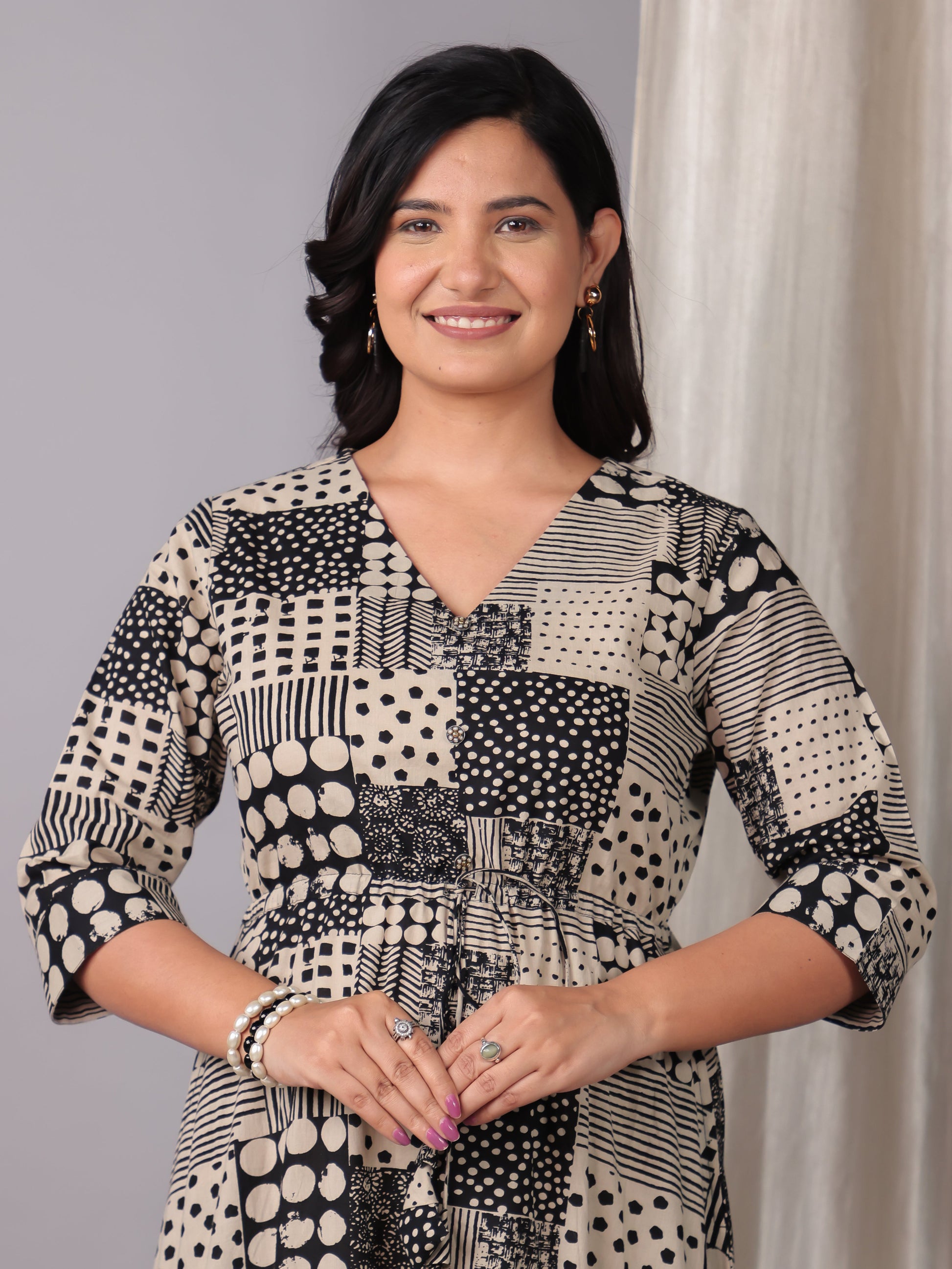 This Black dress crafted from soft Soft Cotton is designed for comfort and versatility. The A-line cut and Patchwork patterns add a playful vibe, while work accents make it unique. Perfect for holidays, shopping trips, or relaxed evenings. Style with a sling bag and chic sandals. Care is effortless with simple instructions.
