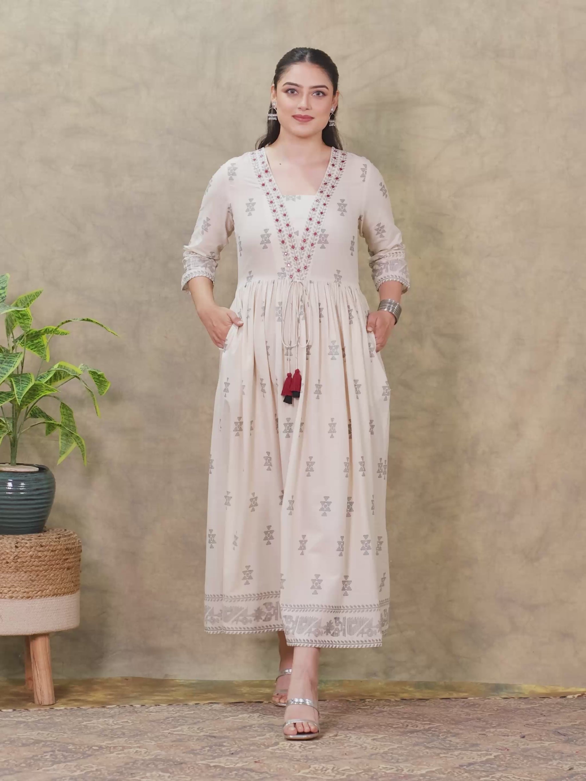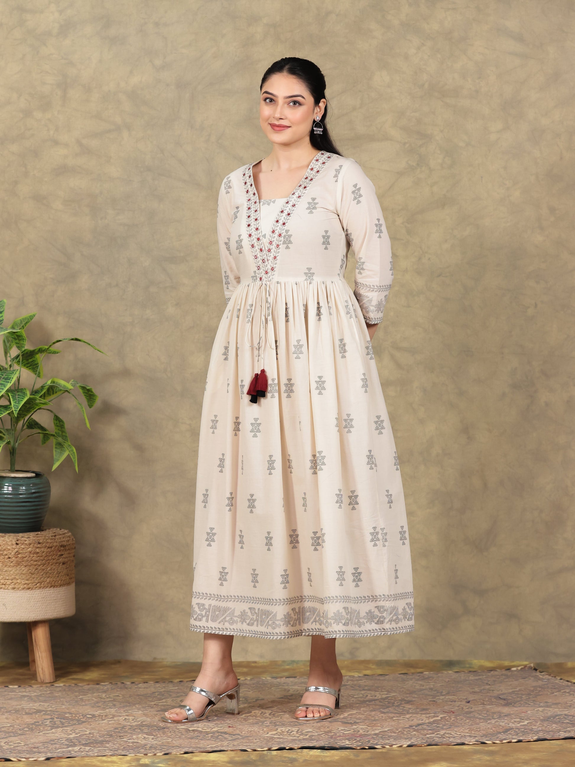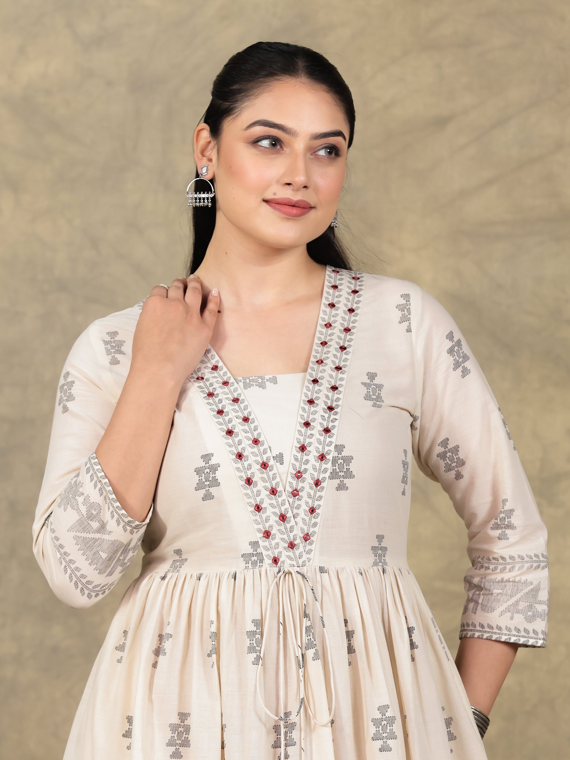 Embroidered Soft Cotton Geometric Anarkali Cream Dress