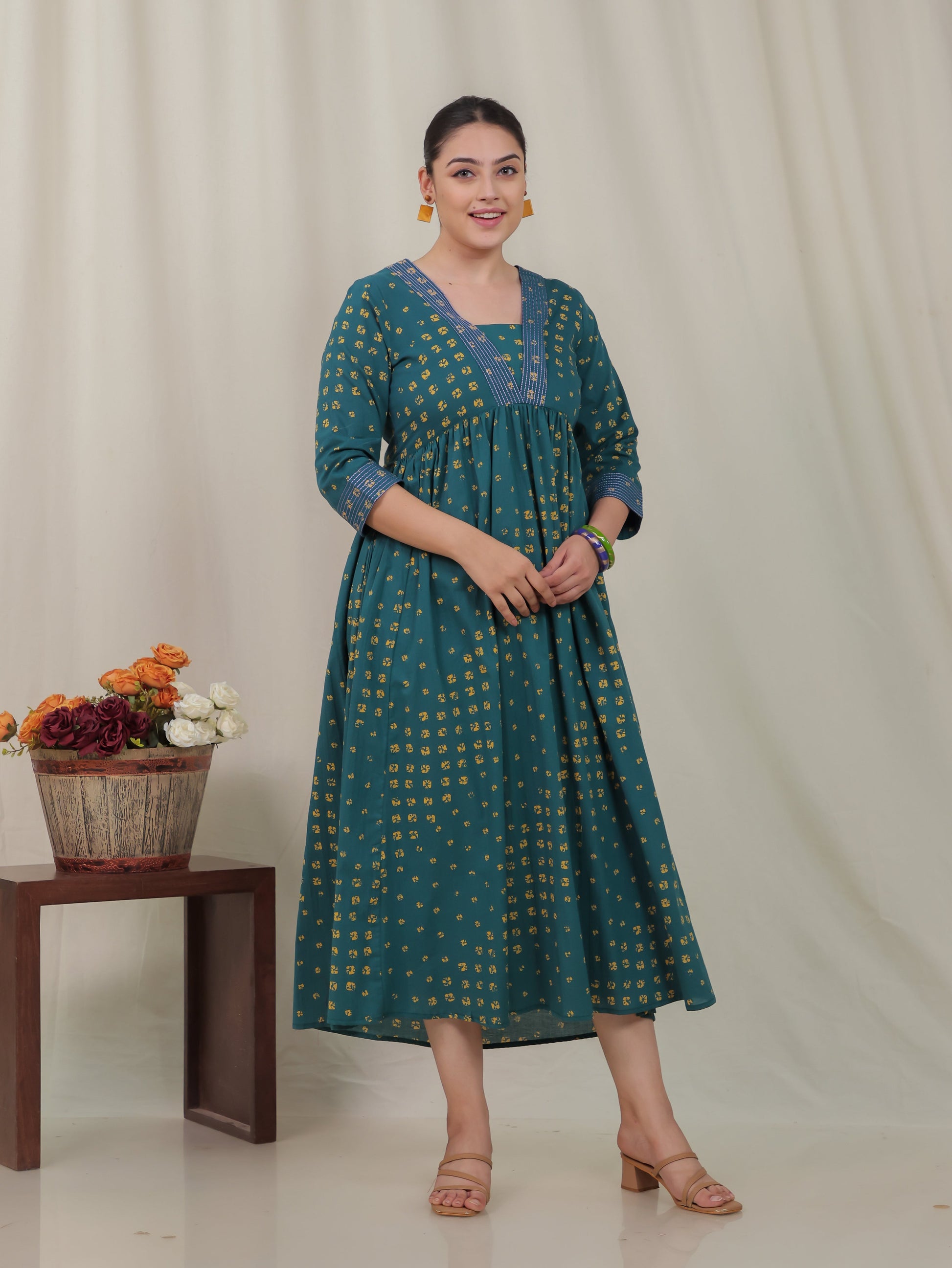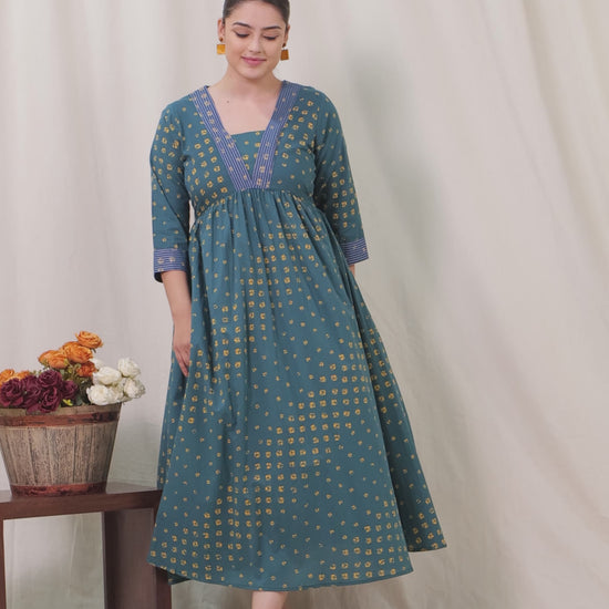 Embroidered Soft Cotton Bandhani Gathered Green Dress