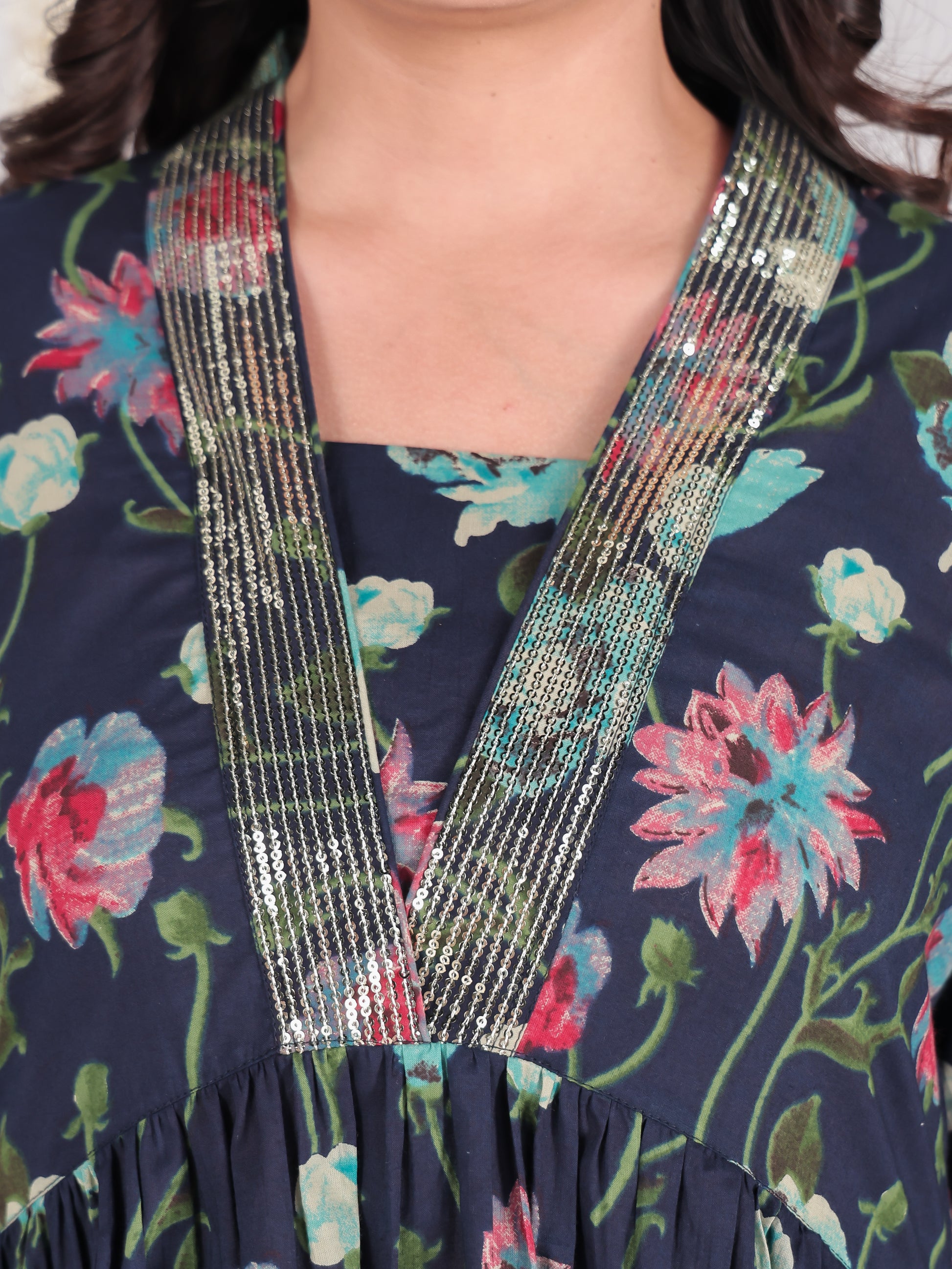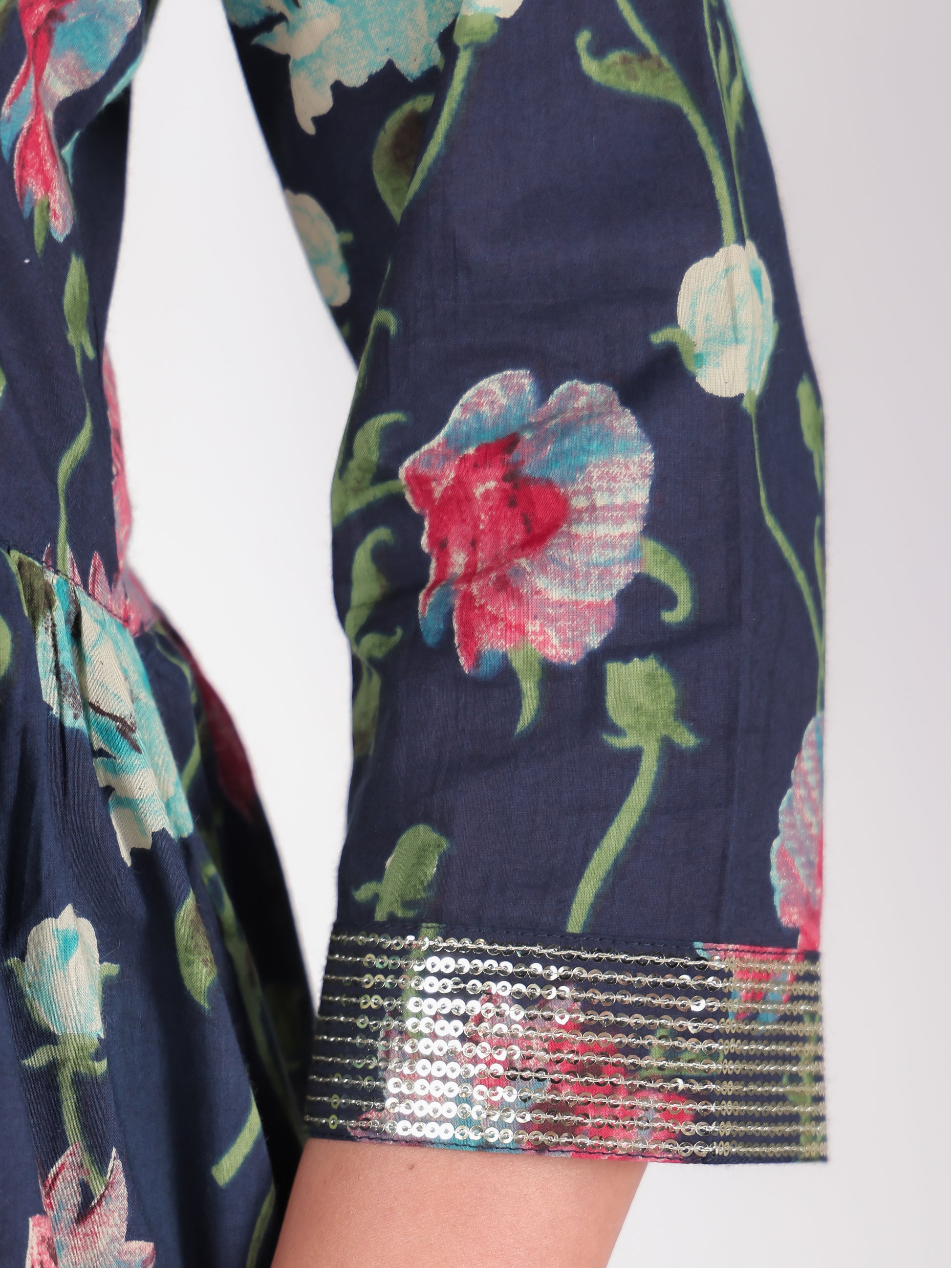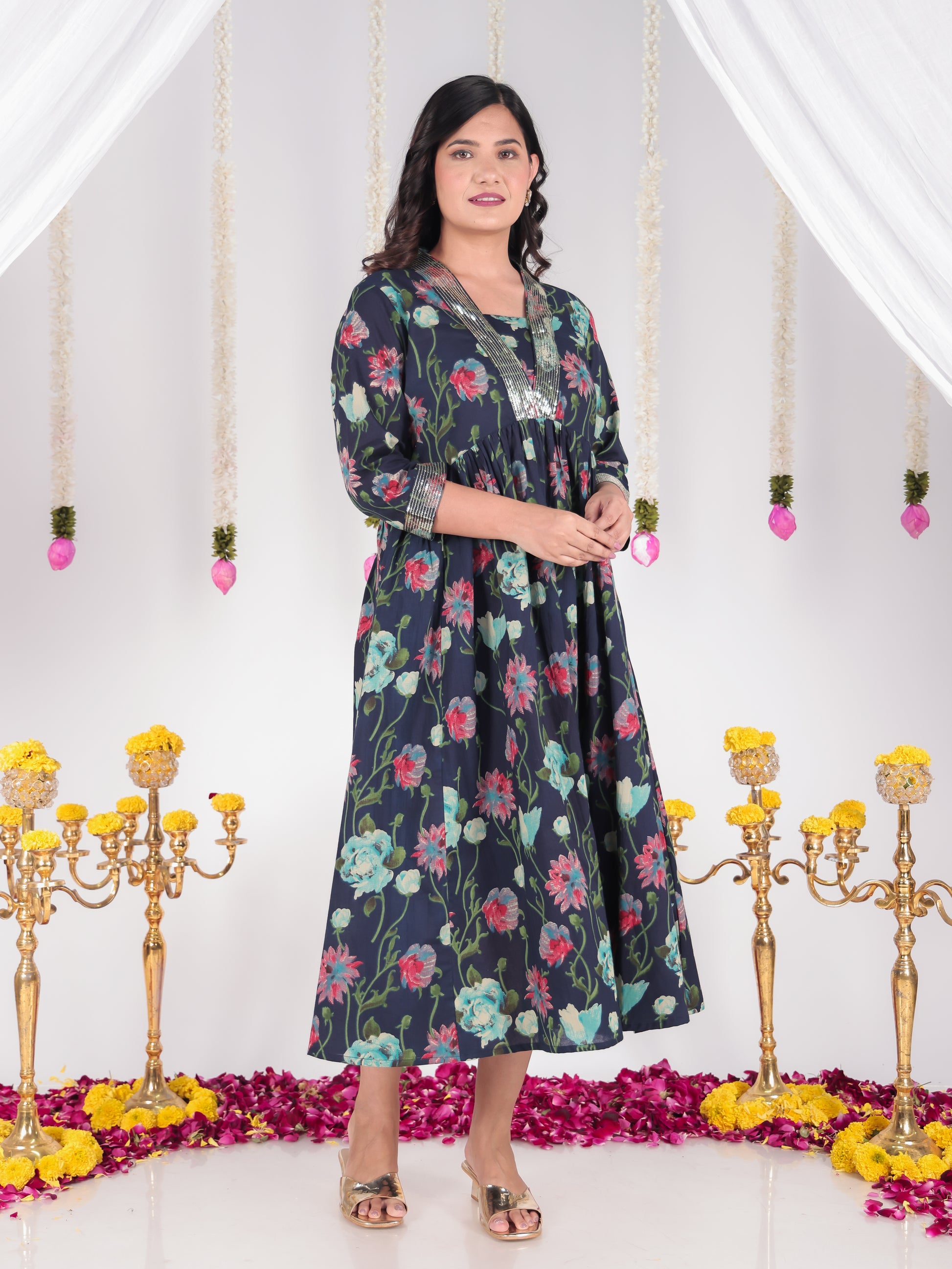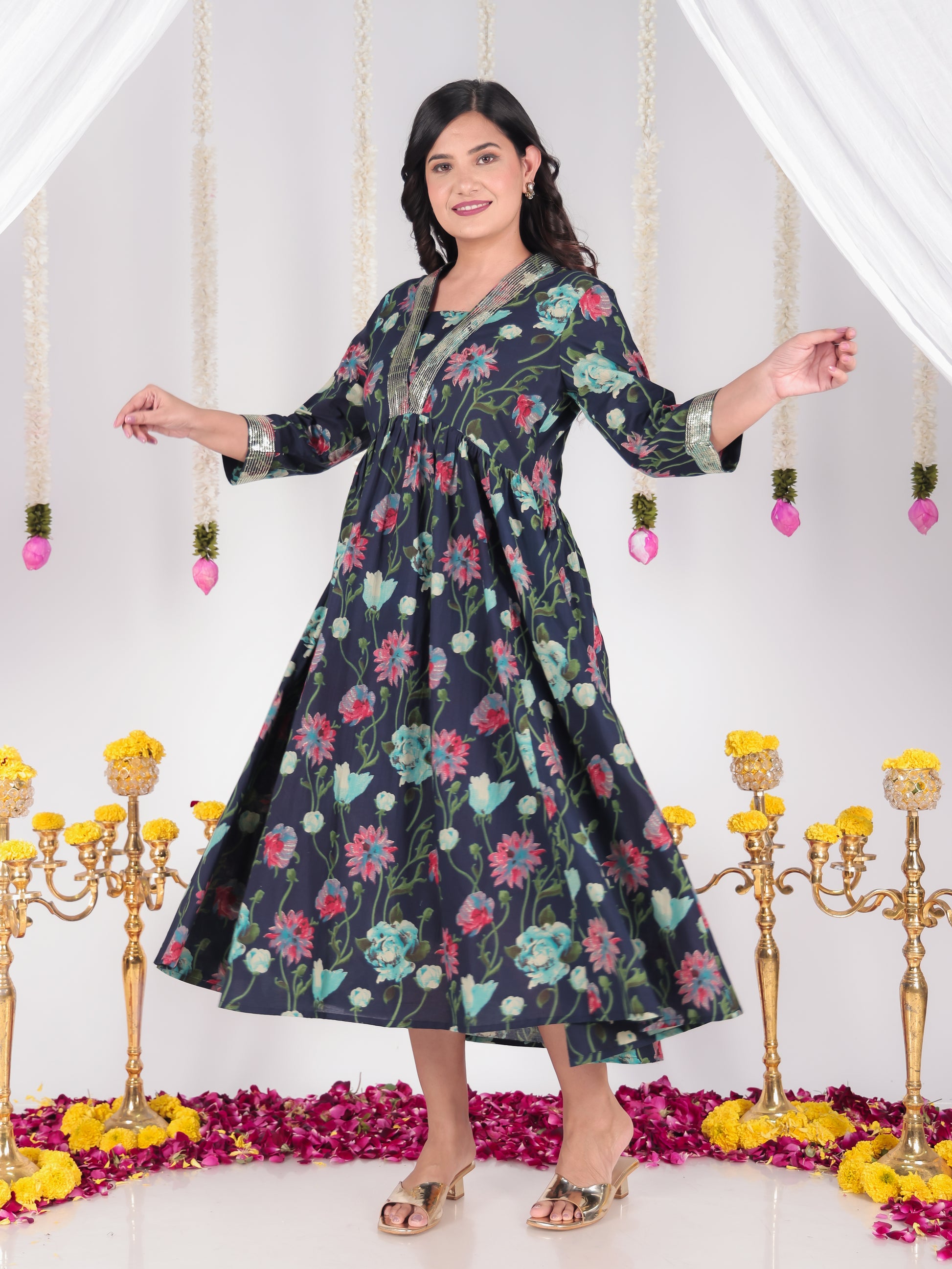 This Green dress crafted from soft Soft Cotton is designed for comfort and versatility. The Gathered cut and Floral patterns add a playful vibe, while work accents make it unique. Perfect for holidays, shopping trips, or relaxed evenings. Style with a sling bag and chic sandals. Care is effortless with simple instructions.