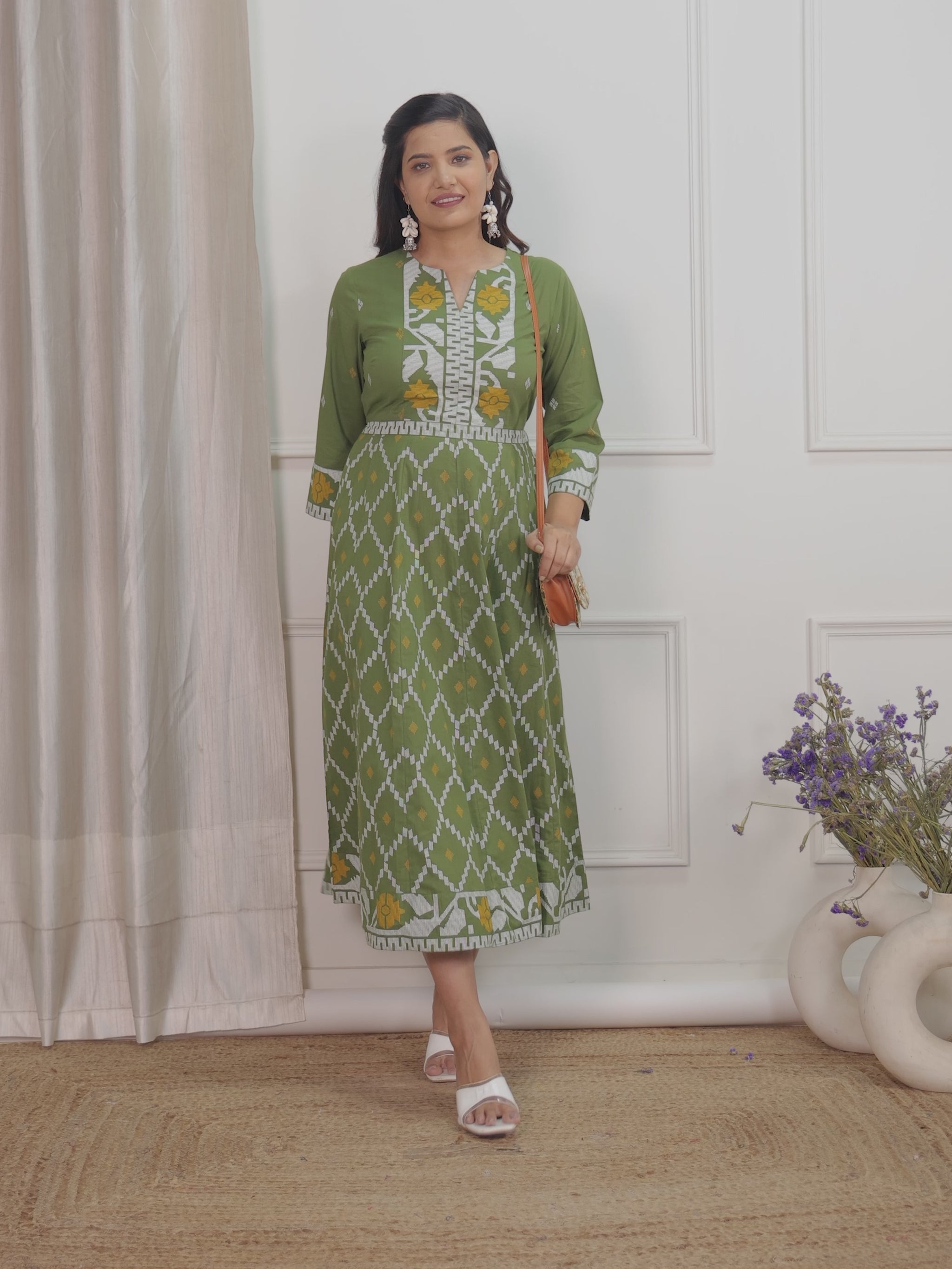 Soft Cotton Geometric Flared Green Dress
