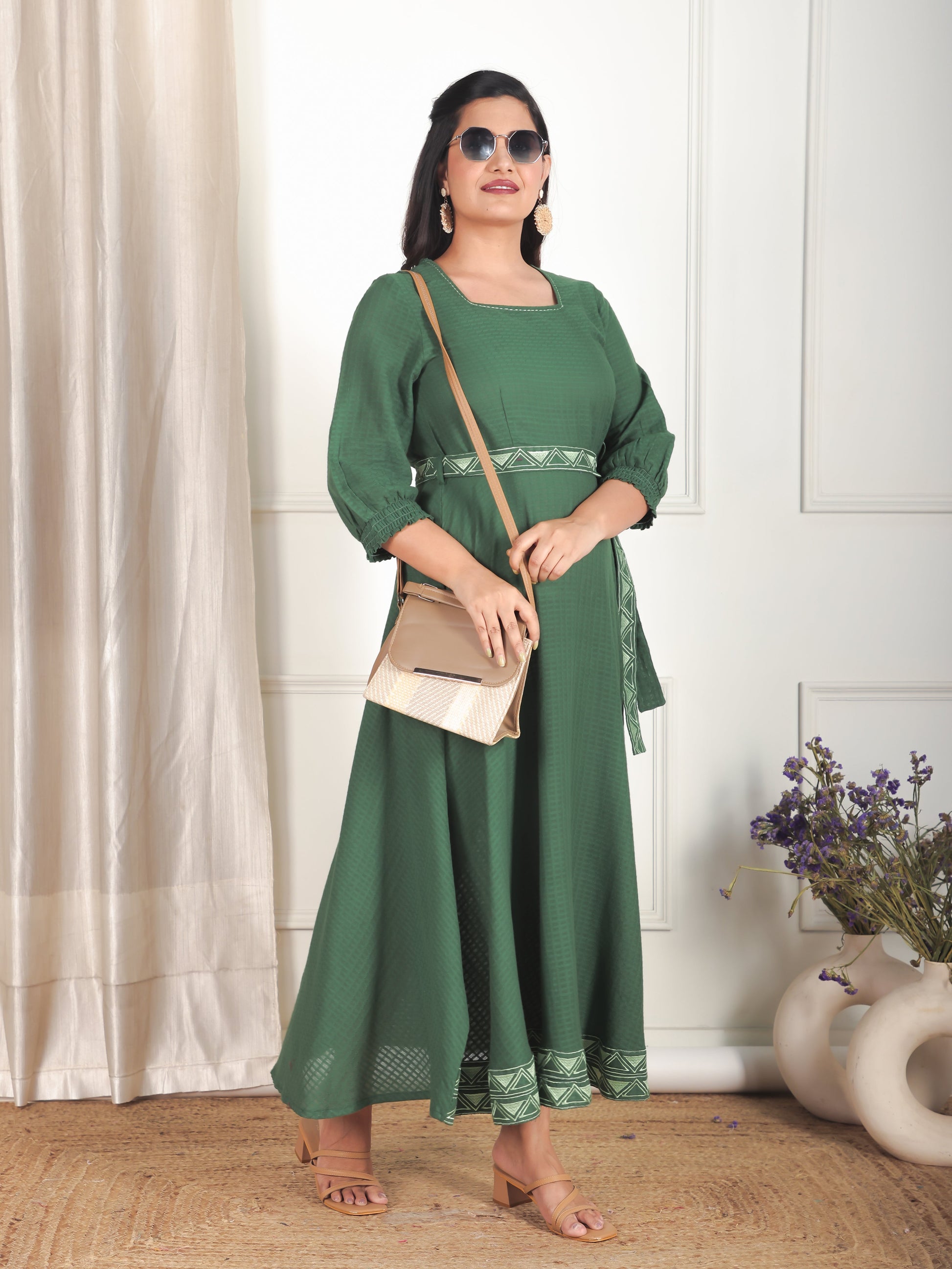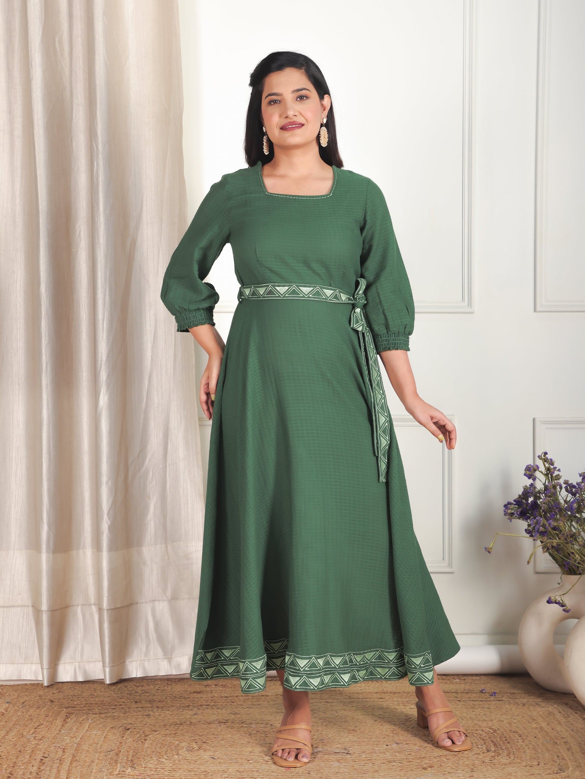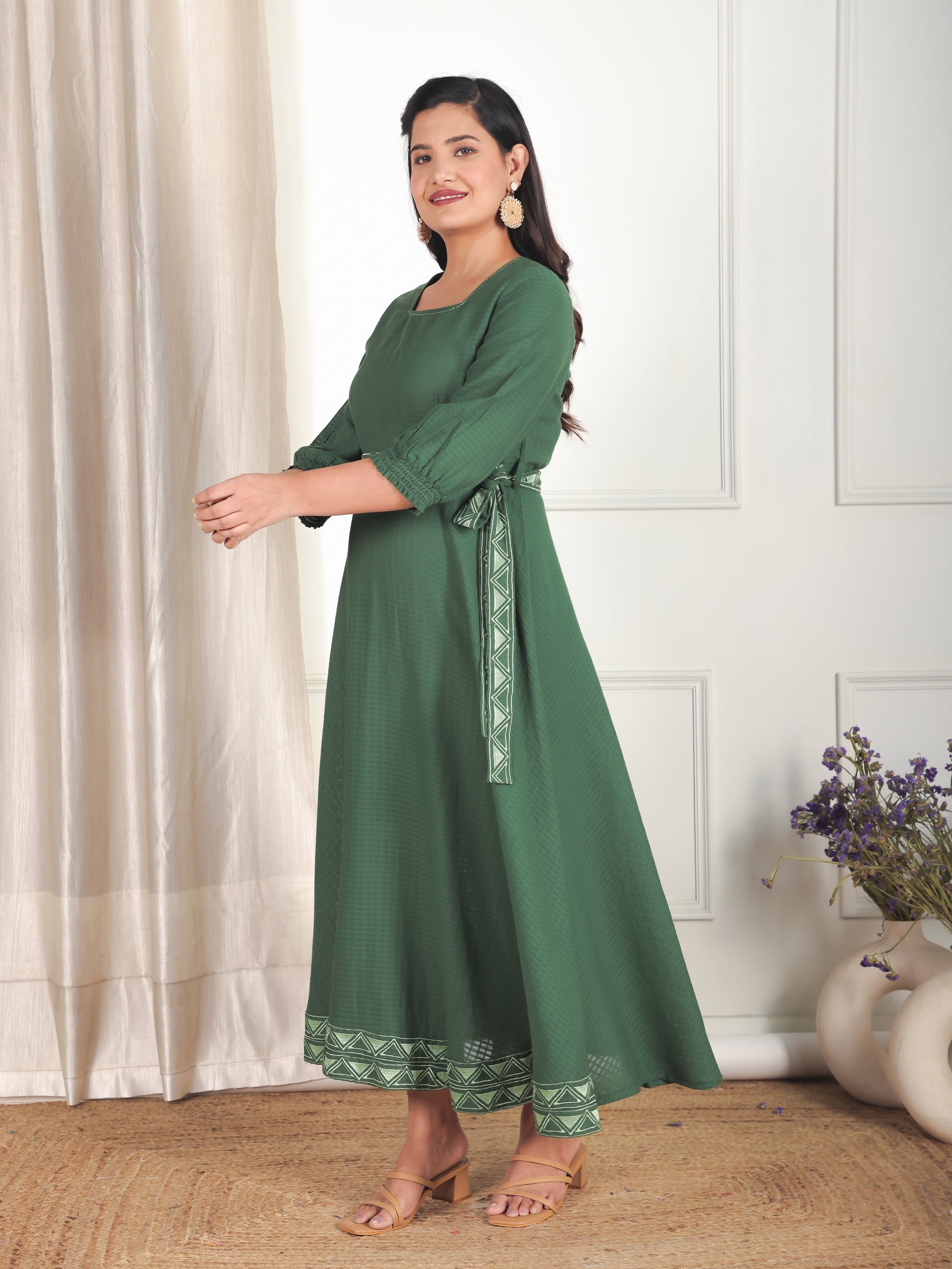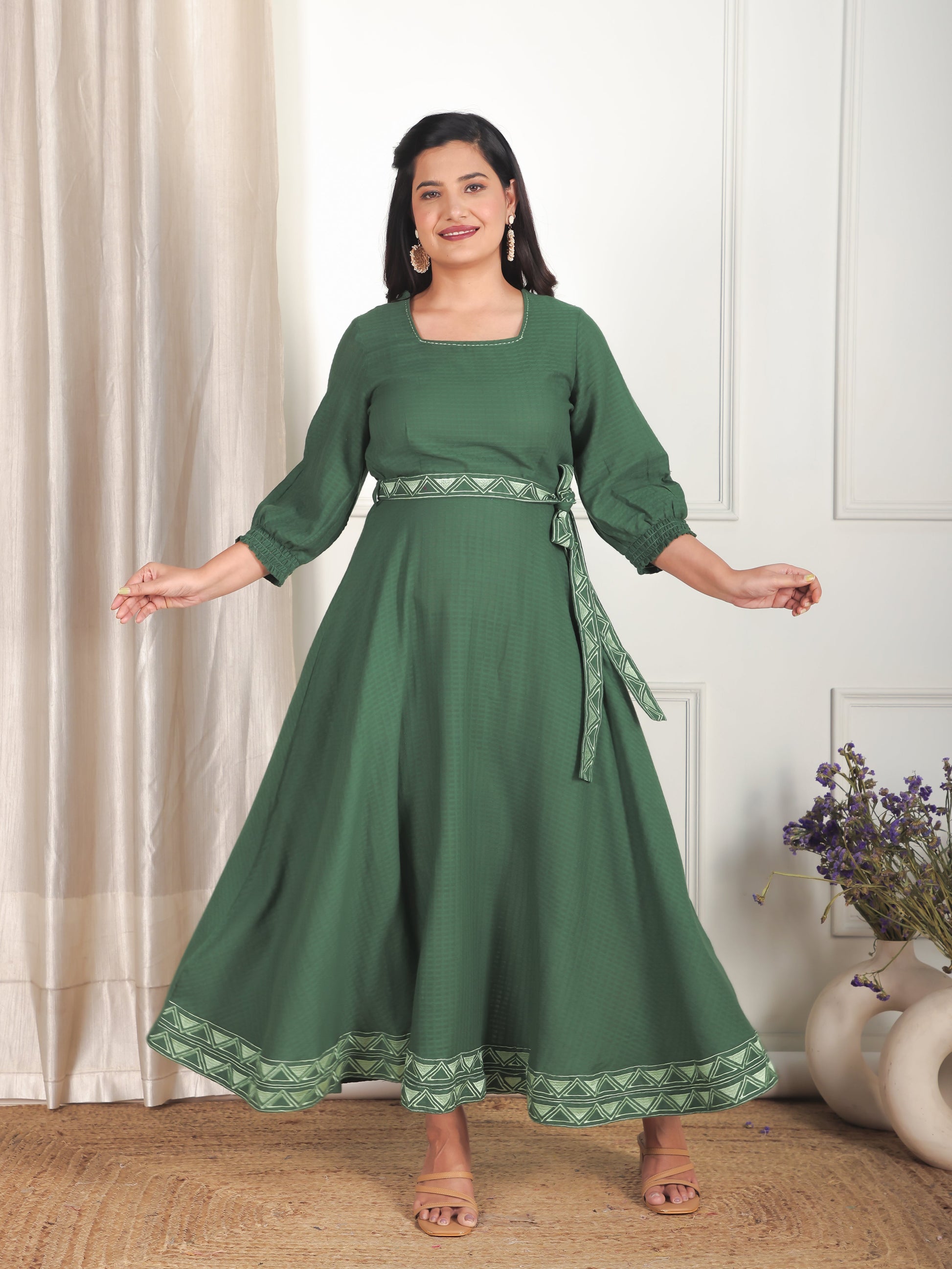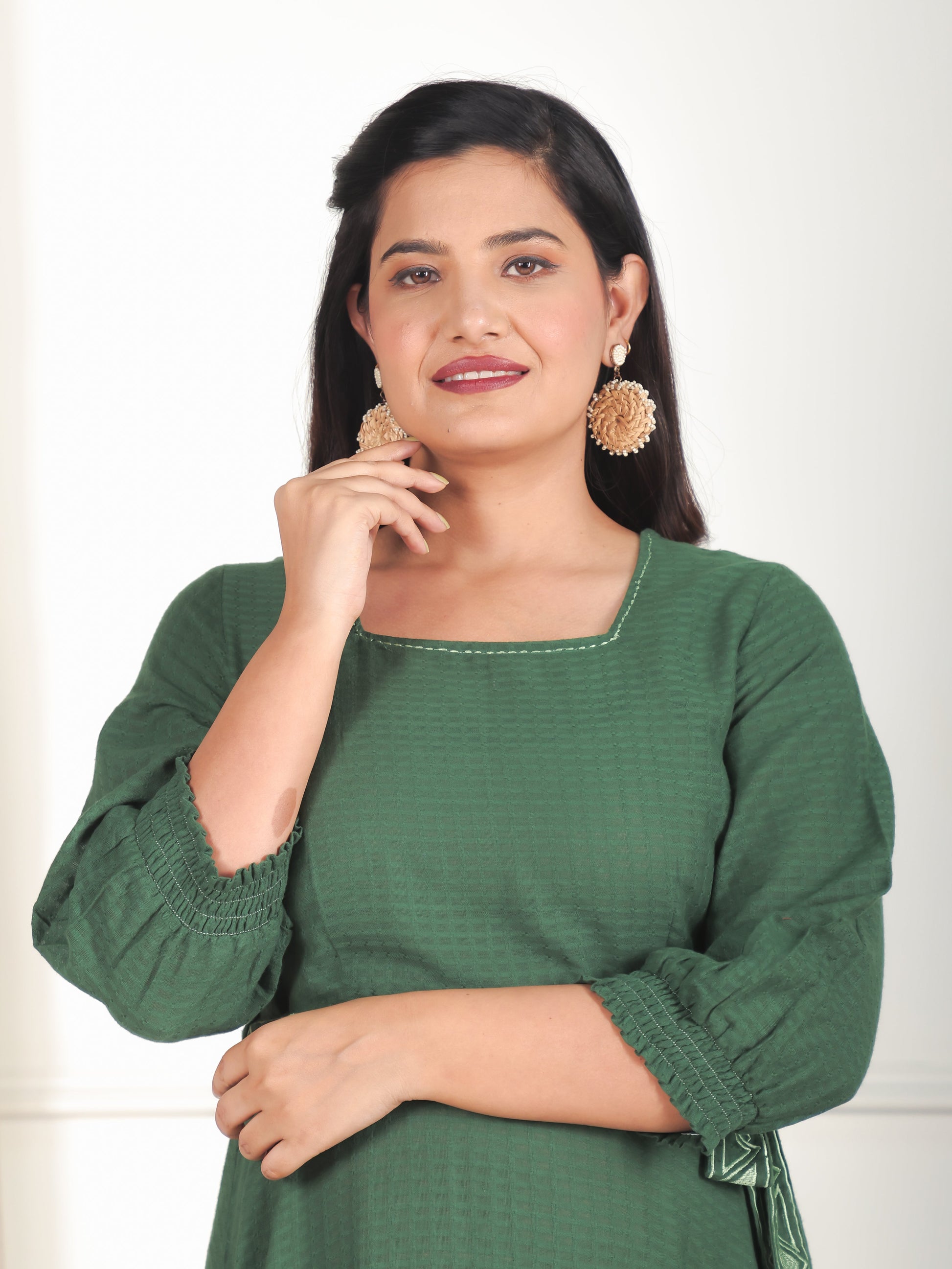 Designed for comfort and confidence, this Cotton Dobby dress in Green features a flattering Anarkali silhouette and unique Solid accents. The work detailing adds sophistication, making it perfect for coffee dates, casual evenings, or weekend brunches. Accessorise with minimal jewellery and flats for a polished finish.