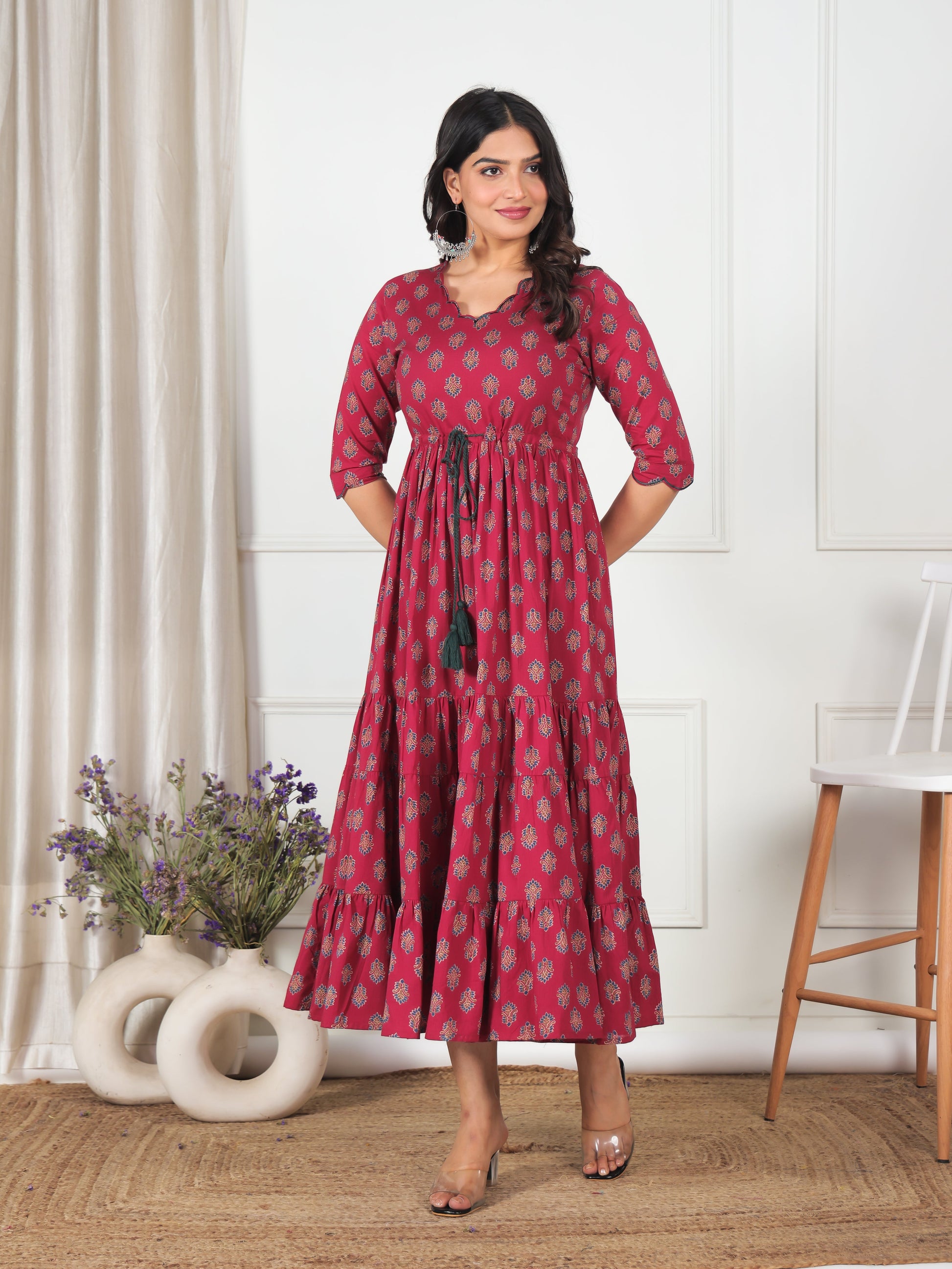 Embroidered Soft Cotton Floral Tiered Maroon Dress