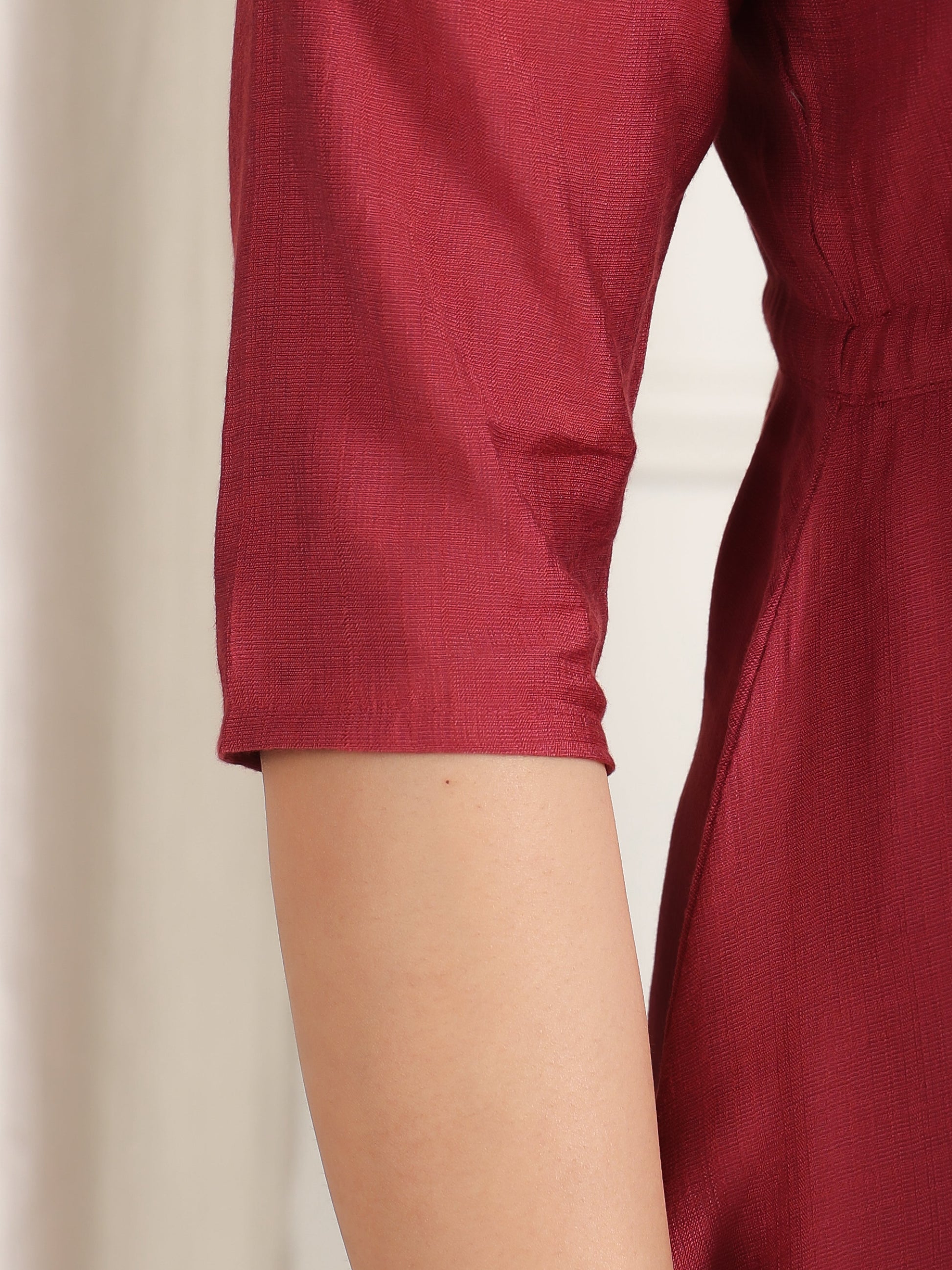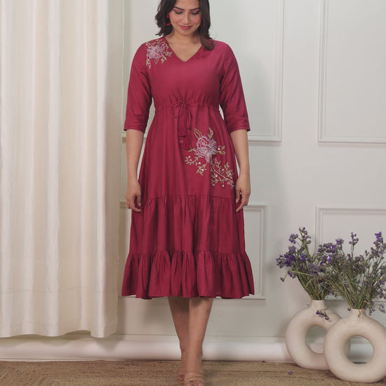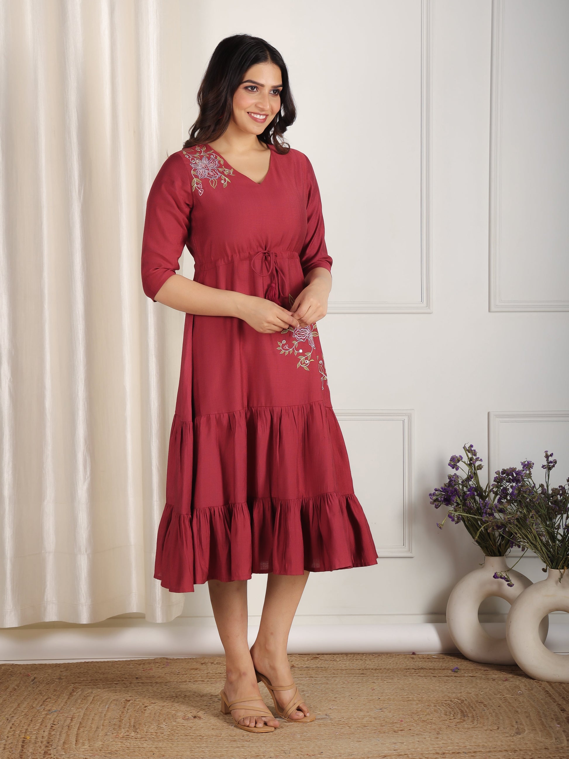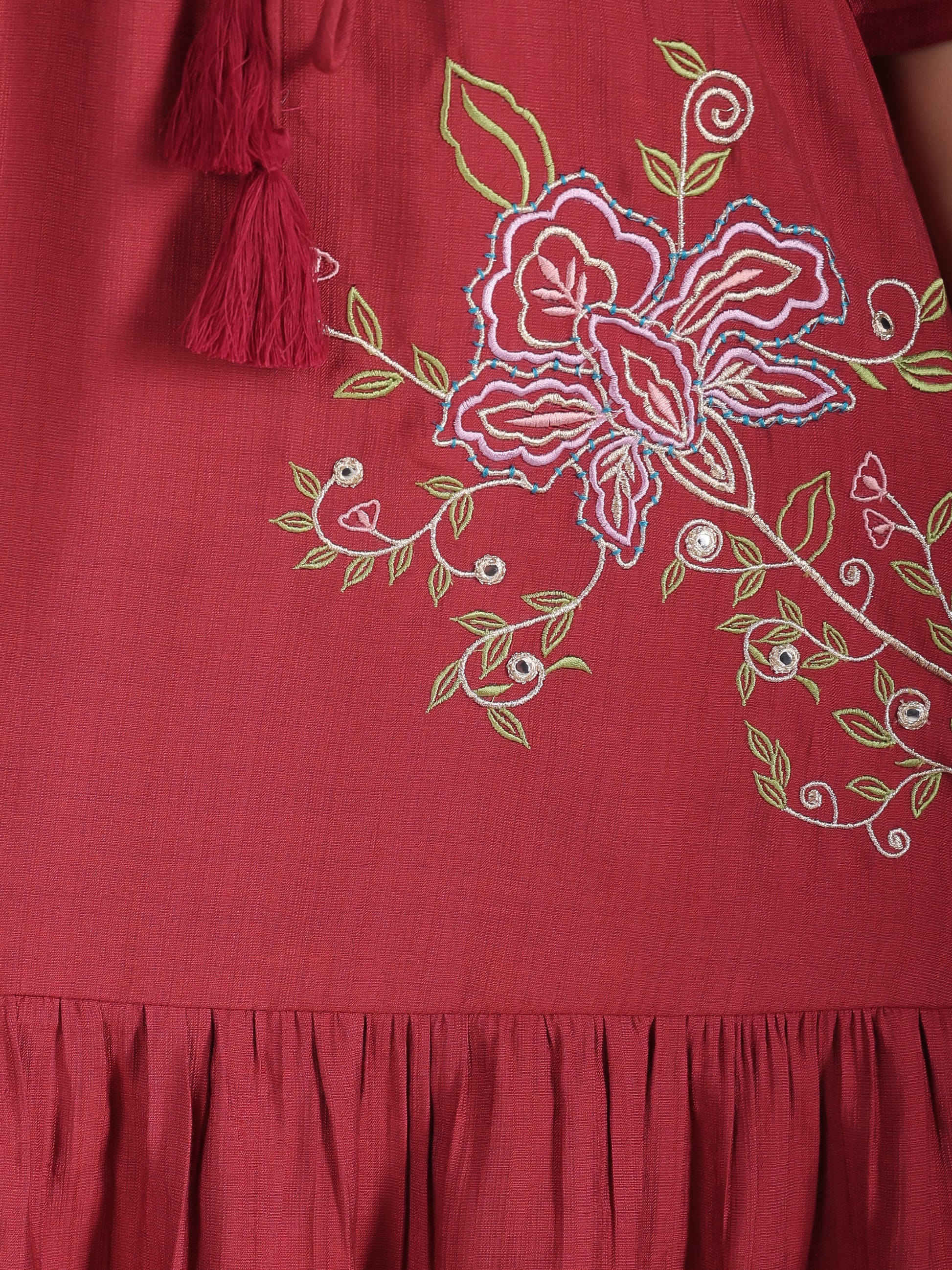 Embroidered Blend Cotton Solid Anarkali Maroon Dress