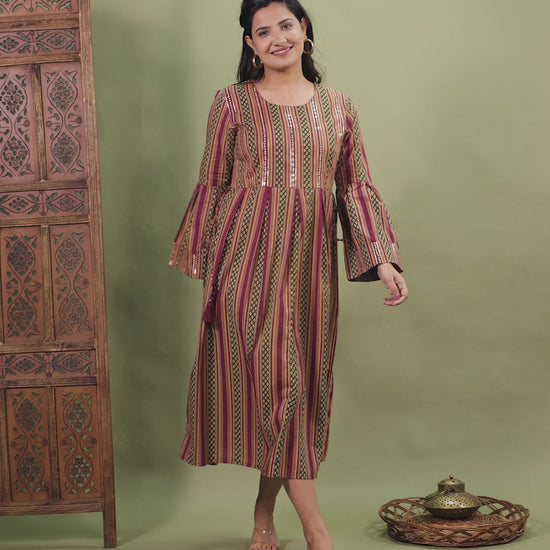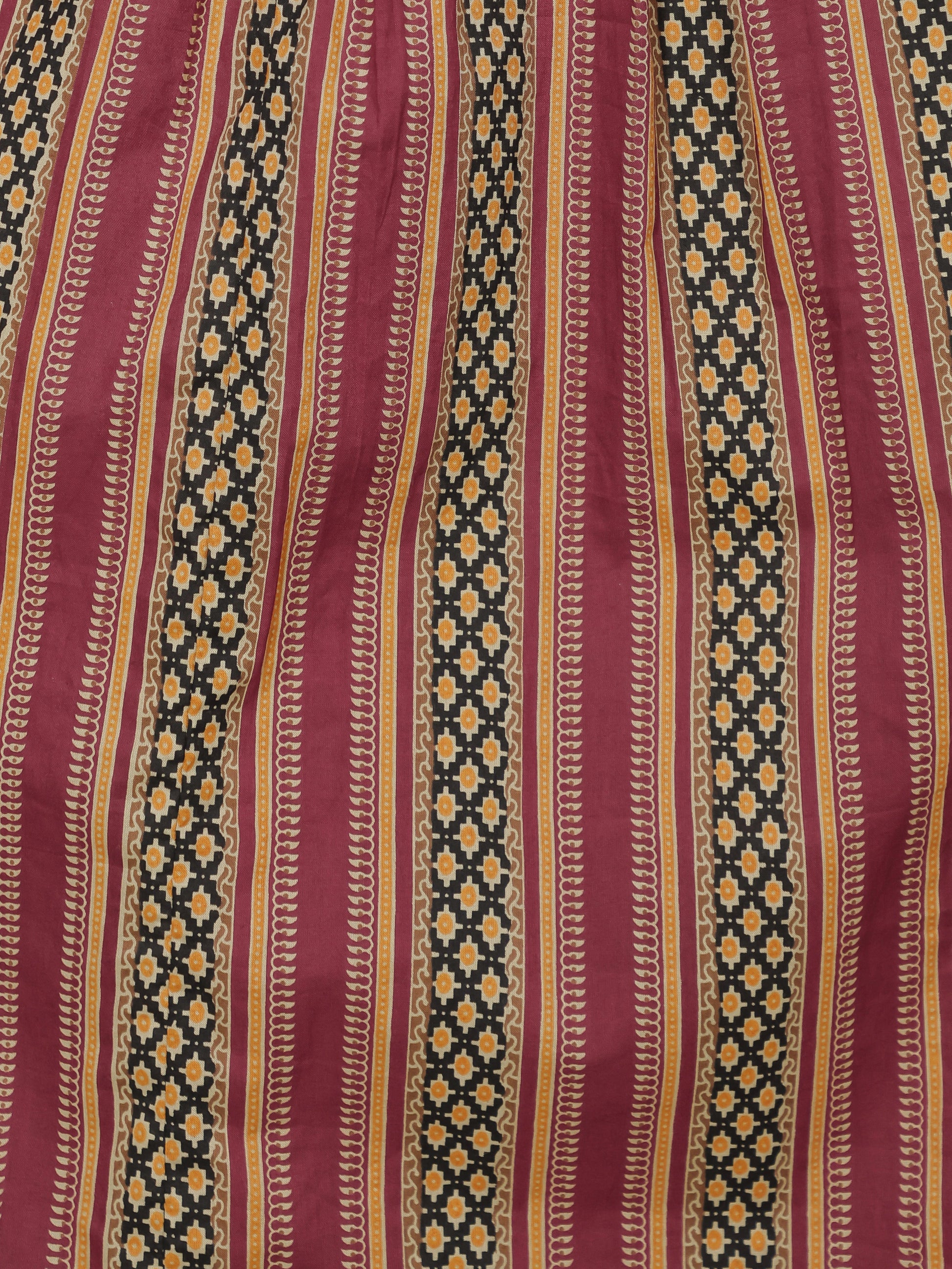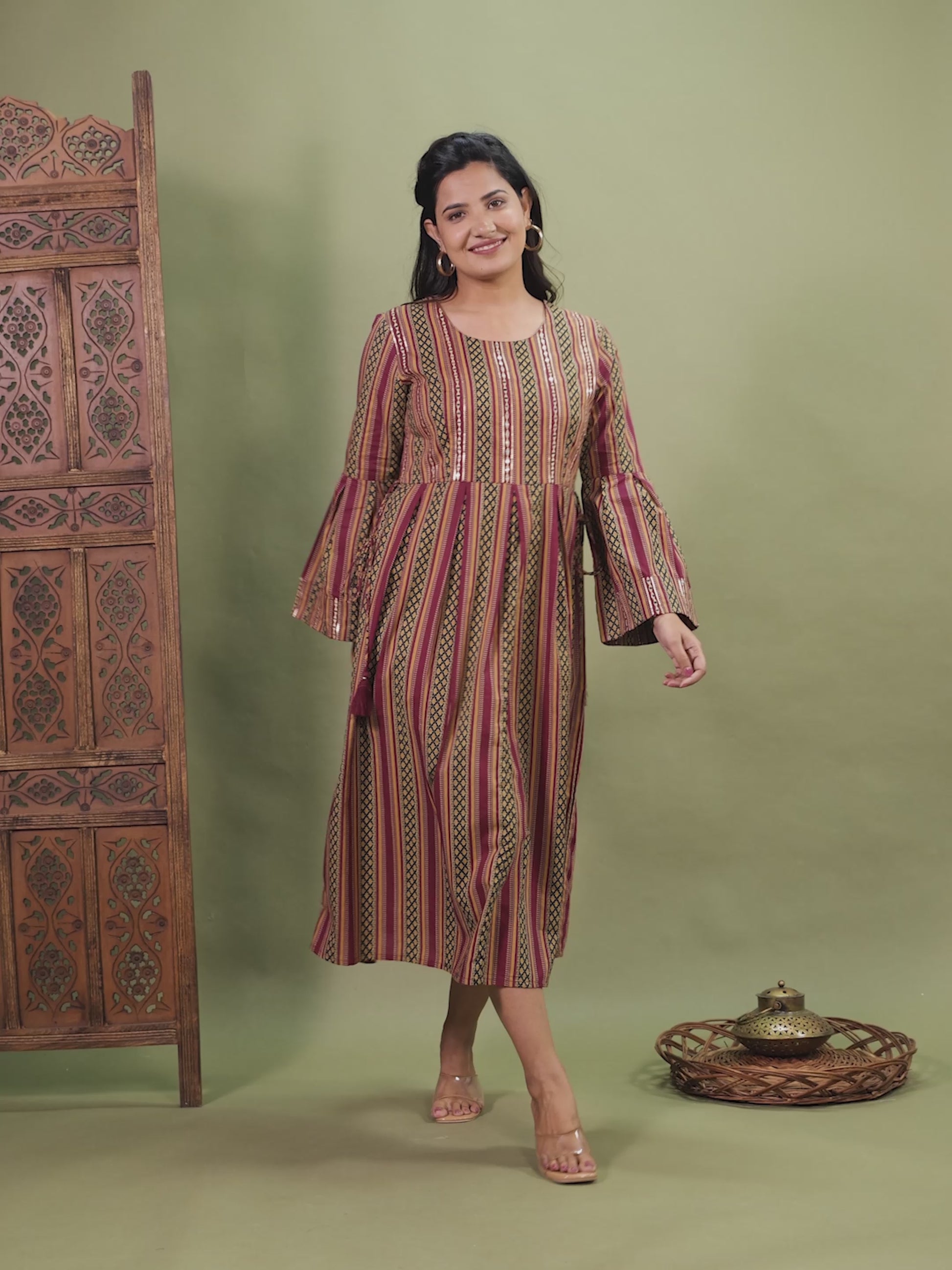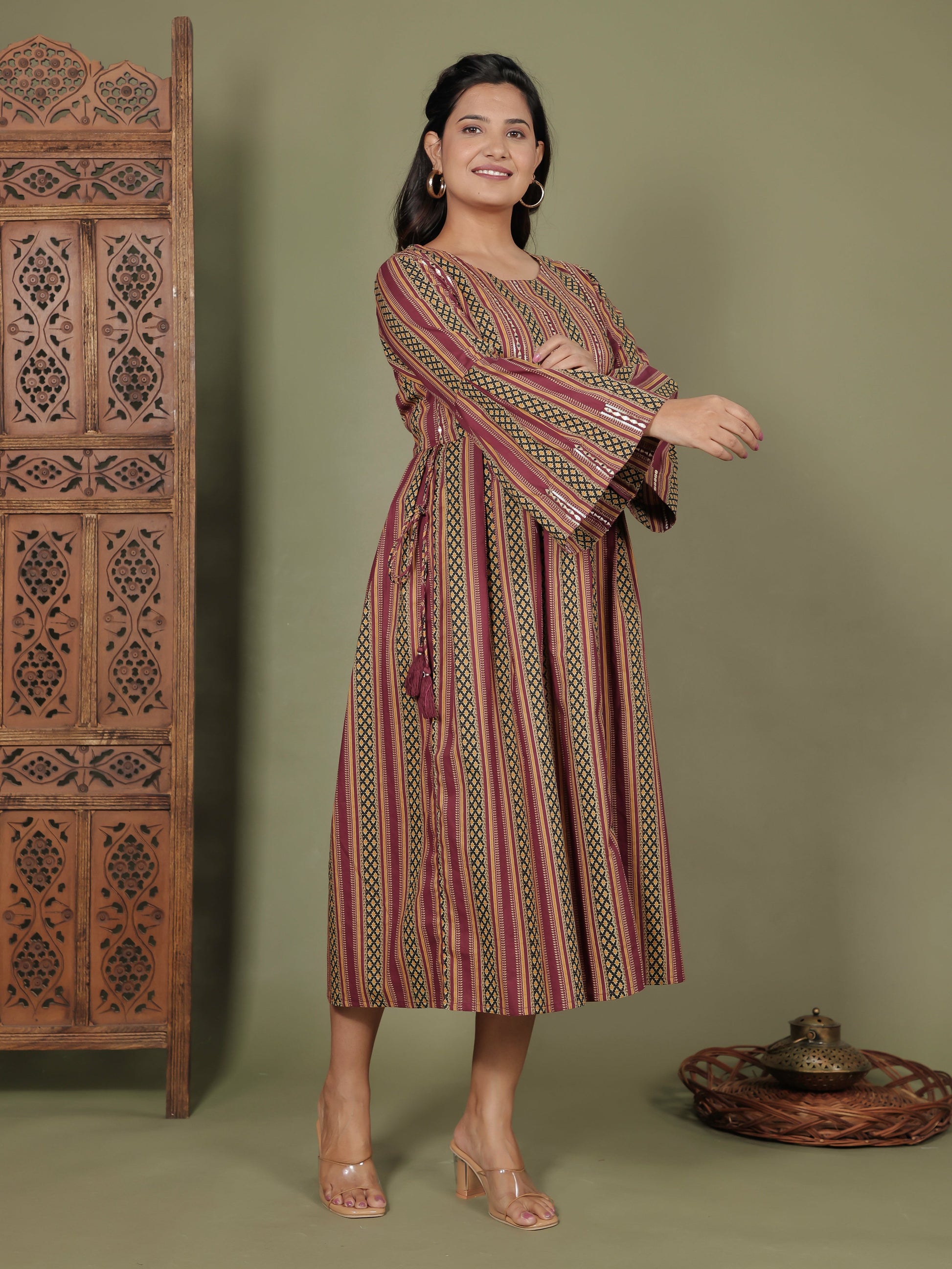 This Maroon dress crafted from soft Soft Cotton is designed for comfort and versatility. The Flared cut and Striped patterns add a playful vibe, while work accents make it unique. Perfect for holidays, shopping trips, or relaxed evenings. Style with a sling bag and chic sandals. Care is effortless with simple instructions.