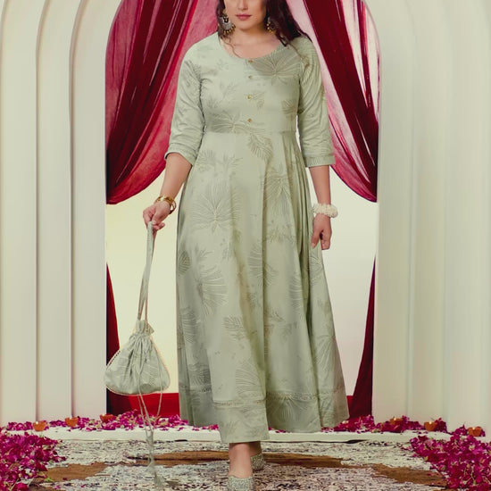 Poly Chanderi Gold foil Anarkali Mint Green Dress (With Potli Bag)