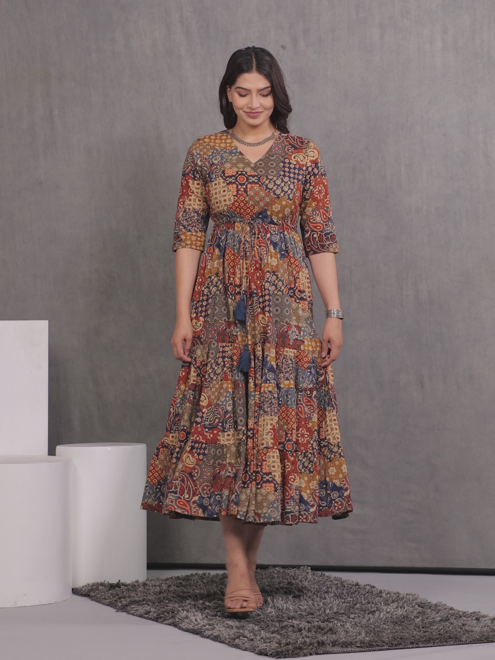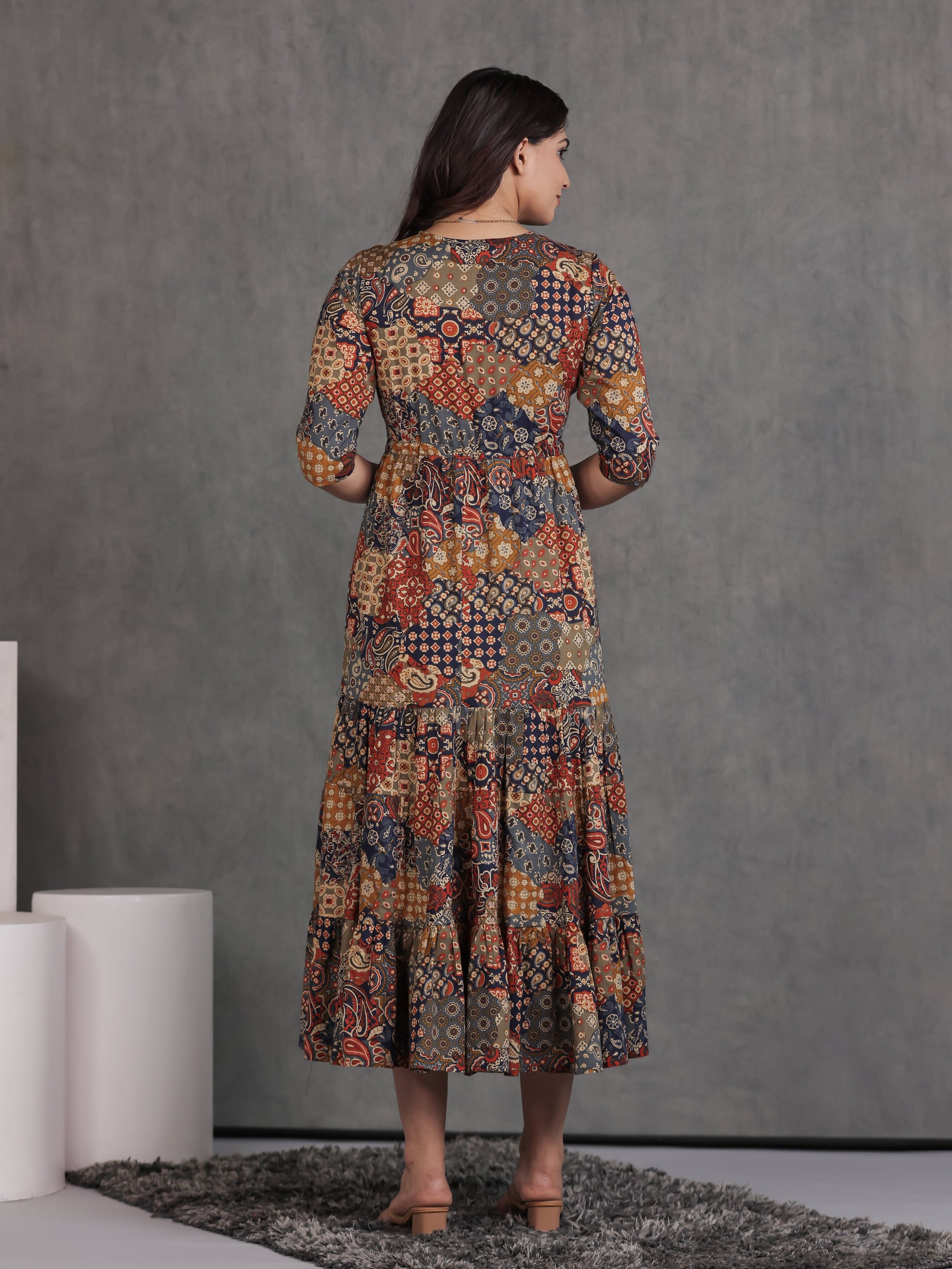 Add a stylish staple to your wardrobe with this A-line dress in Multicolor. The breathable Soft Cotton fabric keeps you comfortable all day, while the Patchwork motifs and subtle work elements create a sophisticated charm. Dress it up with heels or keep it casual with flats.