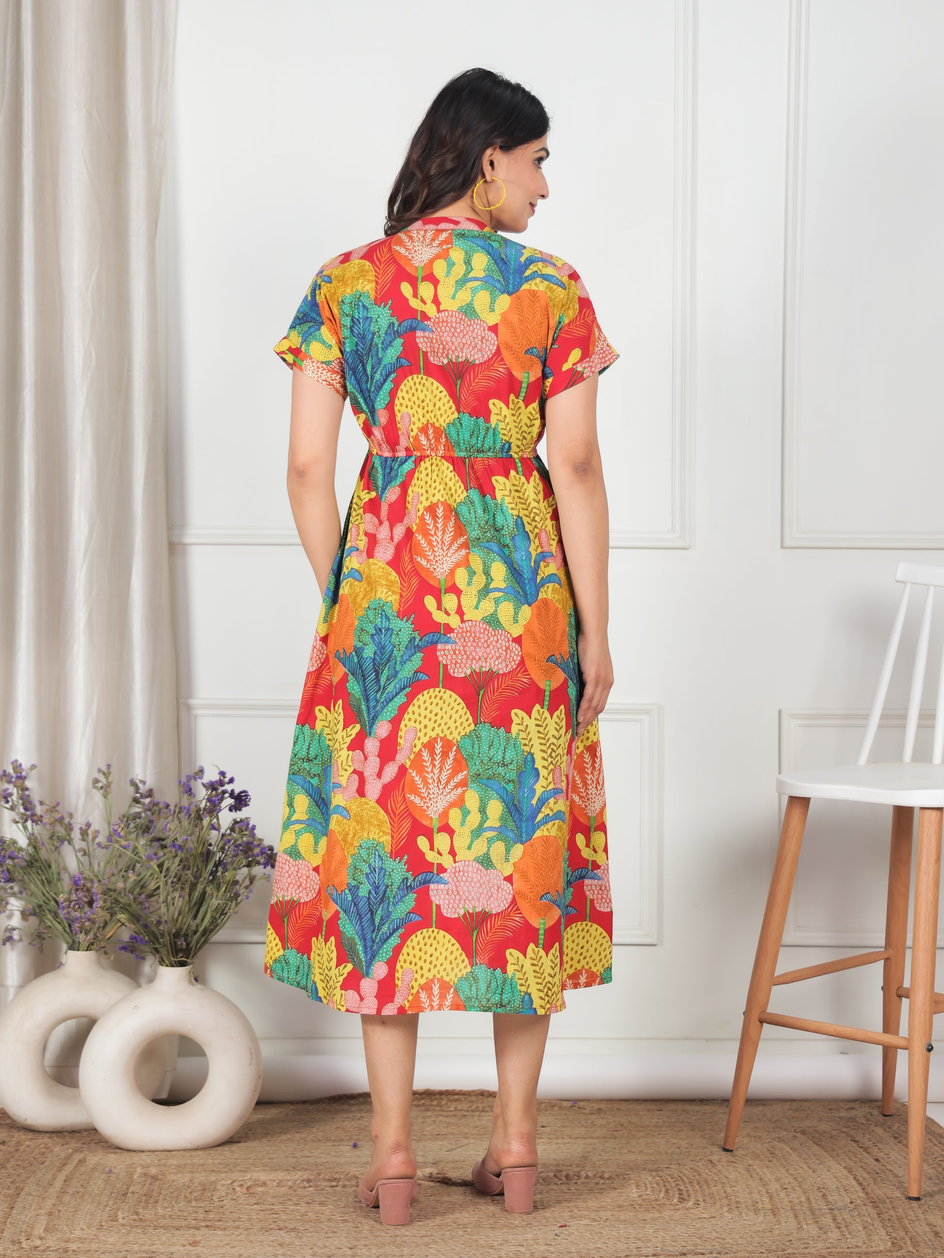This Multicolor dress crafted from soft Soft Cotton is designed for comfort and versatility. The A-line cut and Foliage patterns add a playful vibe, while work accents make it unique. Perfect for holidays, shopping trips, or relaxed evenings. Style with a sling bag and chic sandals. Care is effortless with simple instructions.