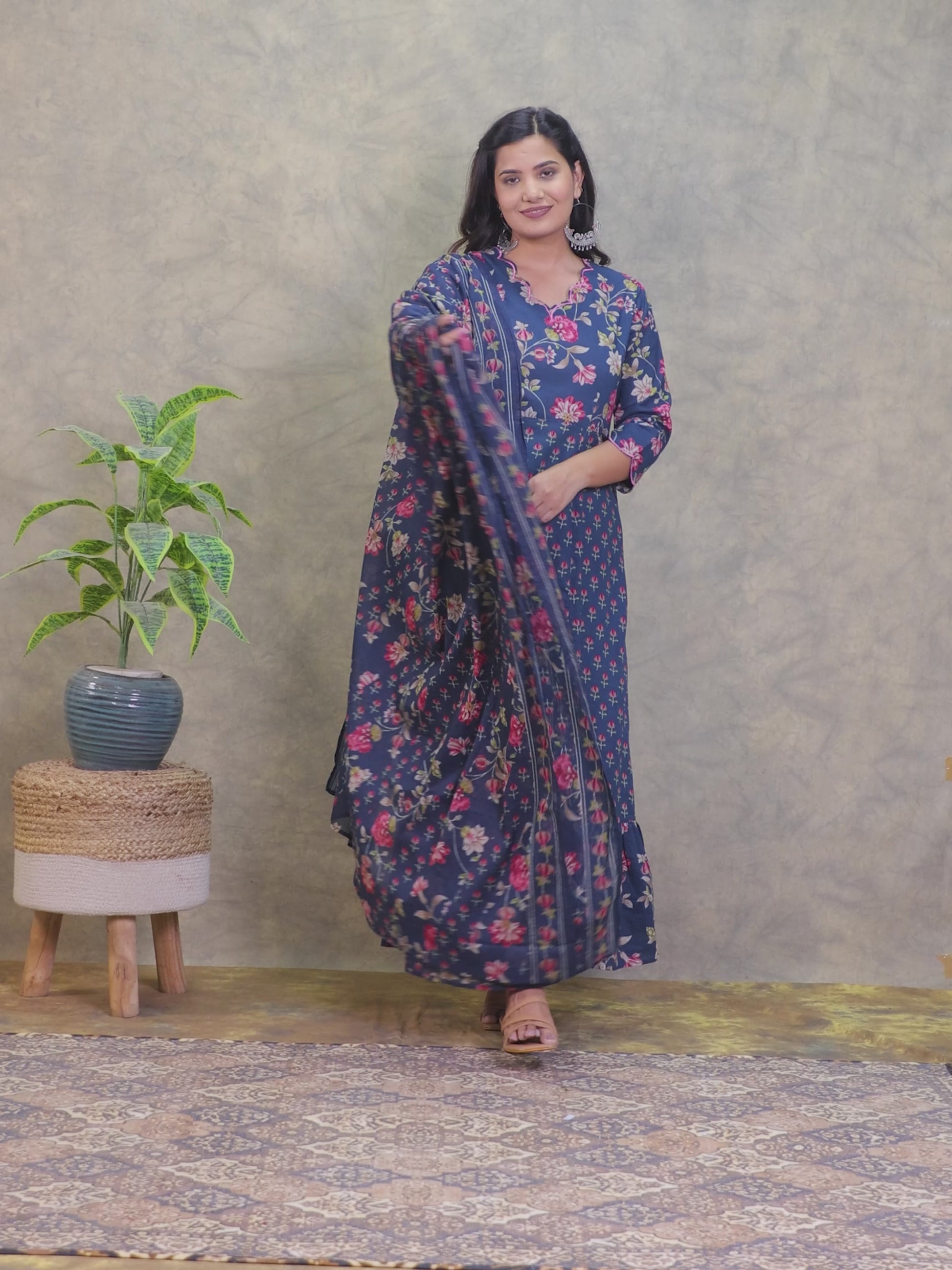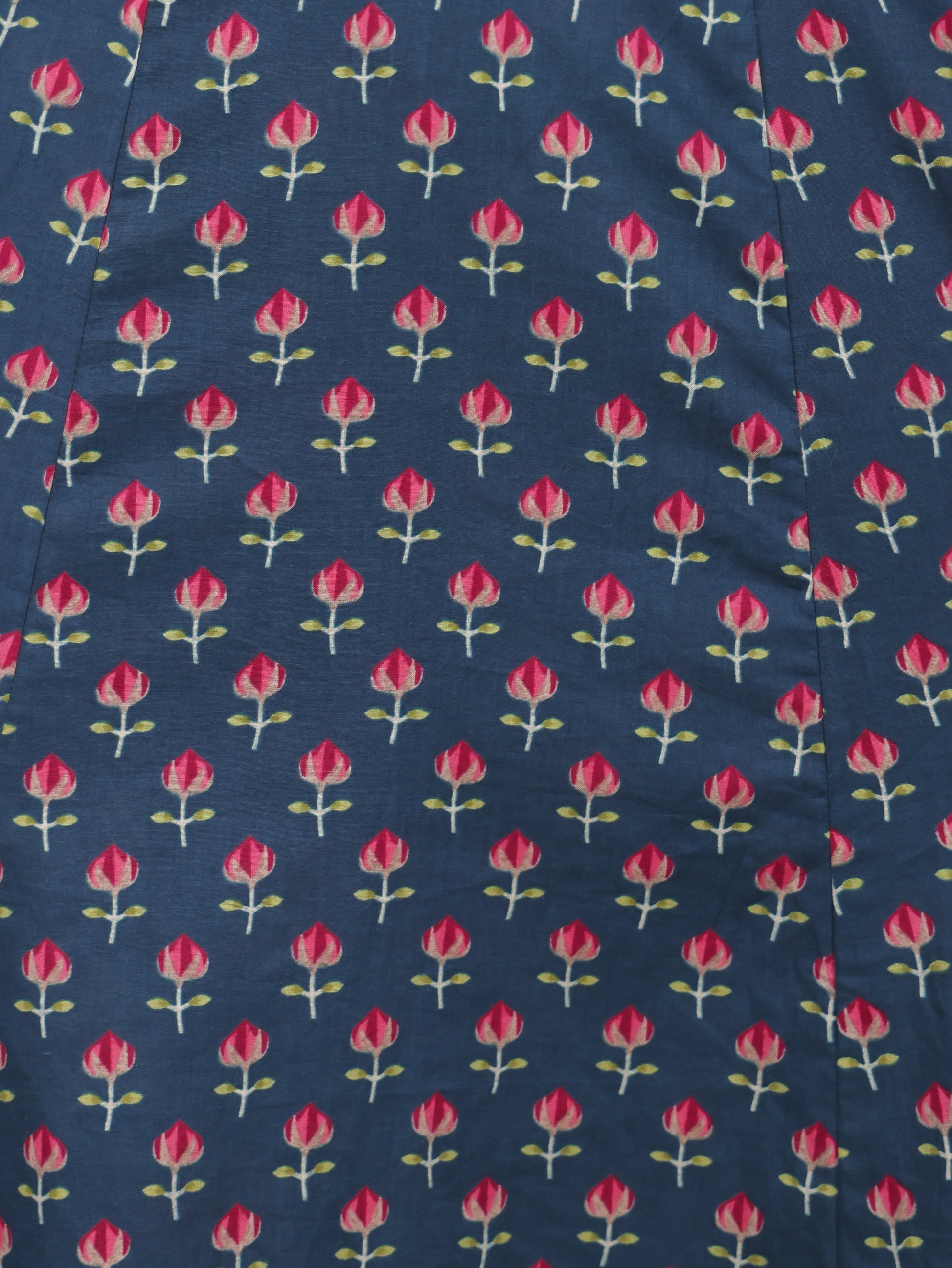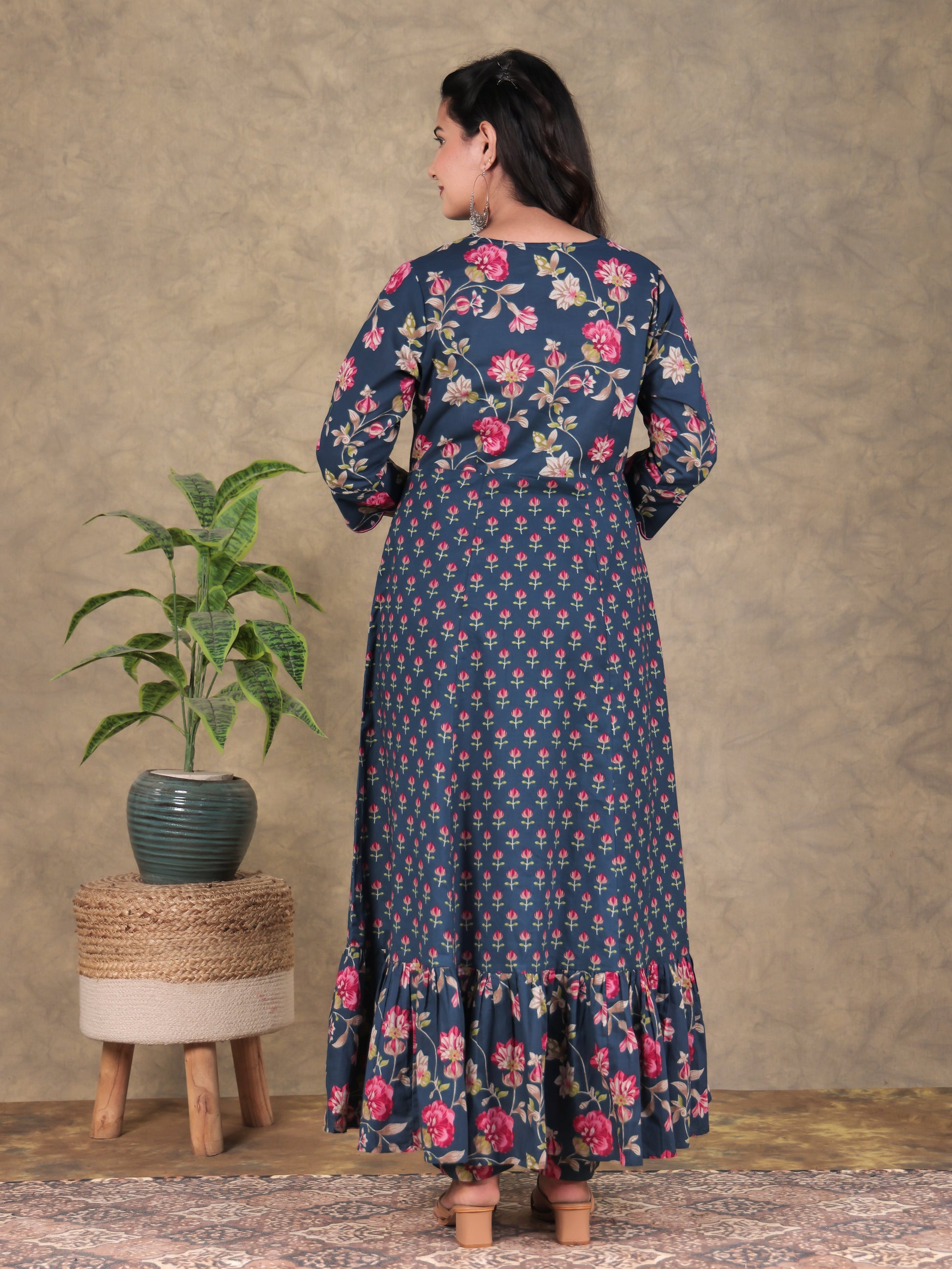 Embroidered Soft Cotton Floral Tiered Navy Blue Dress