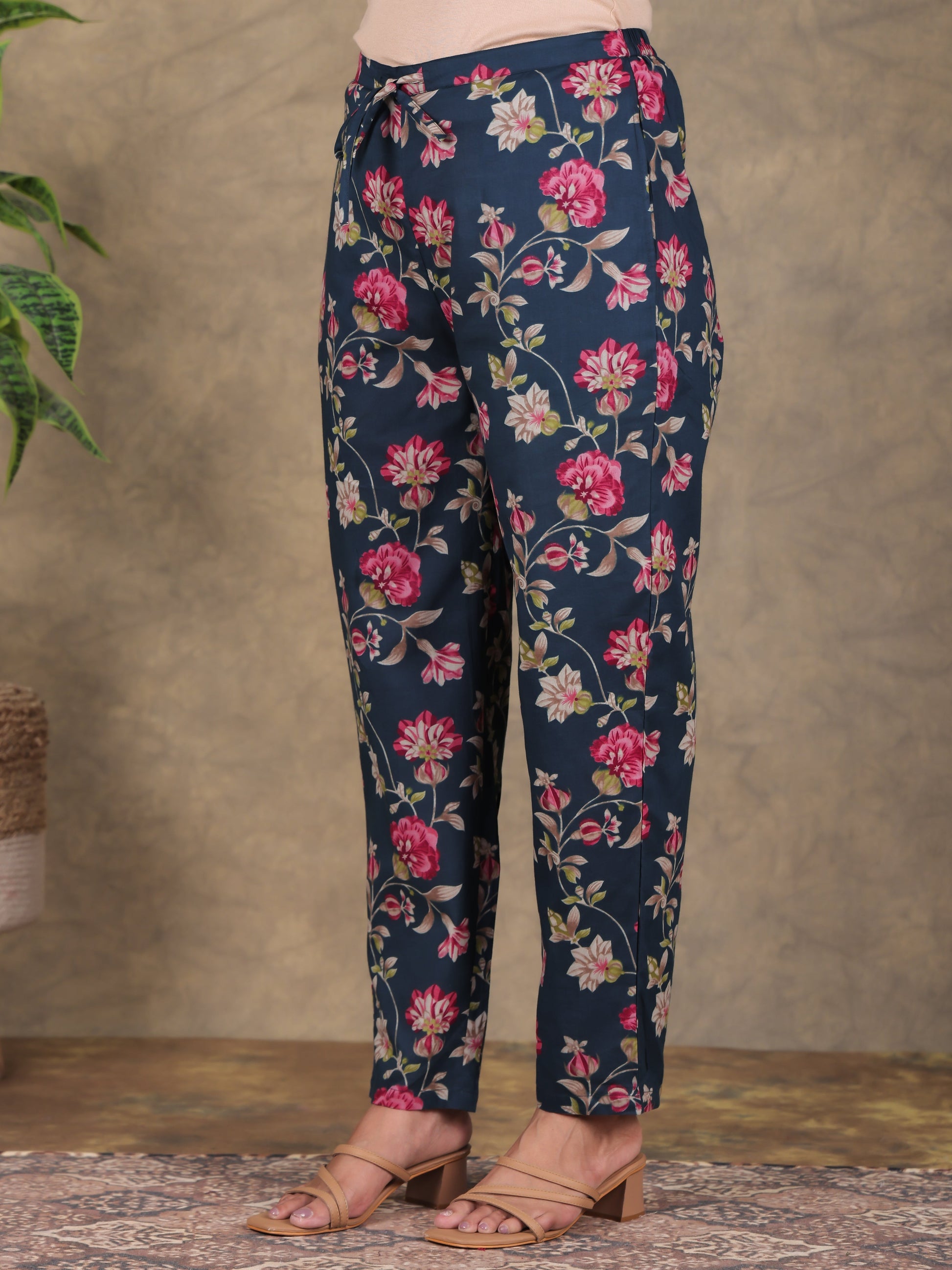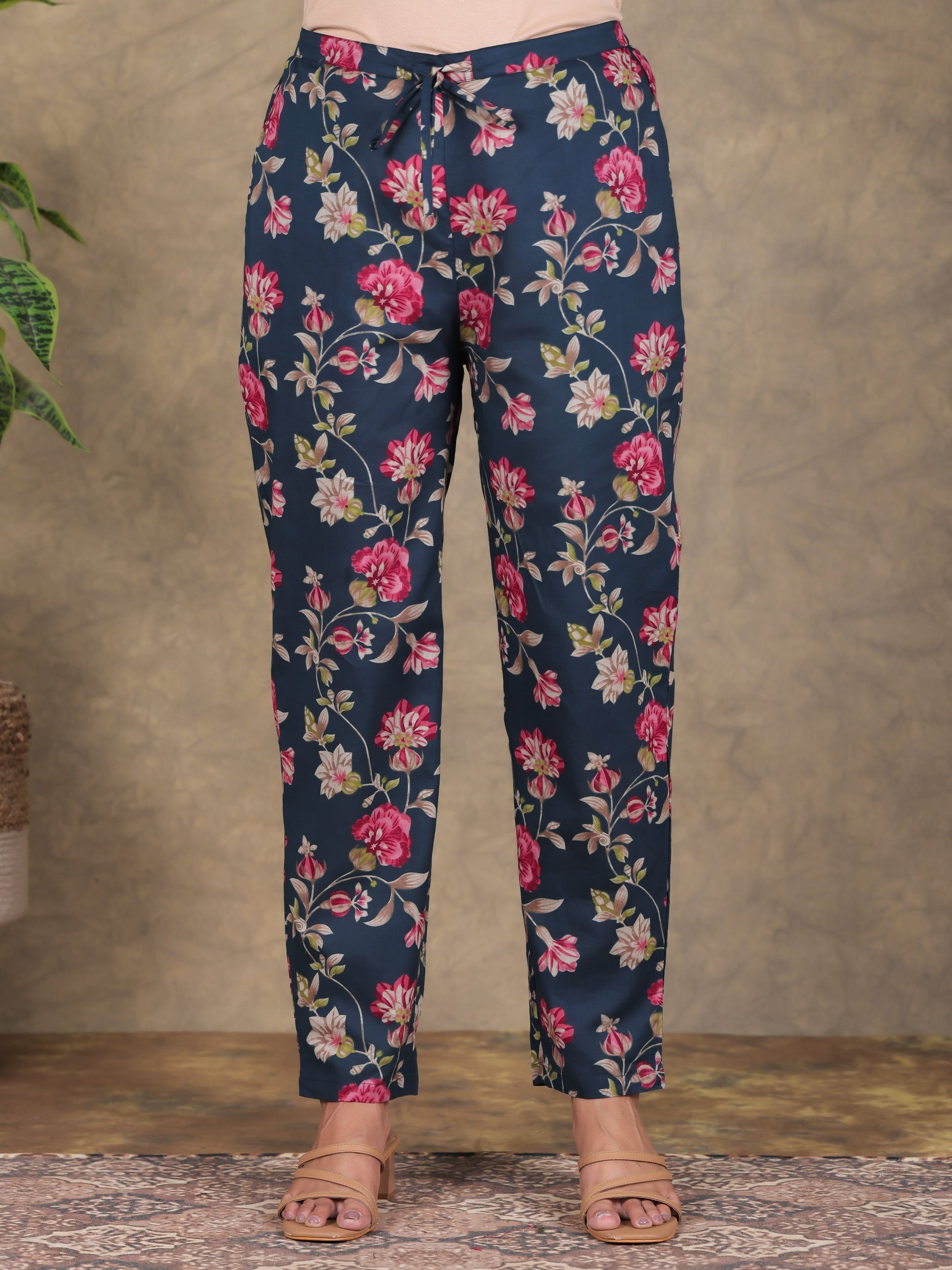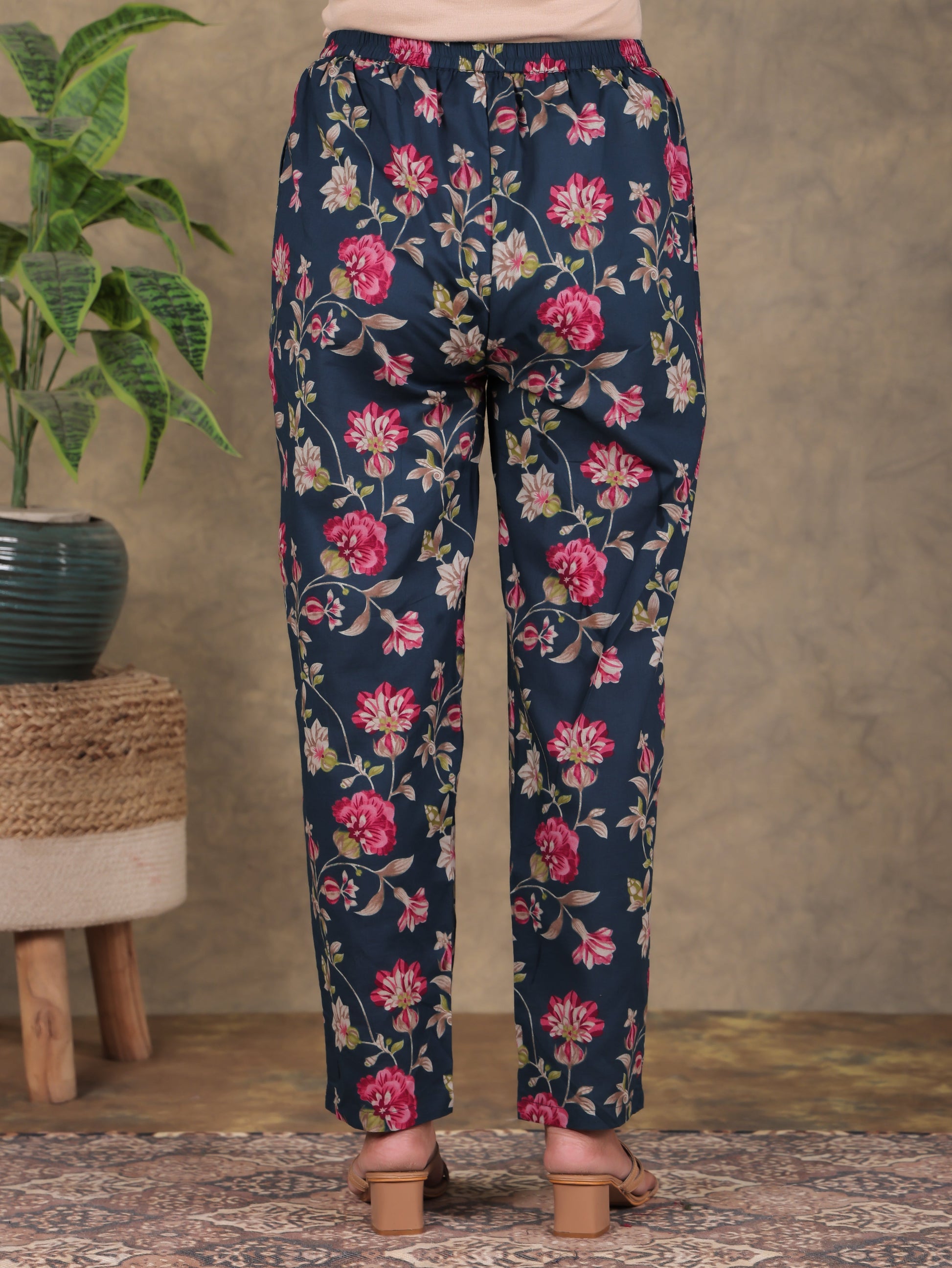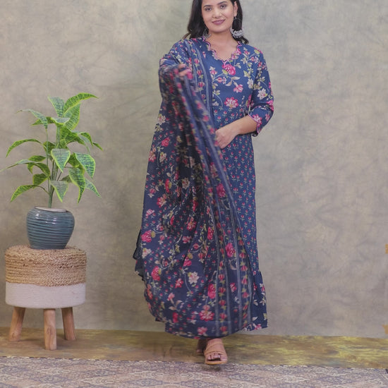 Embroidered Soft Cotton Floral Tiered Navy Blue Dress