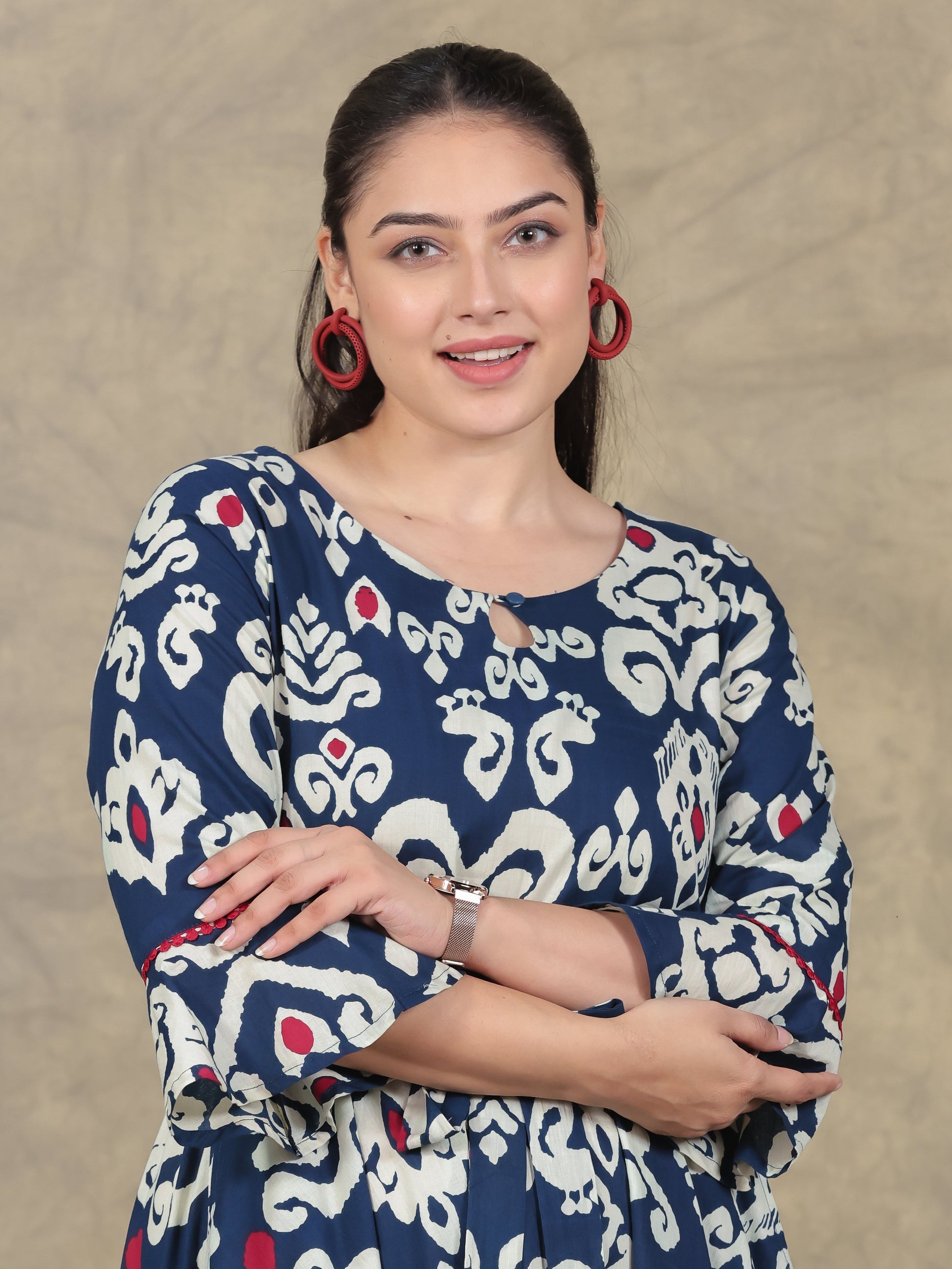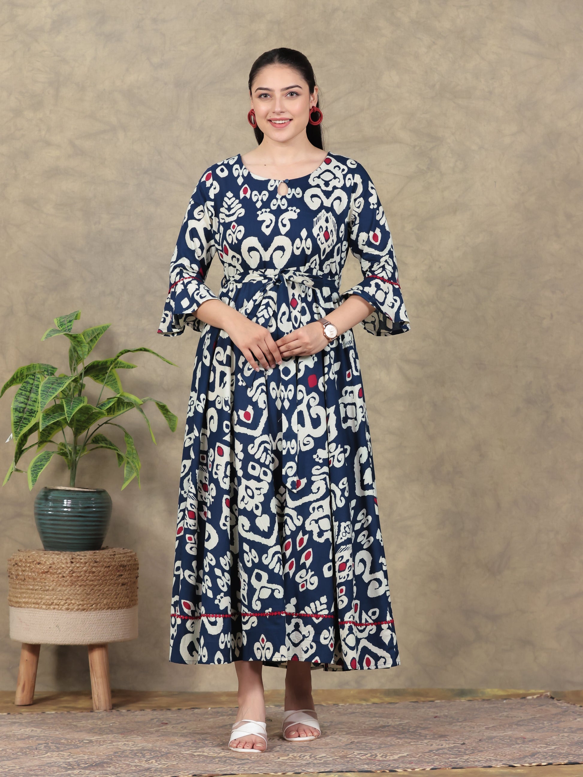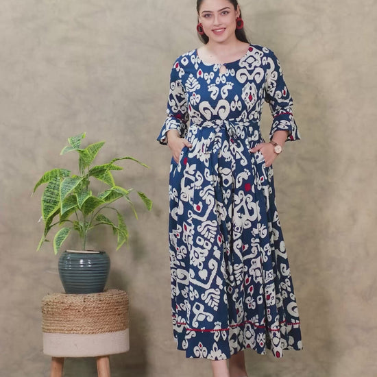 Soft Cotton Ikat Anarkali Navy Blue Dress