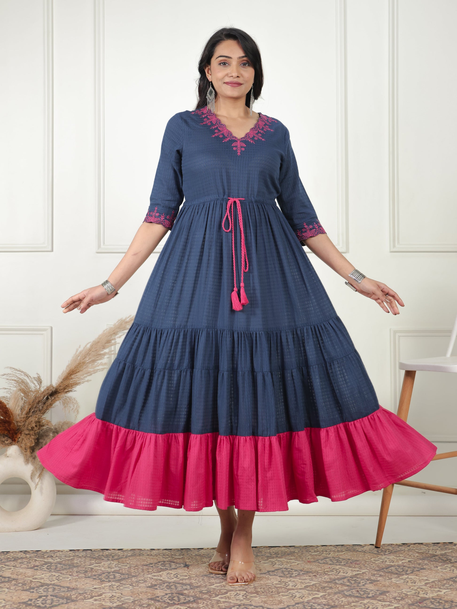 This Navy Blue Tiered dress in Cotton Dobby is perfect for effortless daily wear. The Solid pattern and delicate work bring a modern yet artisanal touch. Lightweight and breathable, it’s ideal for warm days or casual outings. Pair with sandals or sneakers for a relaxed vibe. Easy to care for ensures hassle-free upkeep.
