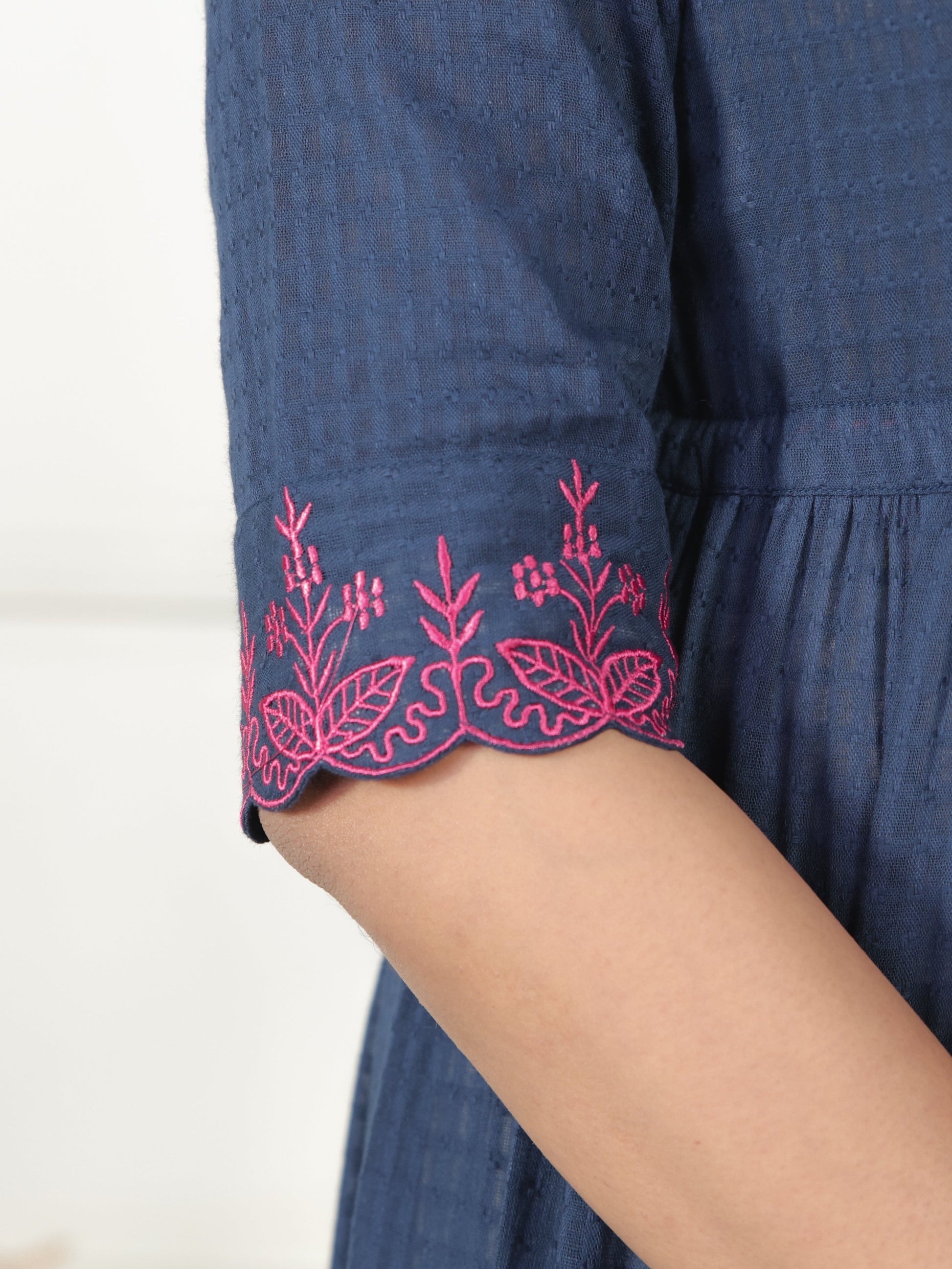 Embroidered Cotton Dobby Solid Anarkali Navy Blue Dress
