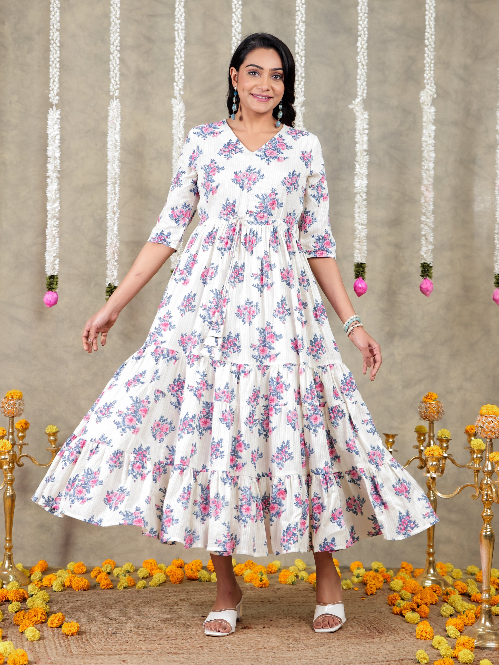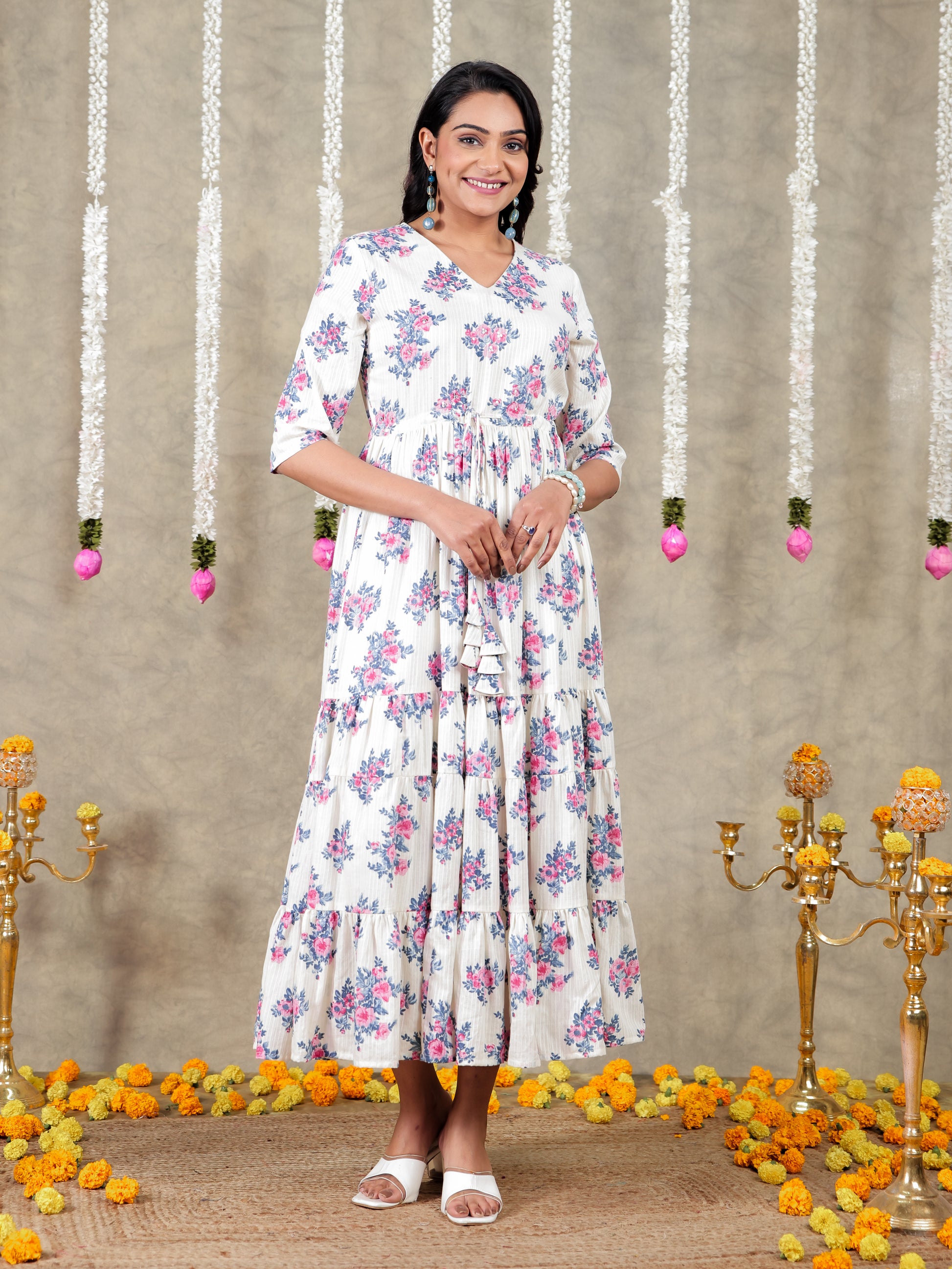 Embroidered Cotton Dobby Floral A-line Off White Dress