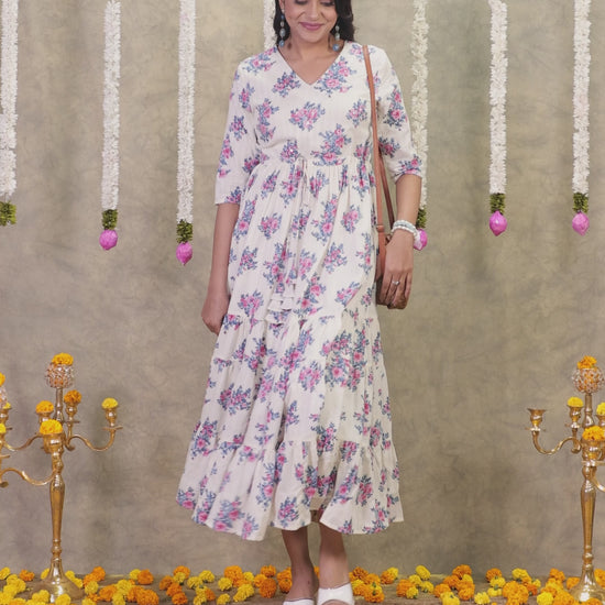 This Off White dress crafted from soft Cotton Dobby is designed for comfort and versatility. The A-line cut and Floral patterns add a playful vibe, while work accents make it unique. Perfect for holidays, shopping trips, or relaxed evenings. Style with a sling bag and chic sandals. Care is effortless with simple instructions.