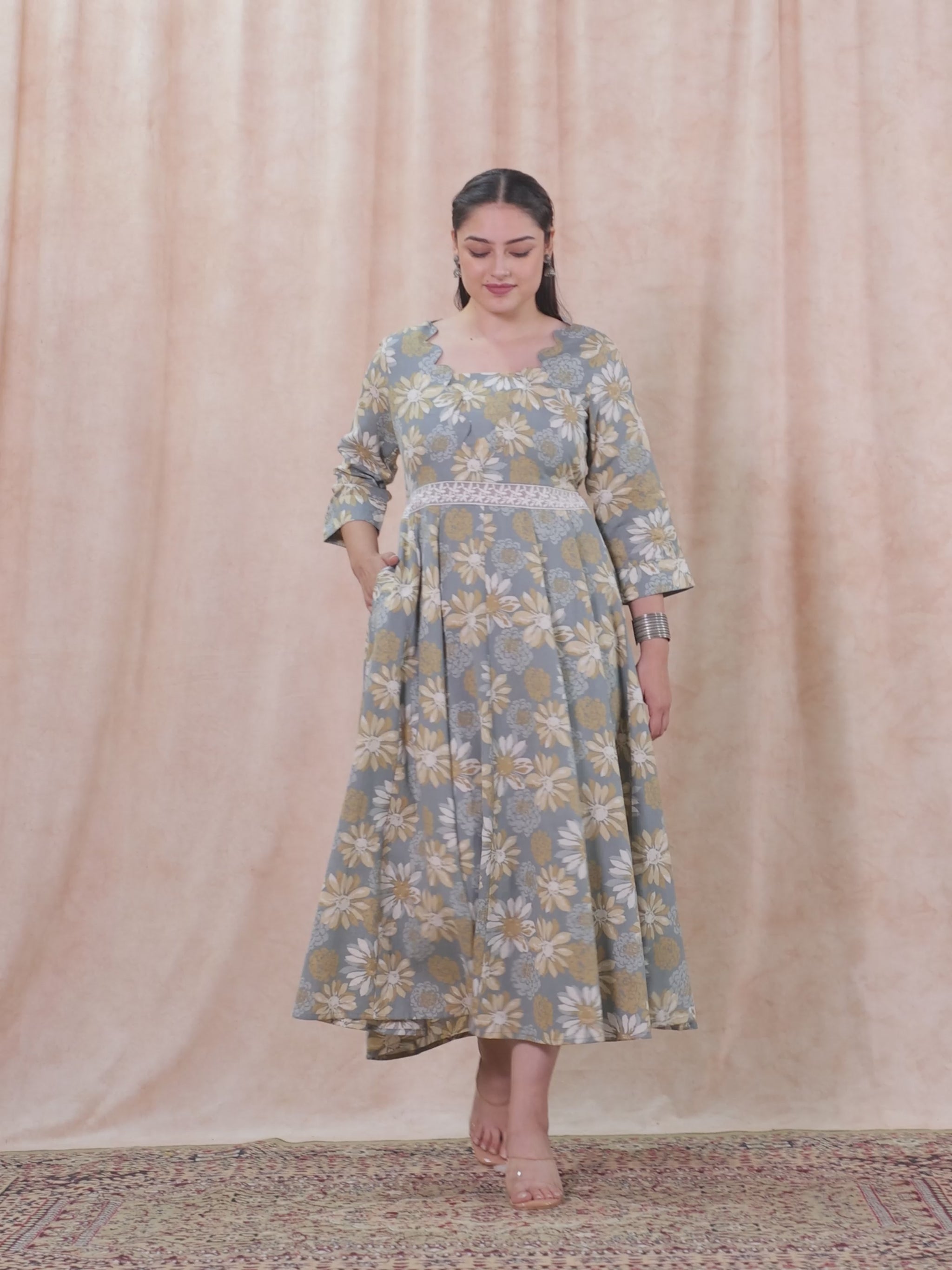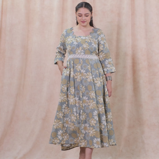 Linen Cotton Floral Flared Off White Dress
