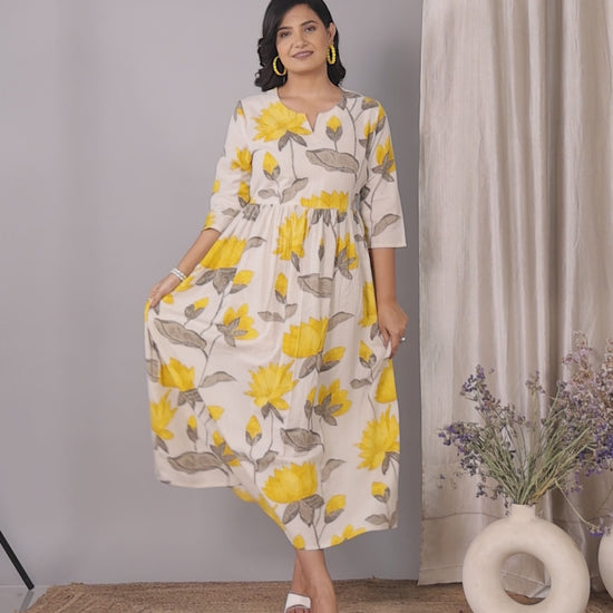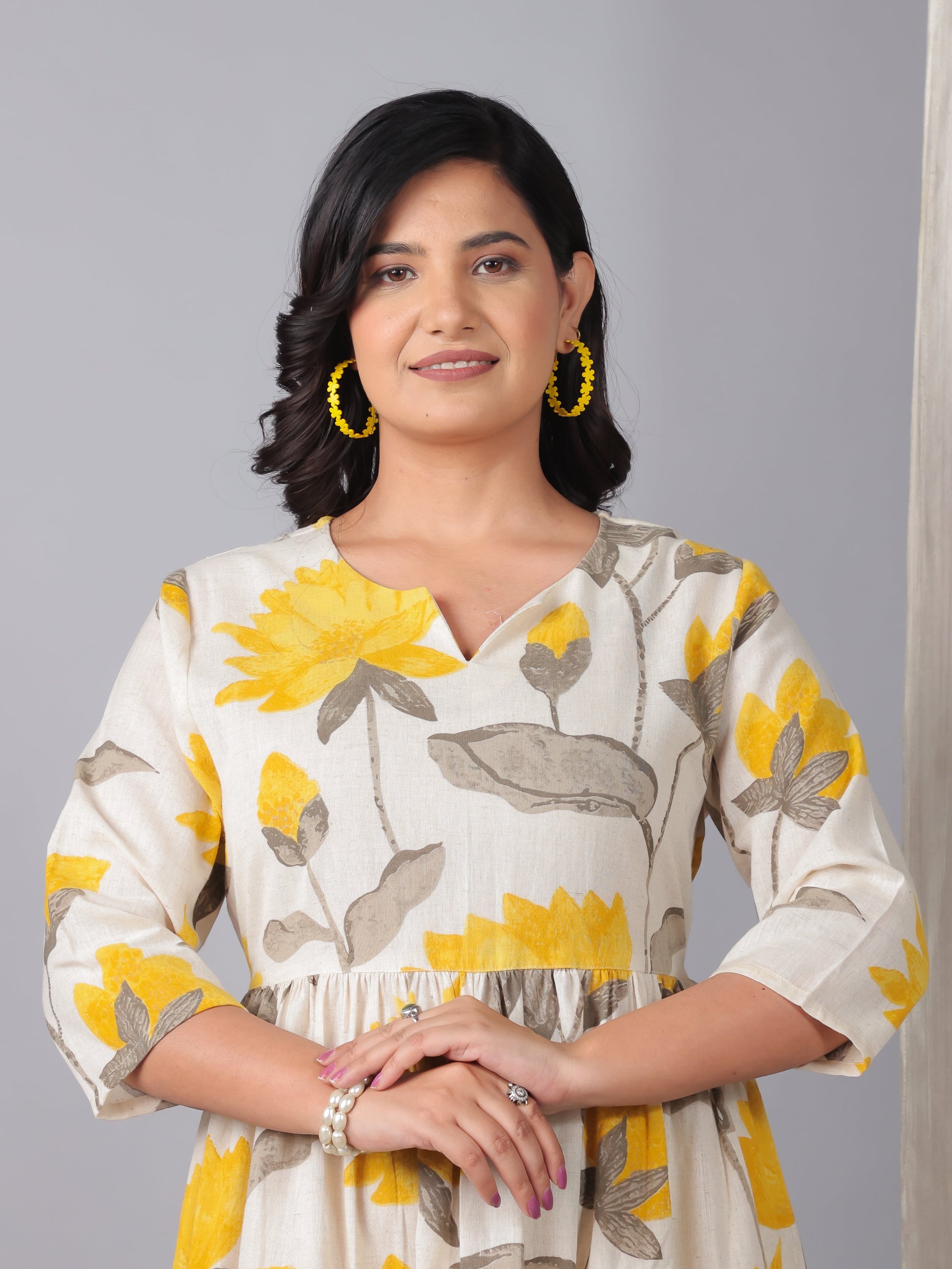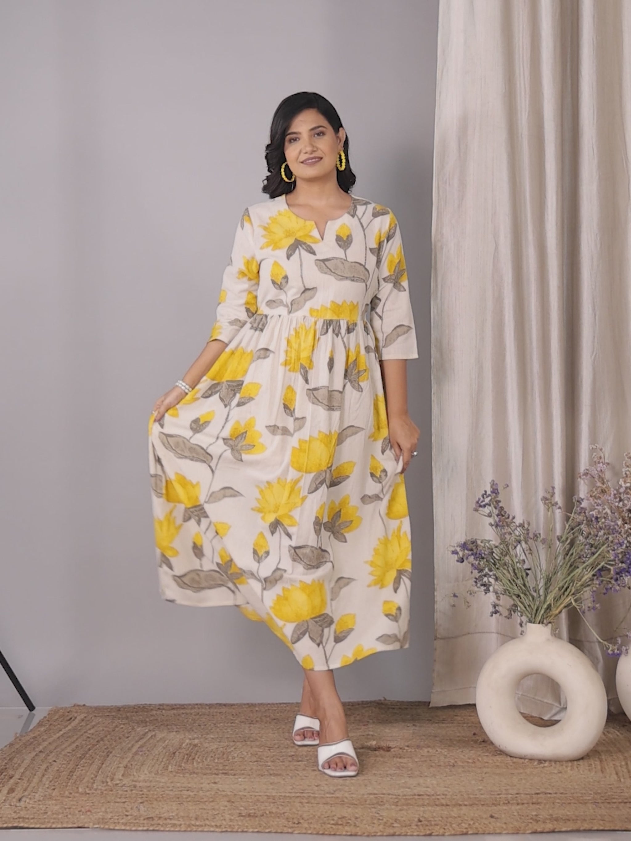 Add a stylish staple to your wardrobe with this Gathered dress in Off White. The breathable Linen Cotton fabric keeps you comfortable all day, while the Floral motifs and subtle work elements create a sophisticated charm. Dress it up with heels or keep it casual with flats.