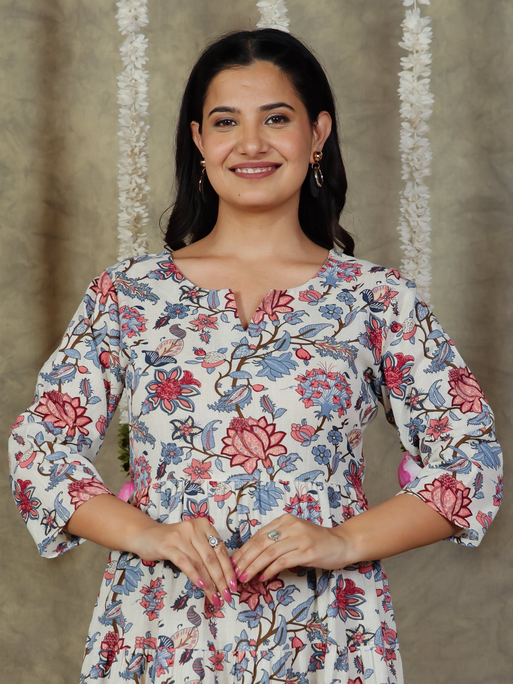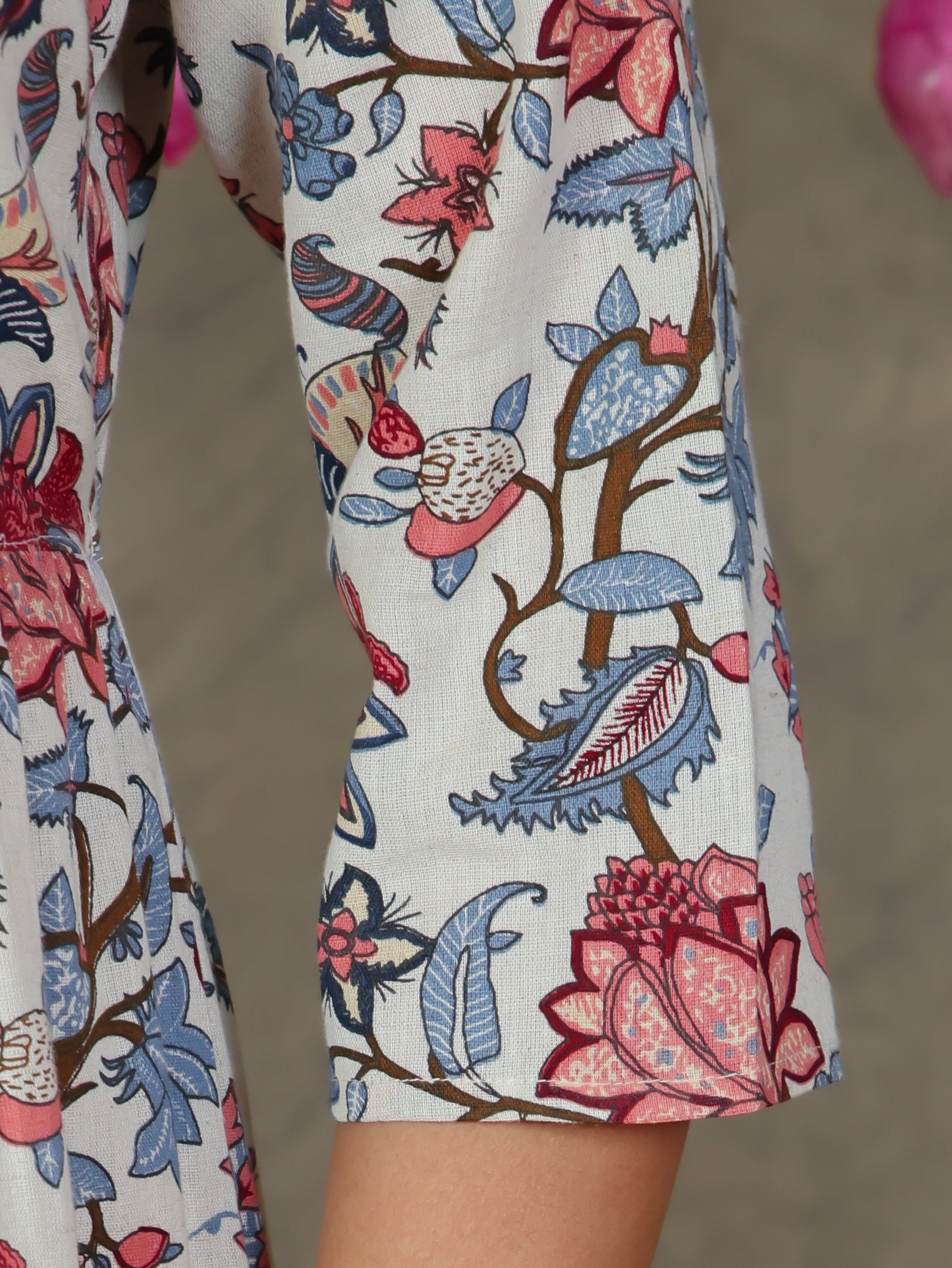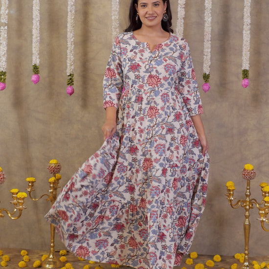 This Off White dress crafted from soft Linen Cotton is designed for comfort and versatility. The Anarkali cut and Floral patterns add a playful vibe, while work accents make it unique. Perfect for holidays, shopping trips, or relaxed evenings. Style with a sling bag and chic sandals. Care is effortless with simple instructions.
