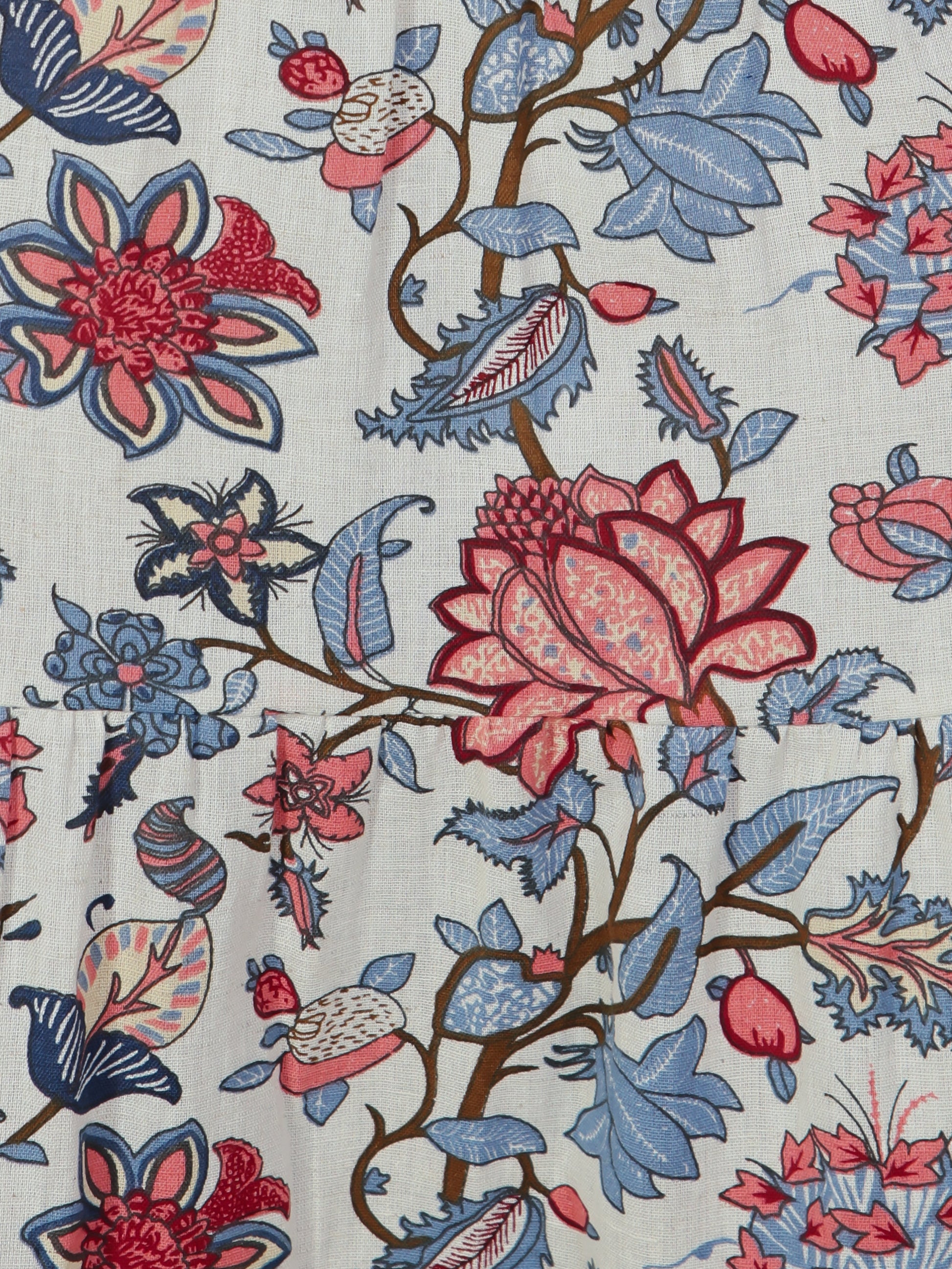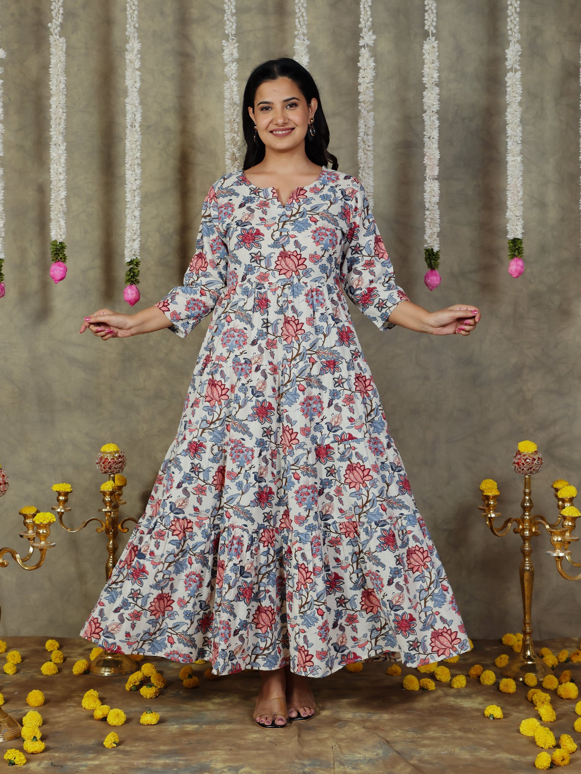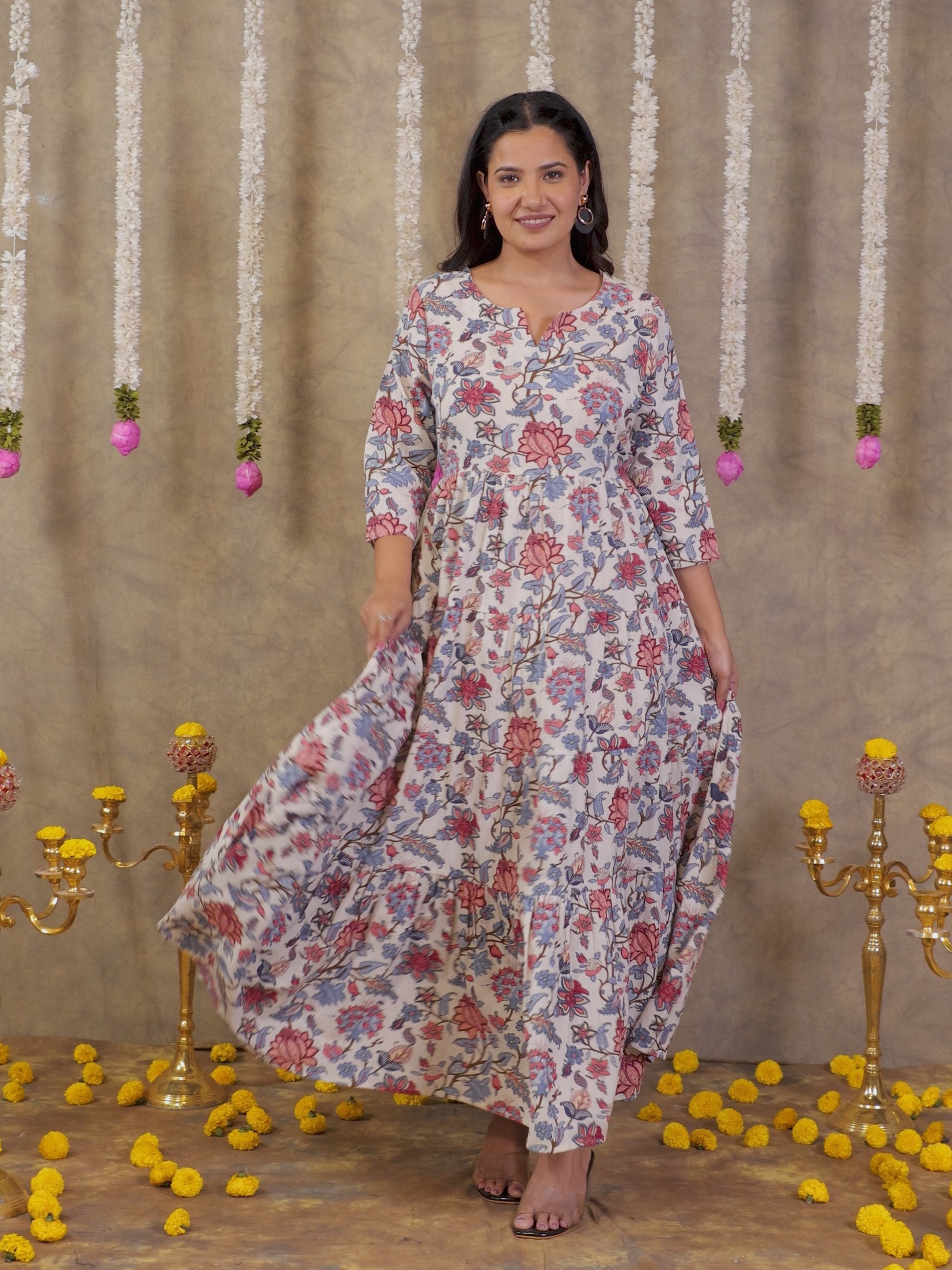 This Off White dress crafted from soft Linen Cotton is designed for comfort and versatility. The Anarkali cut and Floral patterns add a playful vibe, while work accents make it unique. Perfect for holidays, shopping trips, or relaxed evenings. Style with a sling bag and chic sandals. Care is effortless with simple instructions.