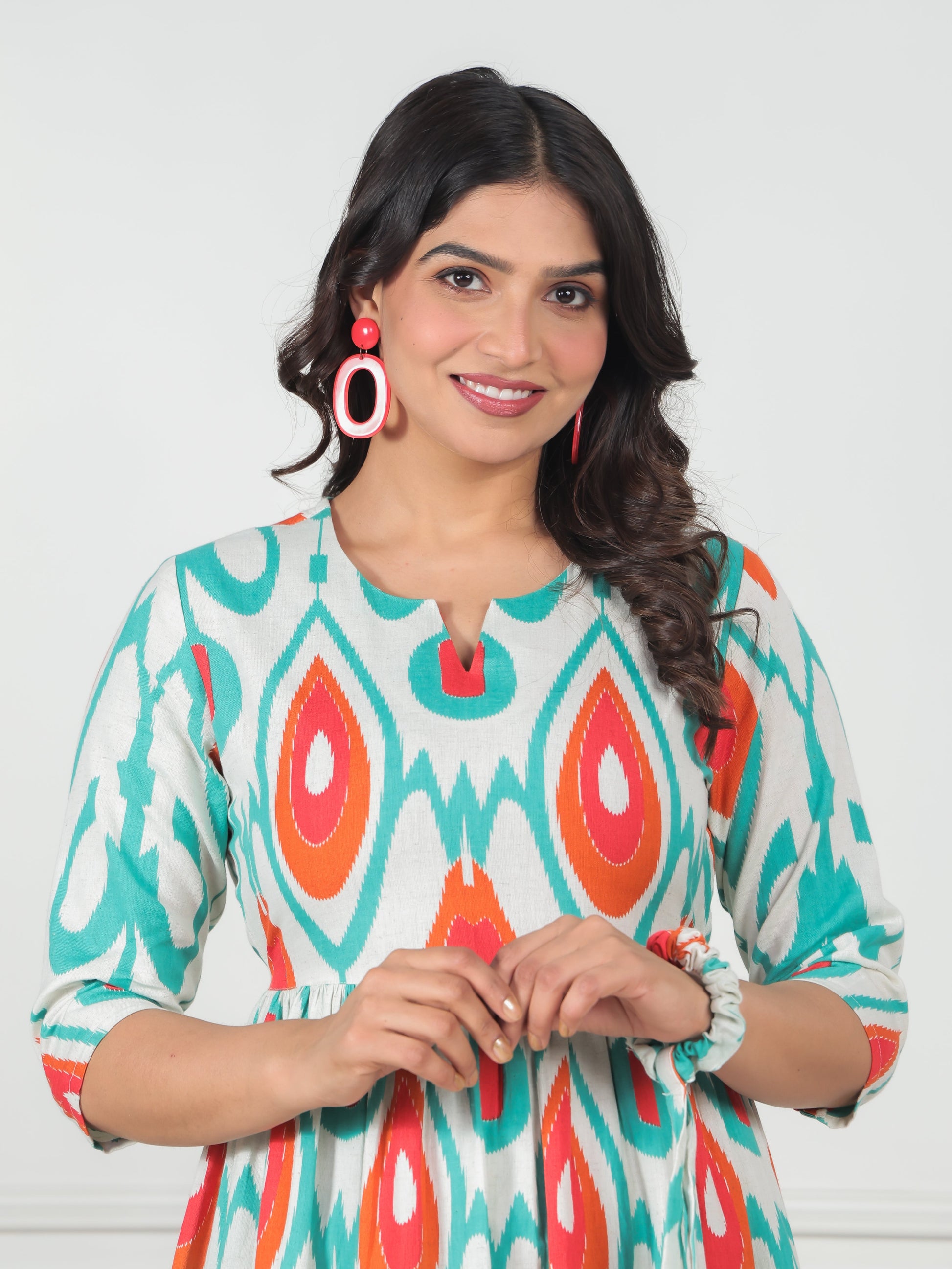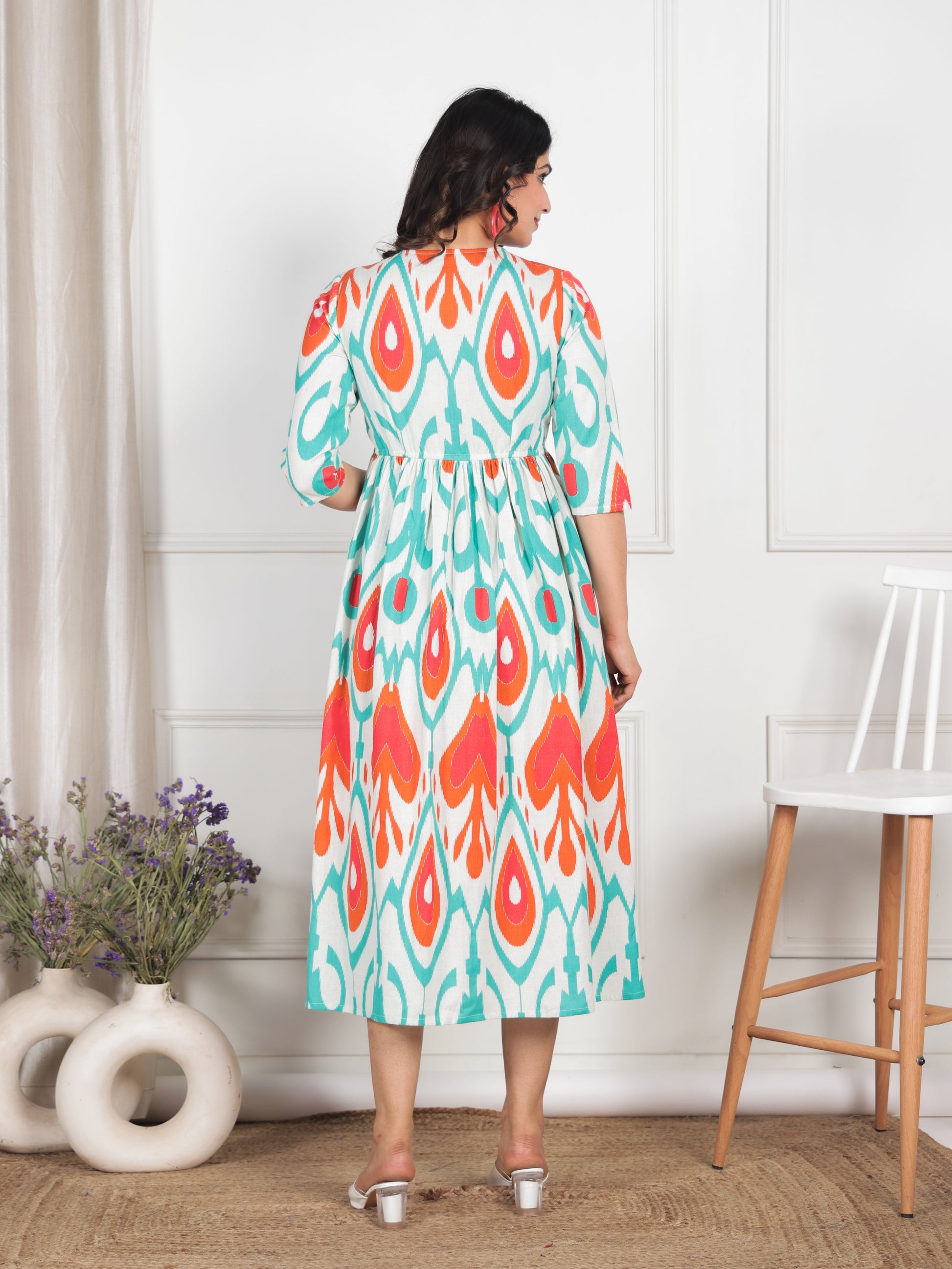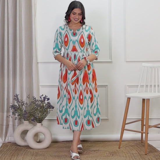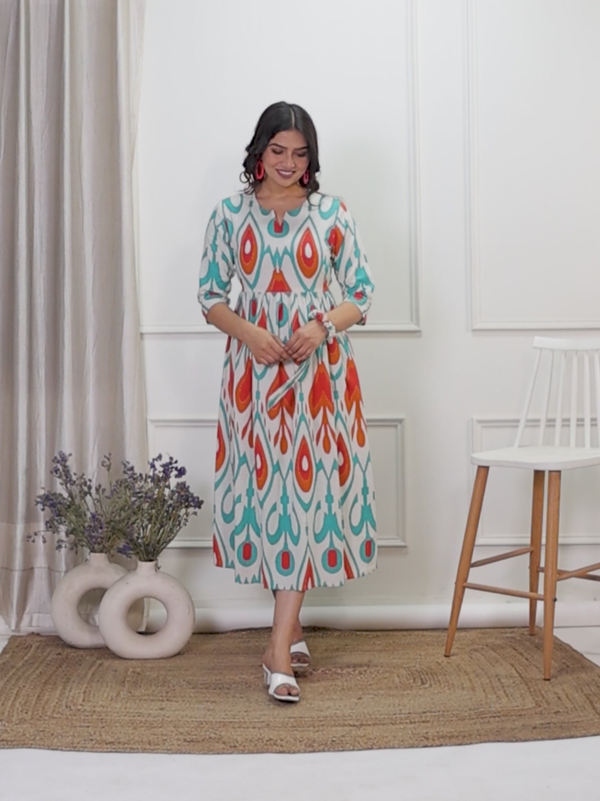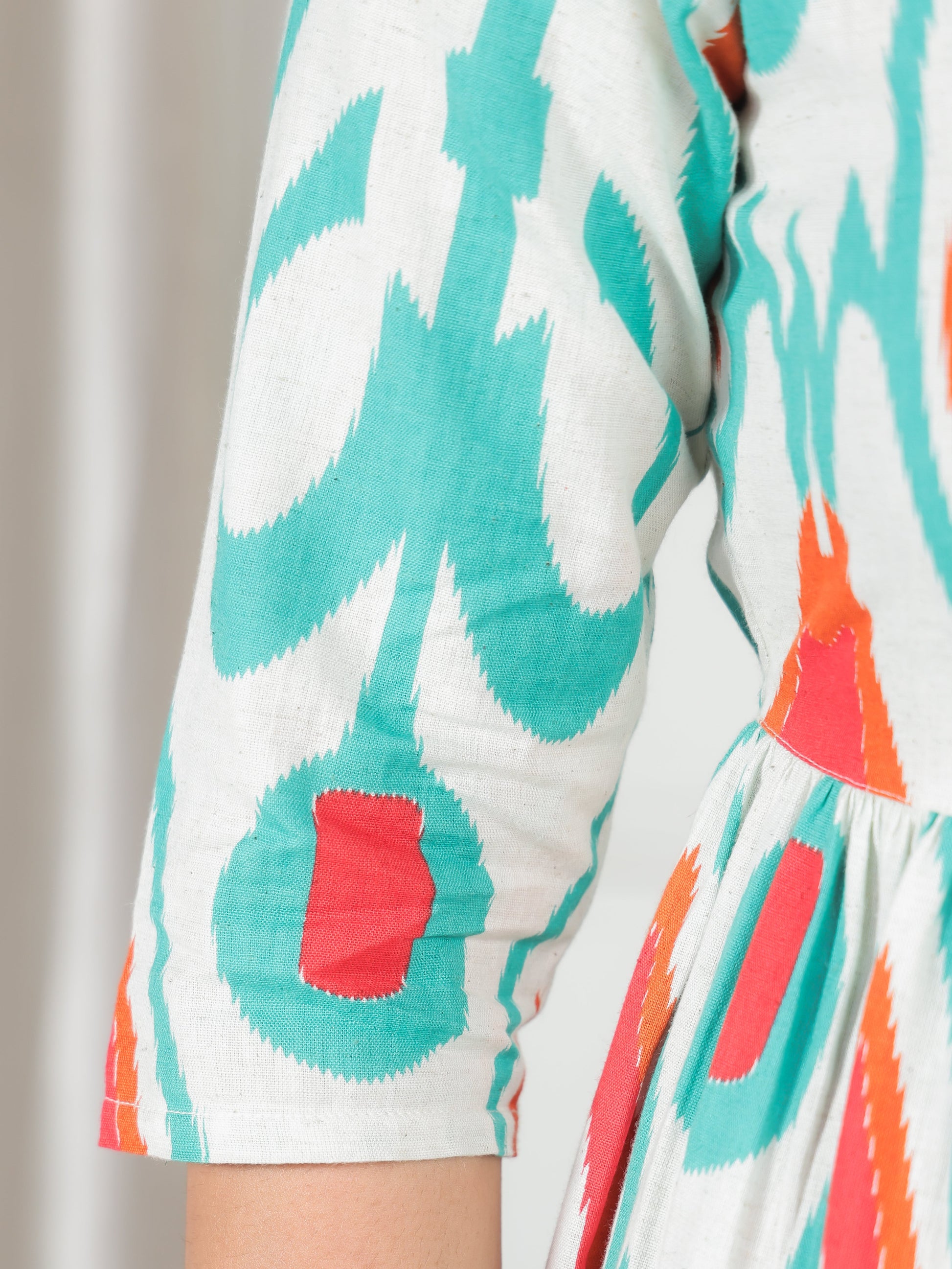 Add a stylish staple to your wardrobe with this Gathered dress in Off White. The breathable Linen Cotton fabric keeps you comfortable all day, while the Geometric motifs and subtle work elements create a sophisticated charm. Dress it up with heels or keep it casual with flats.