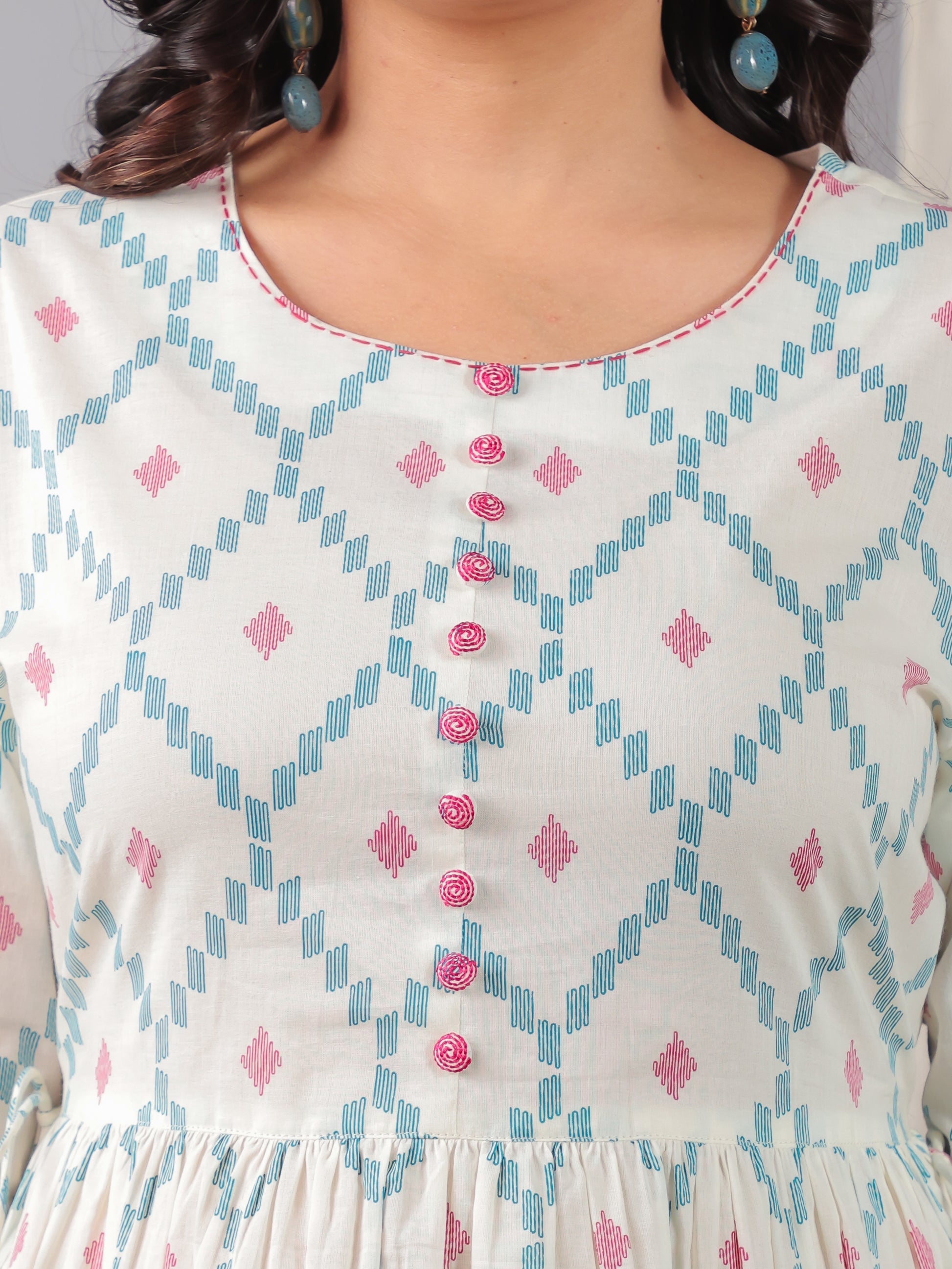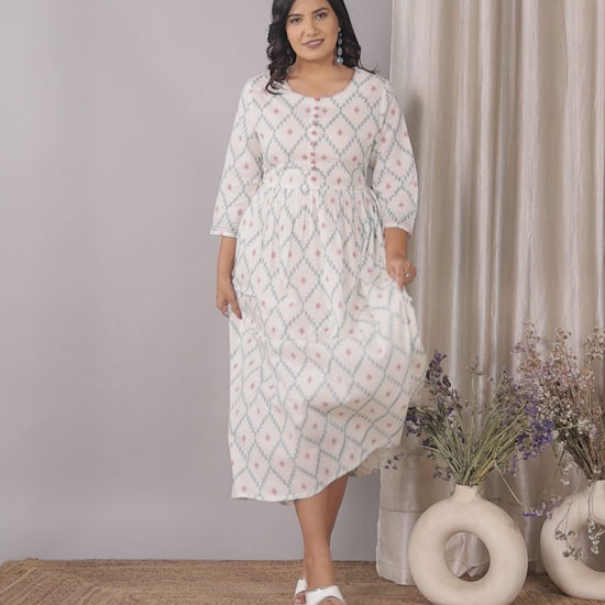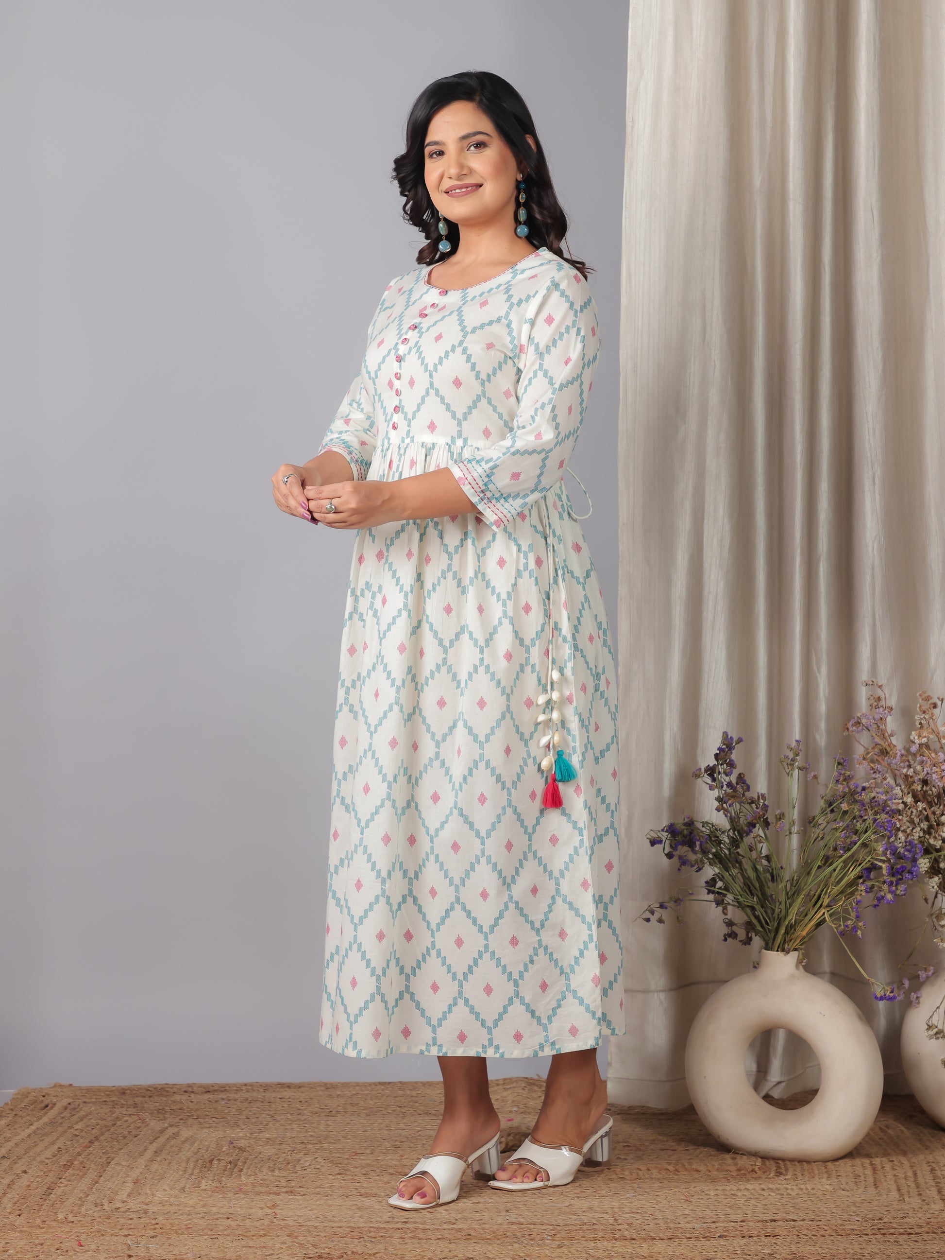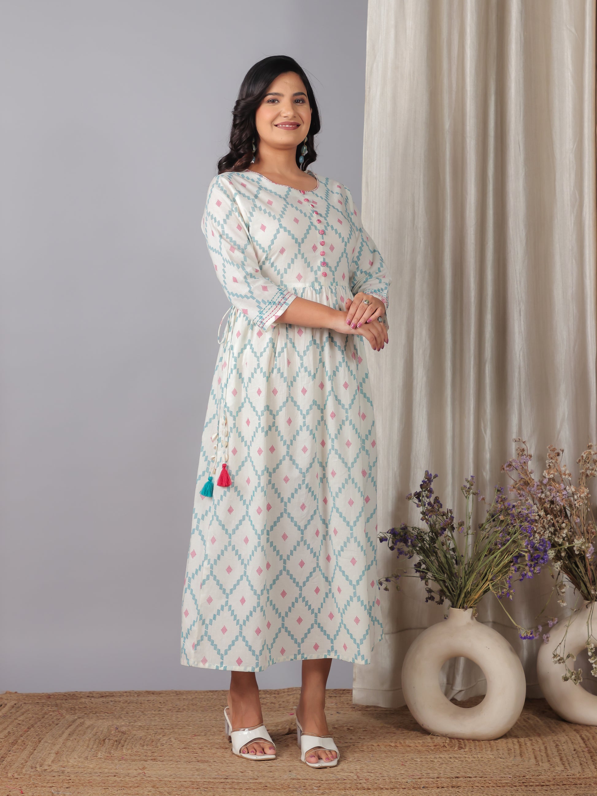 Embroidered Soft Cotton Geometric A-line Off White Dress