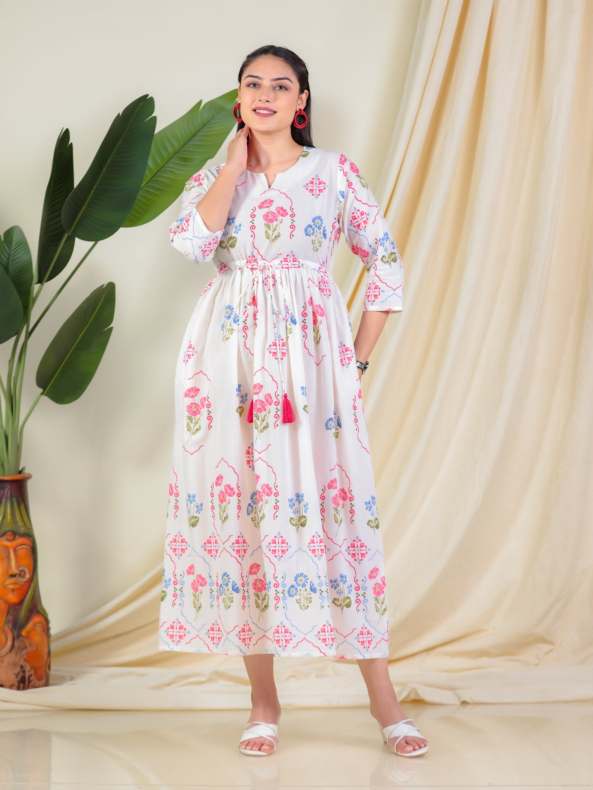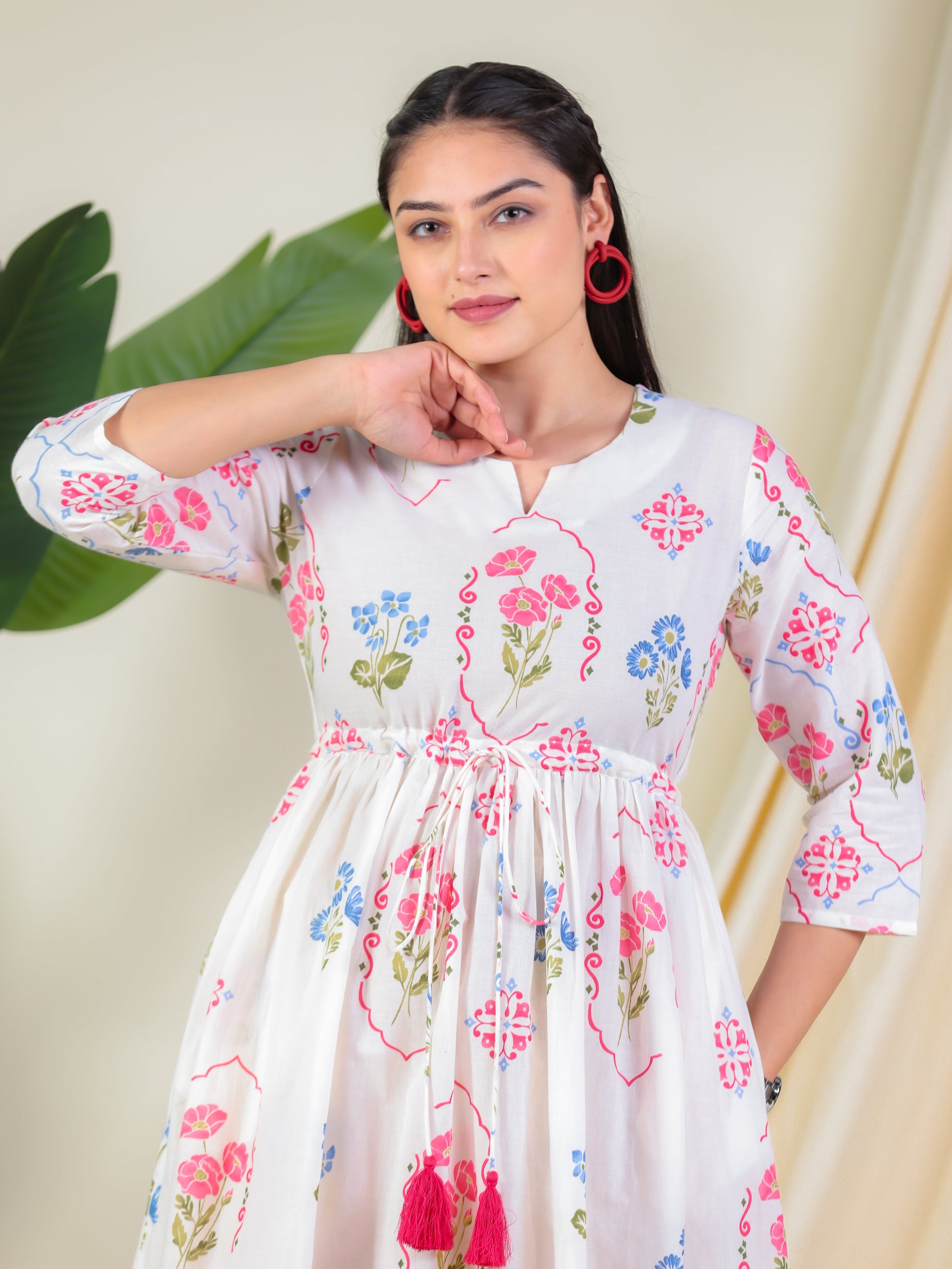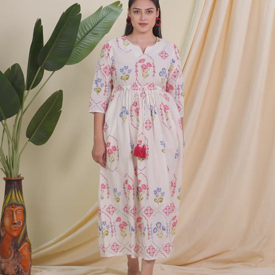 Soft Cotton Geometric Anarkali Off White Dress