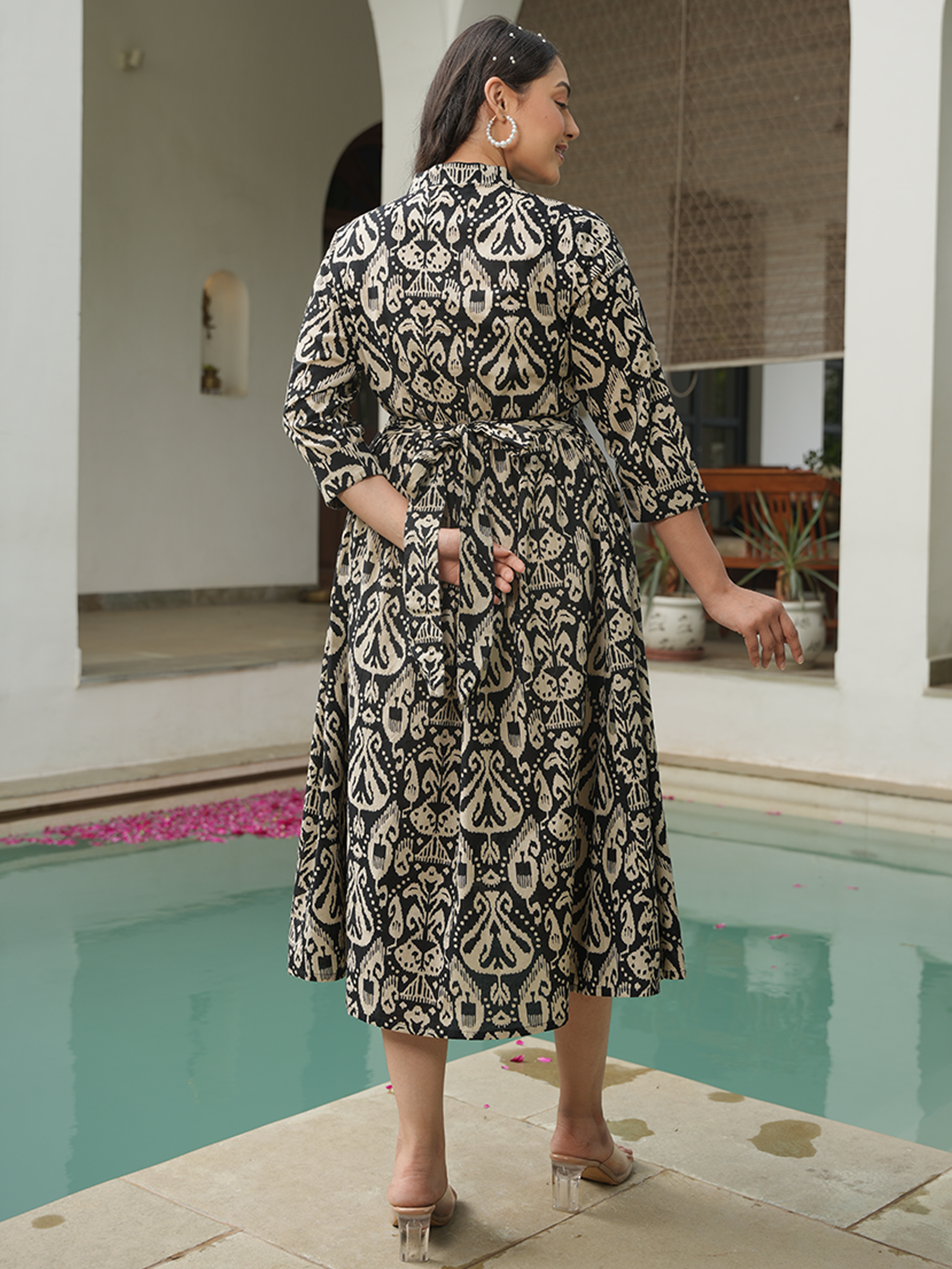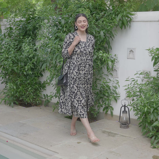 This Black dress crafted from soft Soft Cotton is designed for comfort and versatility. The Gathered cut and Ikat patterns add a playful vibe, while work accents make it unique. Perfect for holidays, shopping trips, or relaxed evenings. Style with a sling bag and chic sandals. Care is effortless with simple instructions.