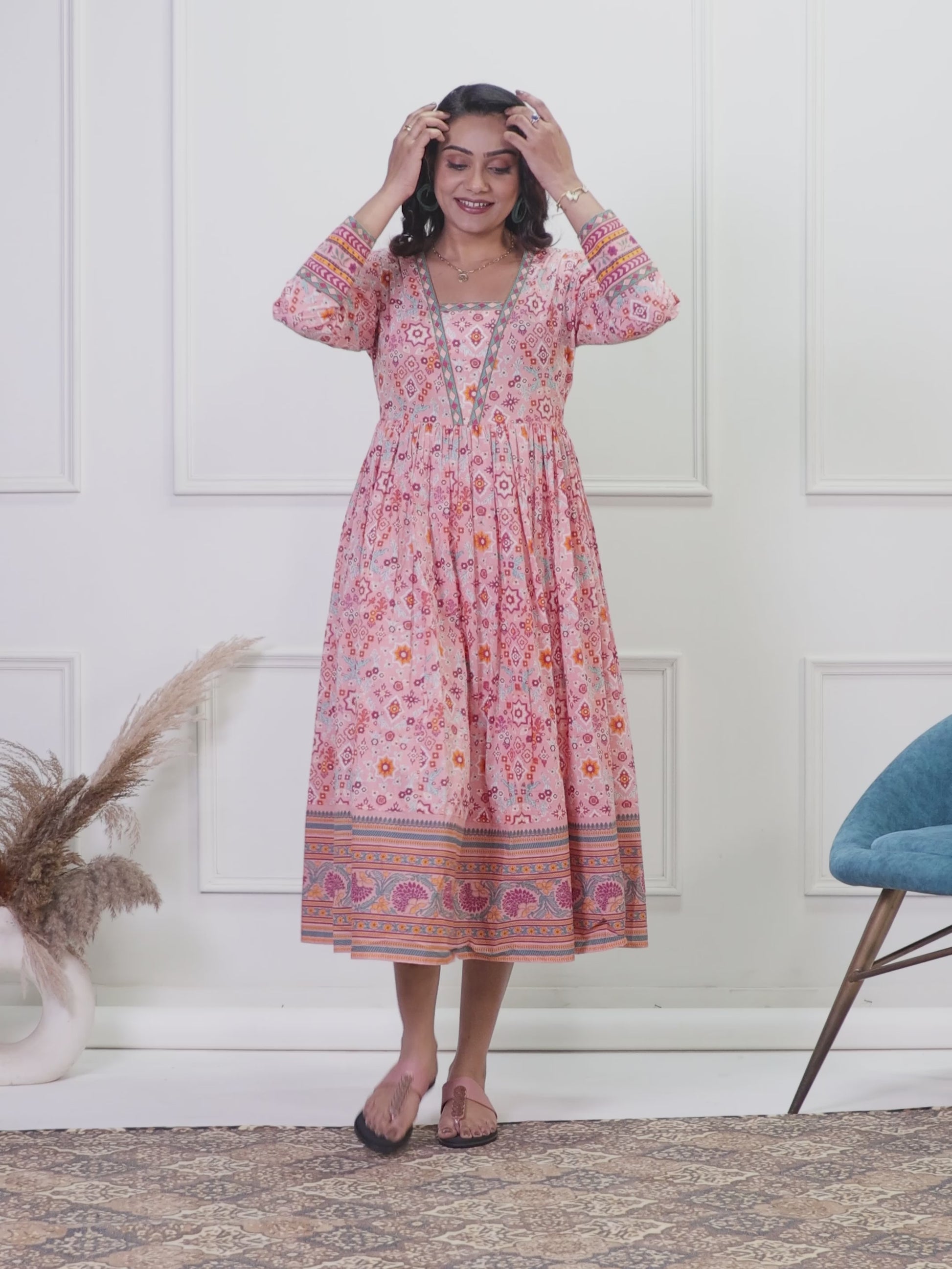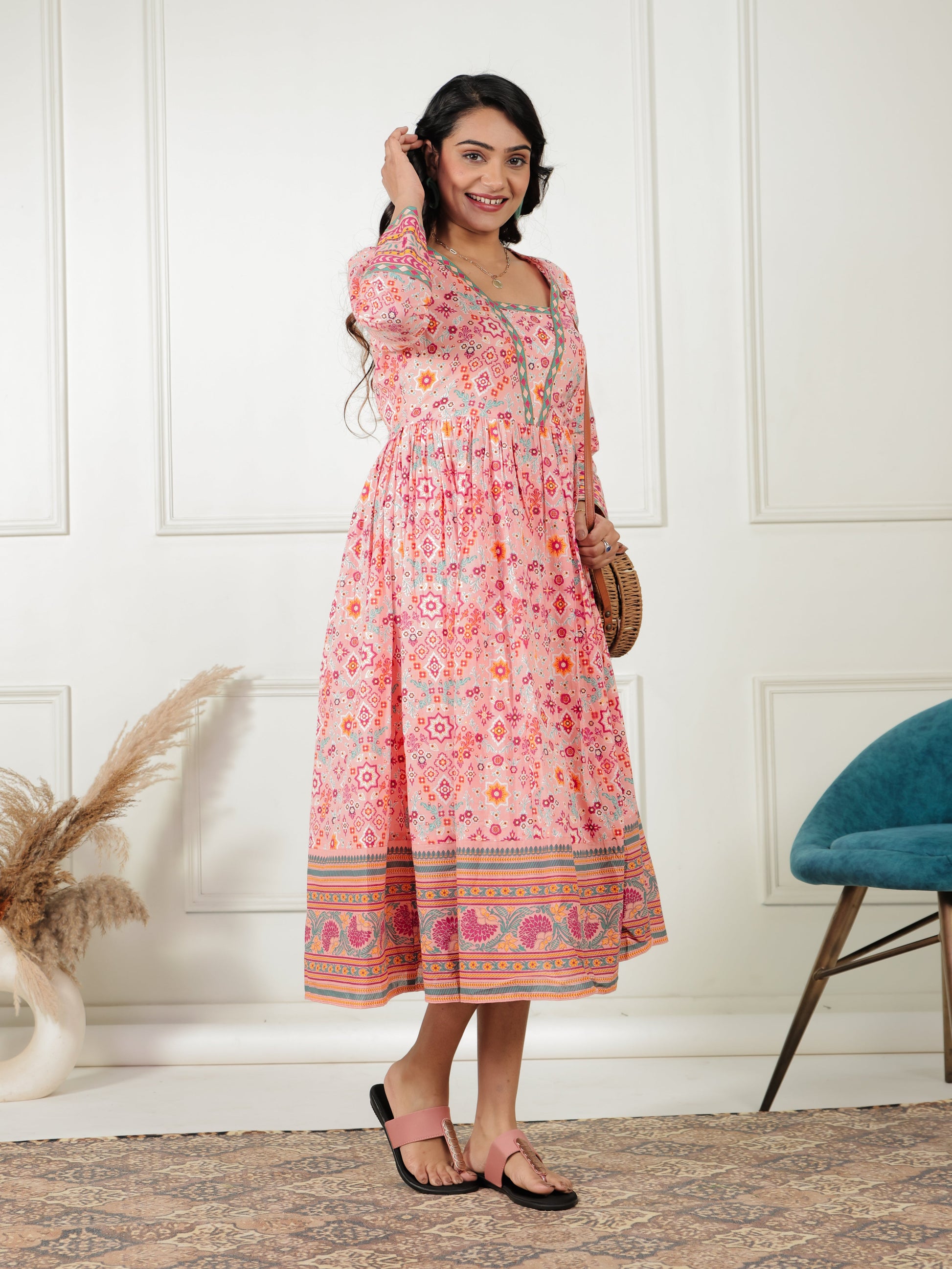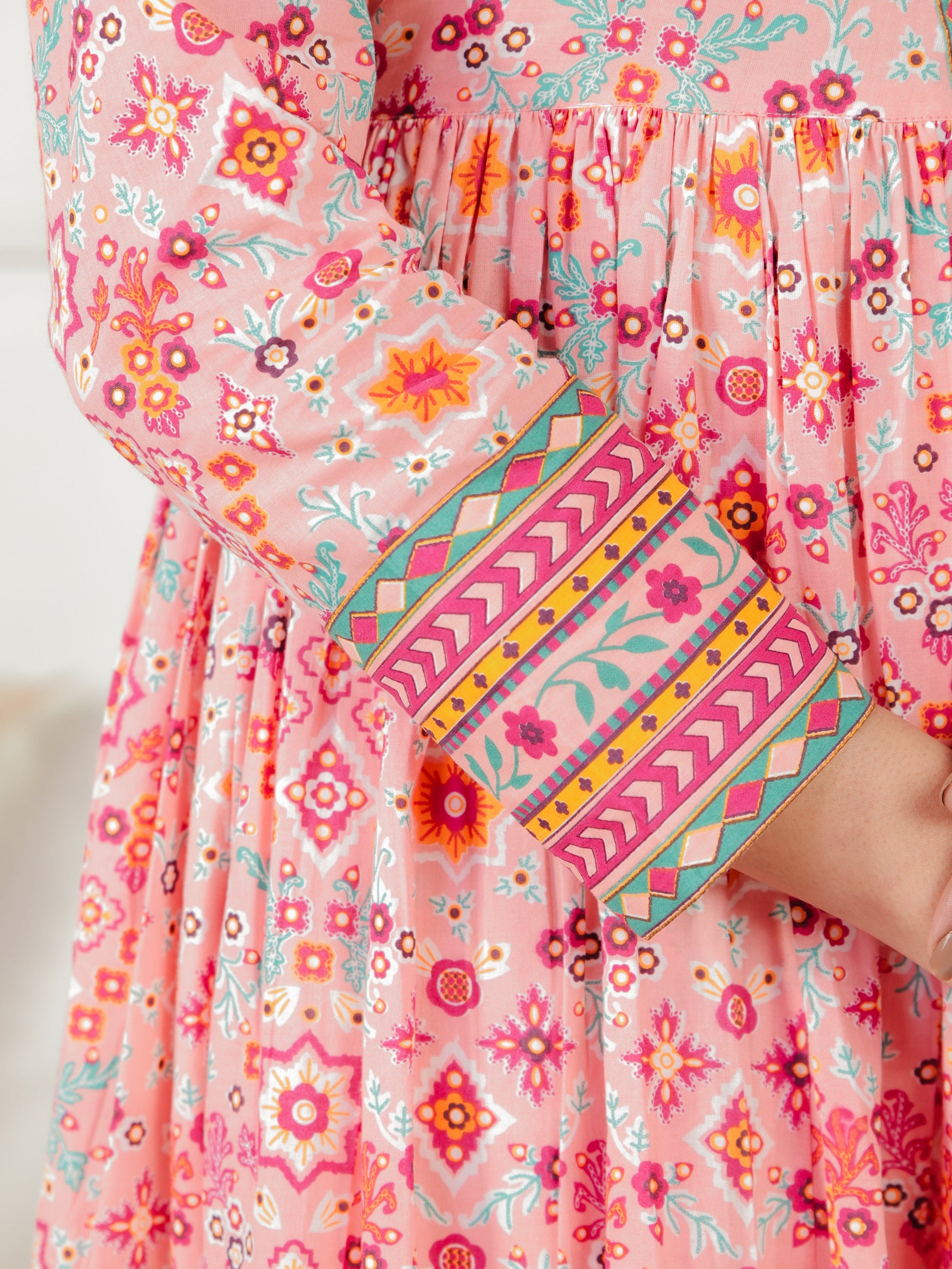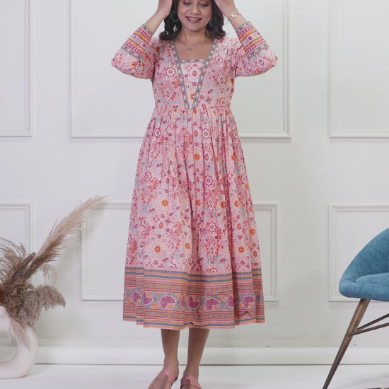 This Peach Anarkali dress in Soft Cotton is perfect for effortless daily wear. The Geometric pattern and delicate work bring a modern yet artisanal touch. Lightweight and breathable, it’s ideal for warm days or casual outings. Pair with sandals or sneakers for a relaxed vibe. Easy to care for ensures hassle-free upkeep.