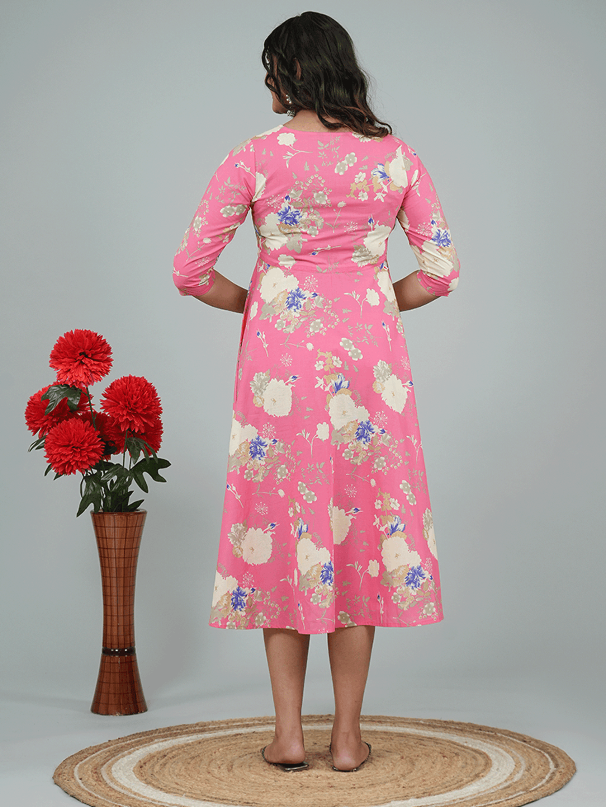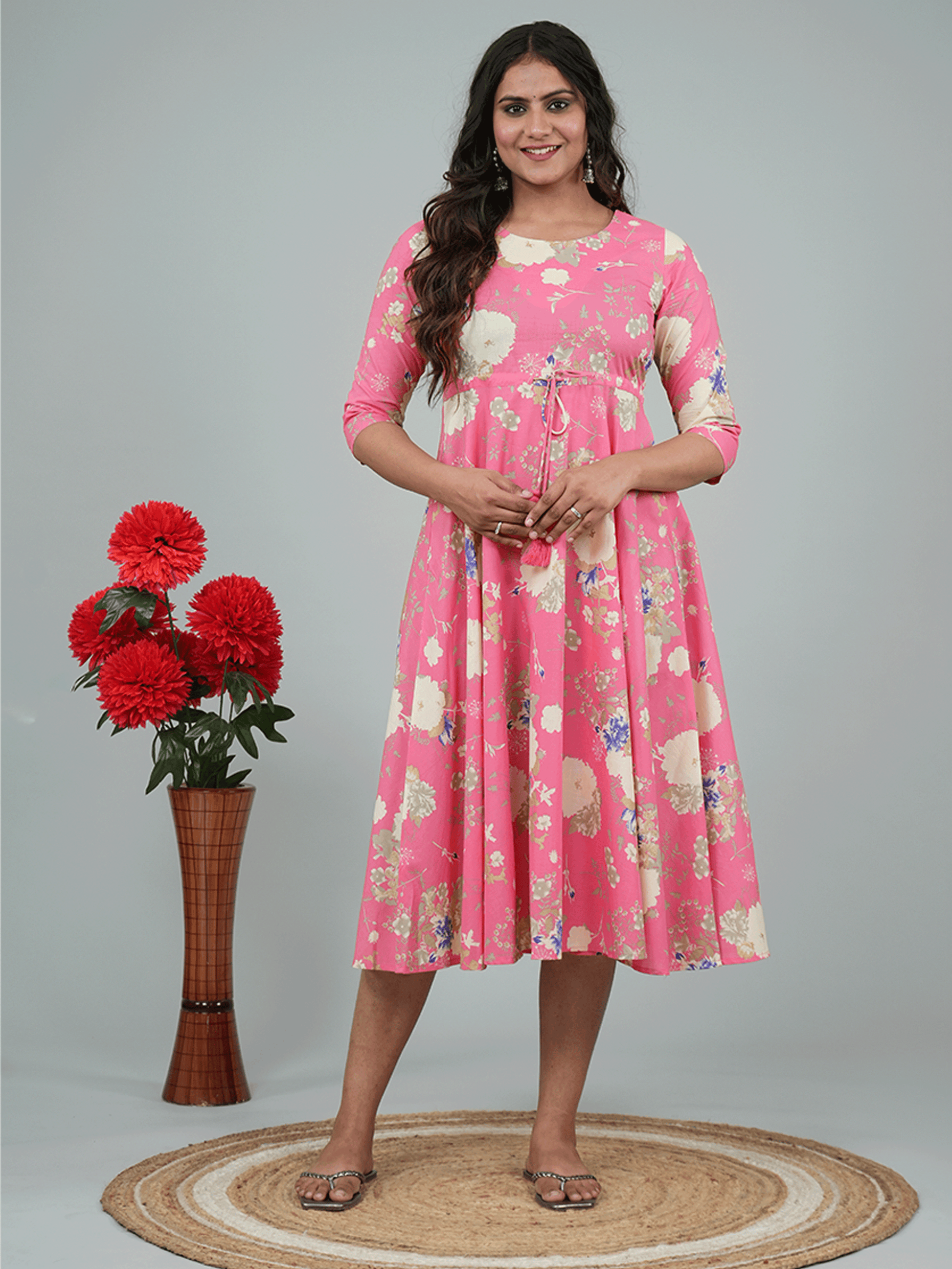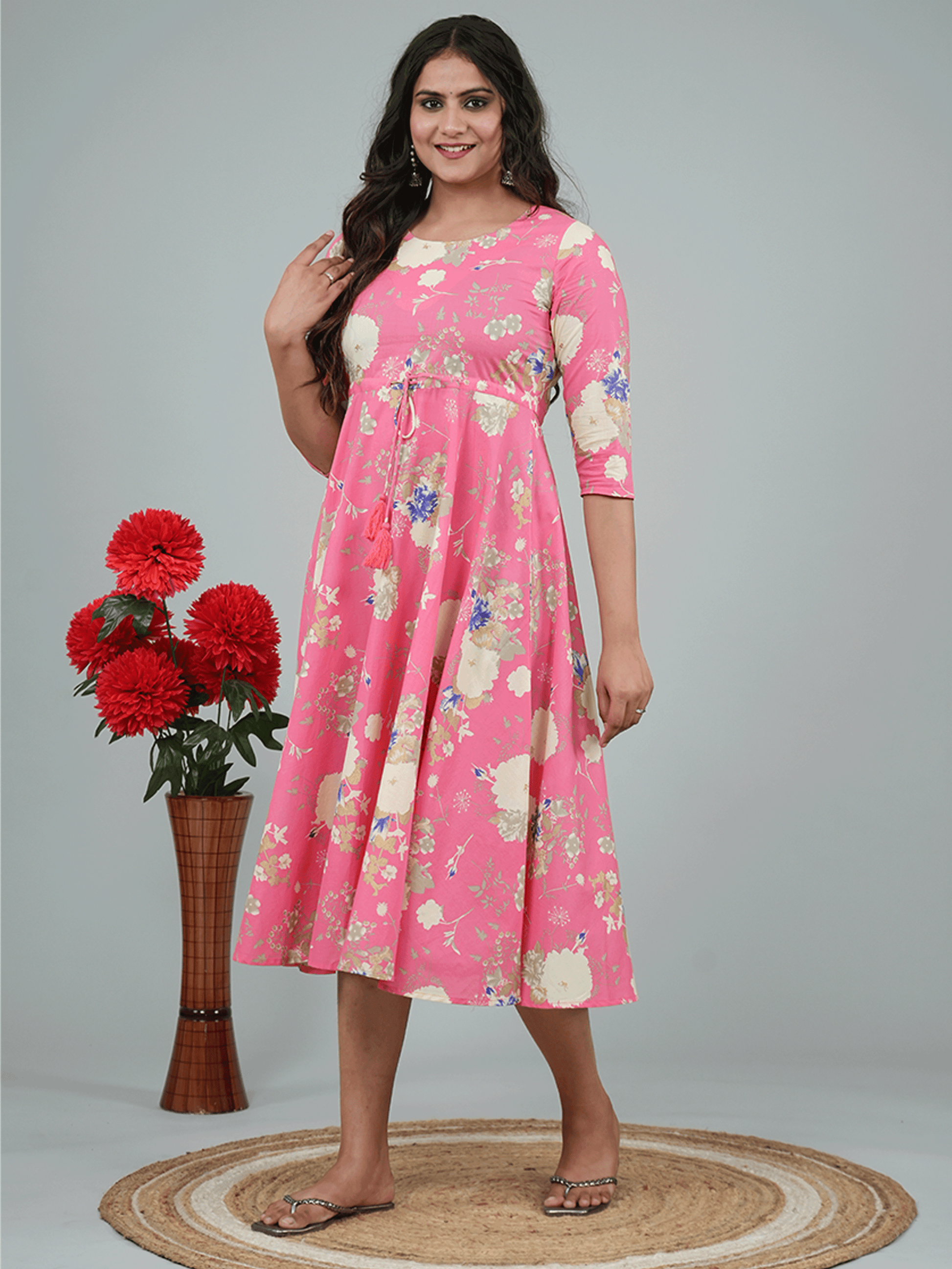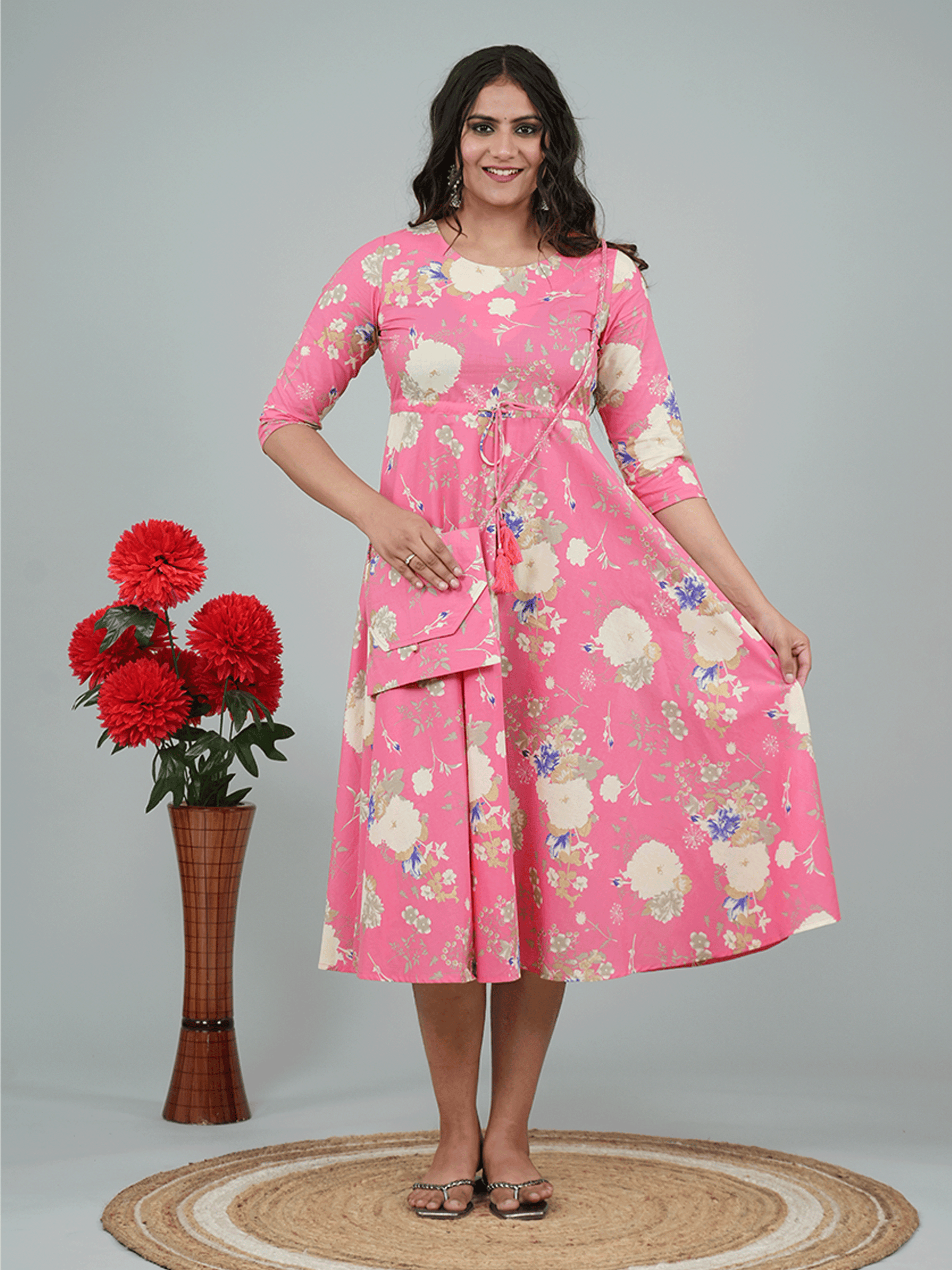 Designed for comfort and confidence, this Linen Cotton dress in Pink features a flattering Anarkali silhouette and unique Floral accents. The work detailing adds sophistication, making it perfect for coffee dates, casual evenings, or weekend brunches. Accessorise with minimal jewellery and flats for a polished finish.