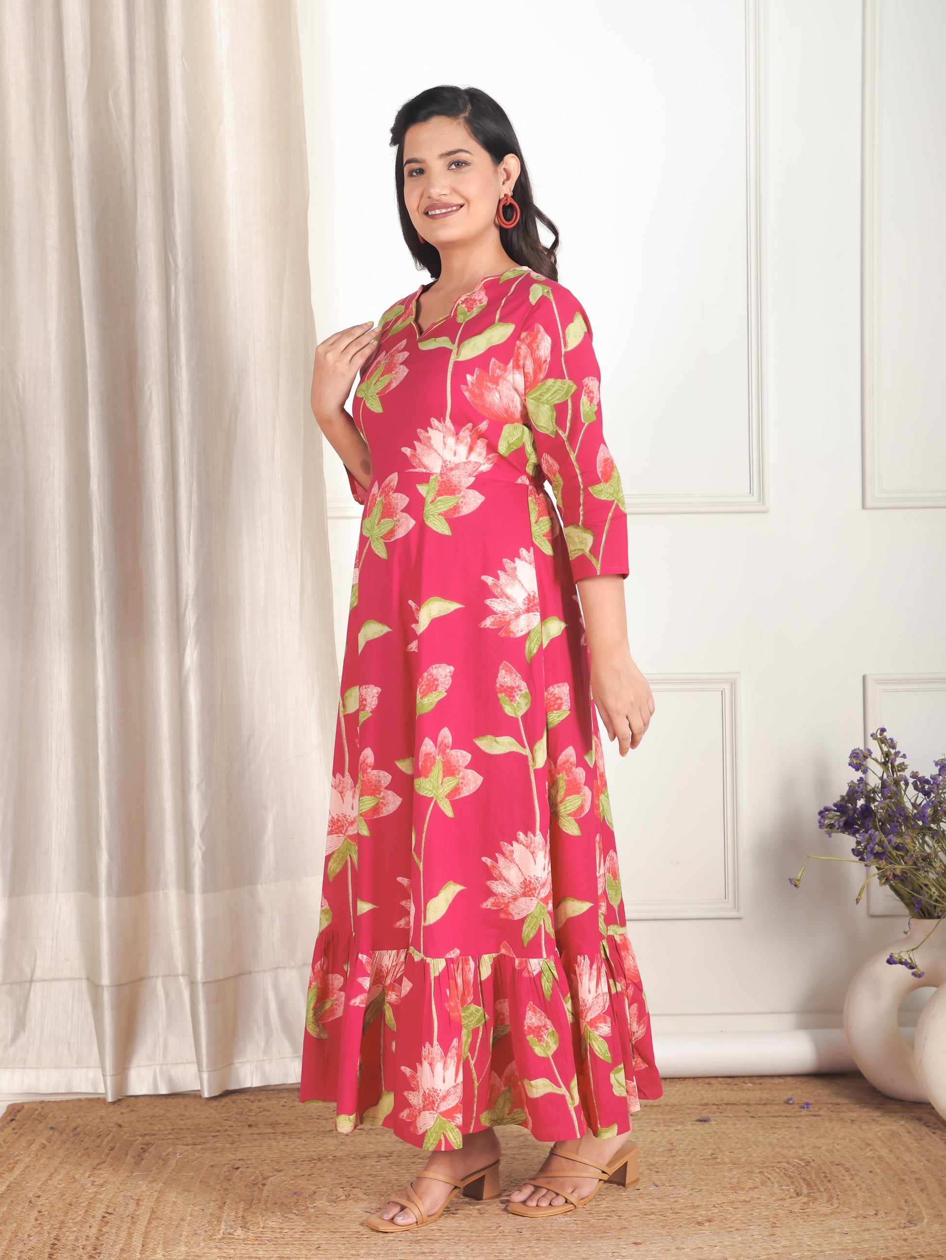 Designed for comfort and confidence, this Soft Cotton dress in Pink features a flattering Tiered silhouette and unique Floral accents. The work detailing adds sophistication, making it perfect for coffee dates, casual evenings, or weekend brunches. Accessorise with minimal jewellery and flats for a polished finish.